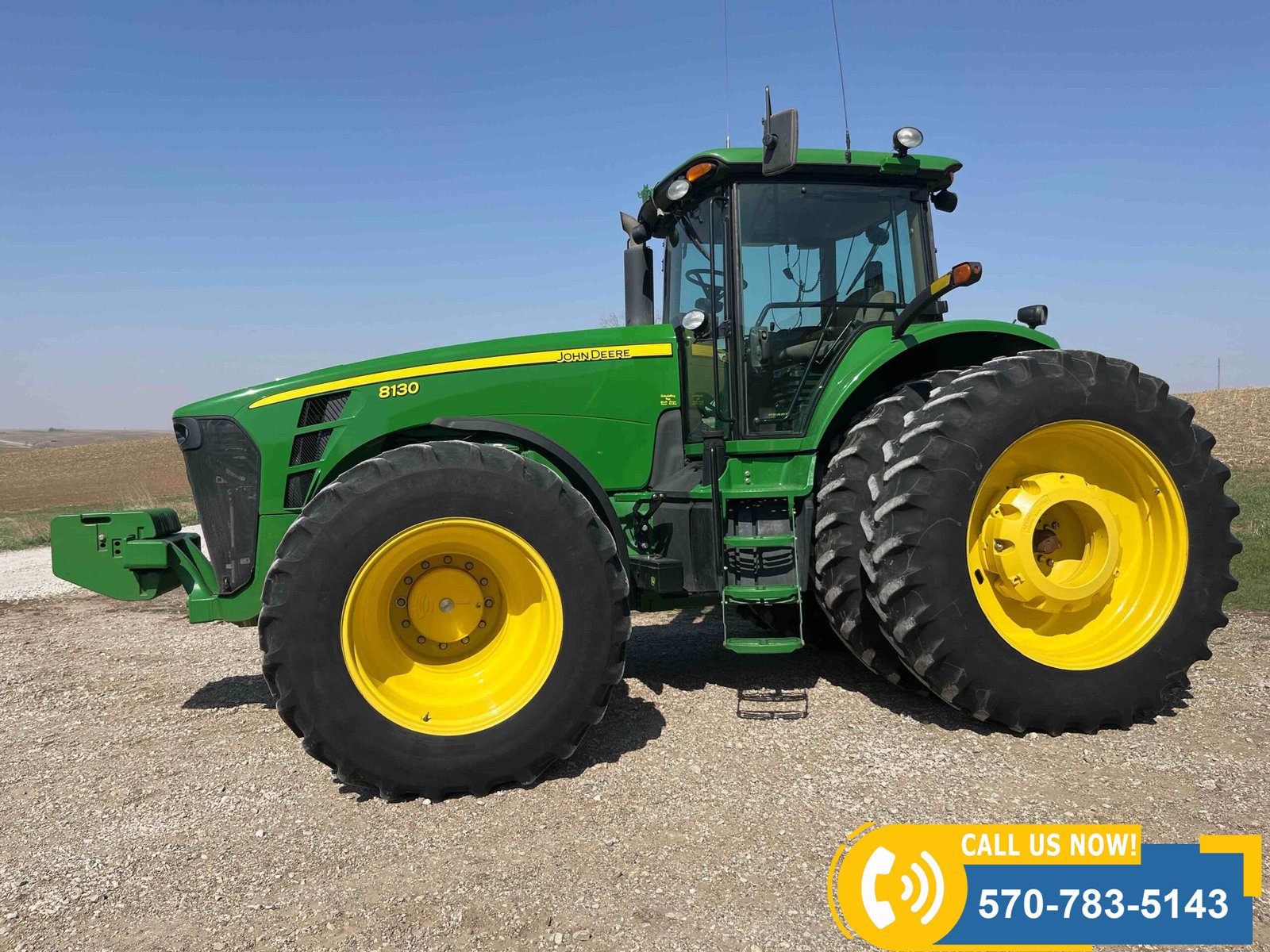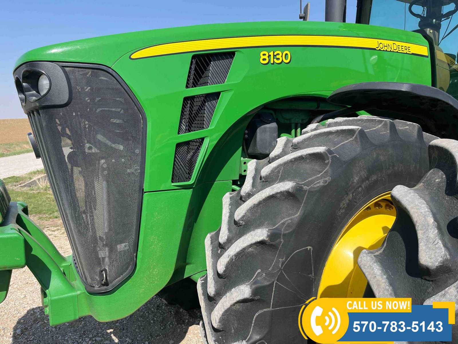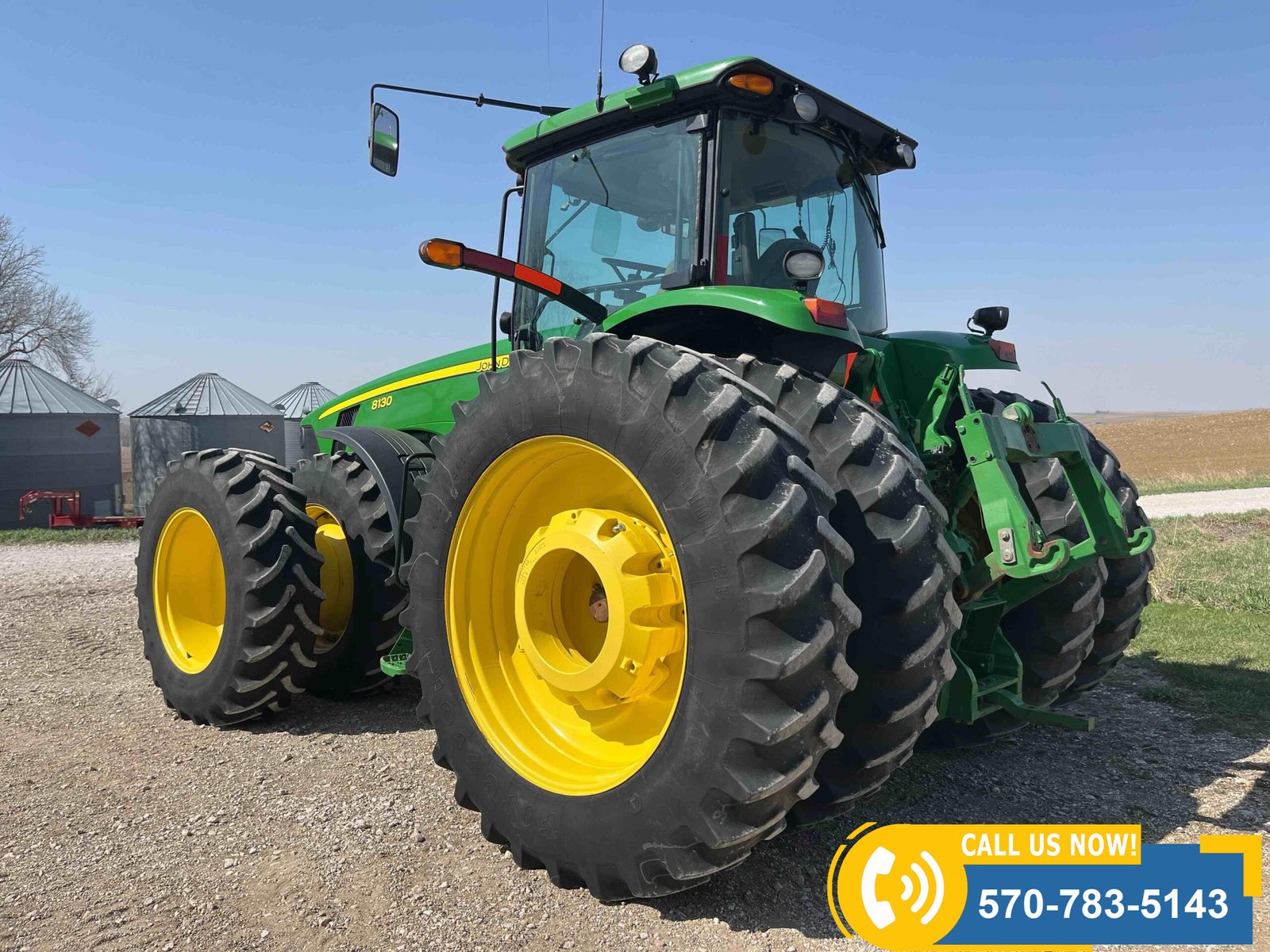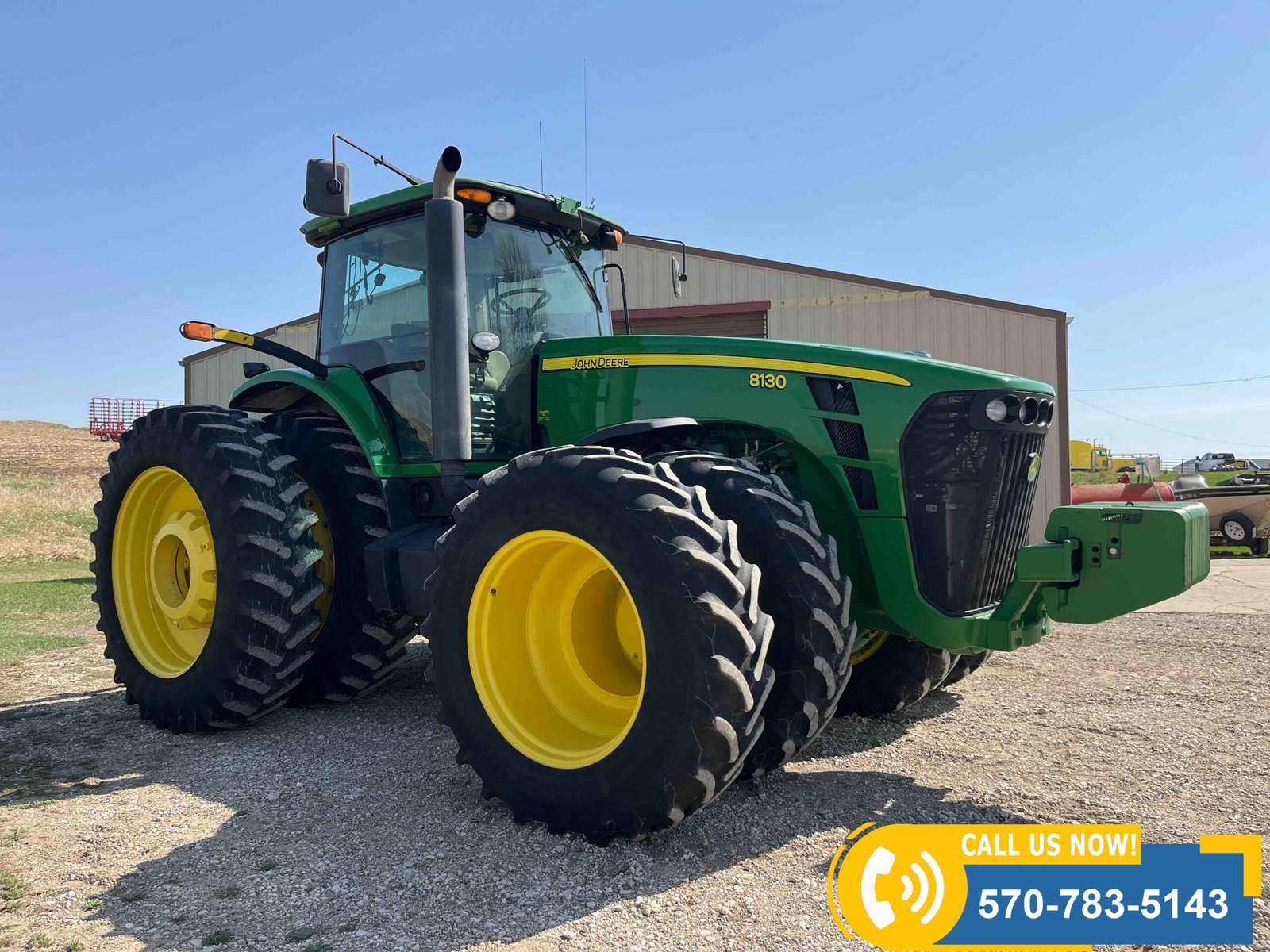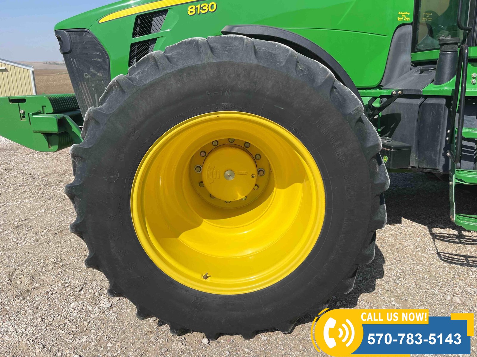 2009 John Deere 8130 MFWD Tractor – 5,789 hours showing, equipped with IVT transmission, ILS front suspension, and deluxe comfort package. Features 4 hydraulic outlets, 3-point hitch with quick hitch, 540/1000 PTO, front fenders, 16 front weights, and one pair of 450 lb rear axle weights. Rides on 420/85R34 front duals and 480/80R46 rear duals.