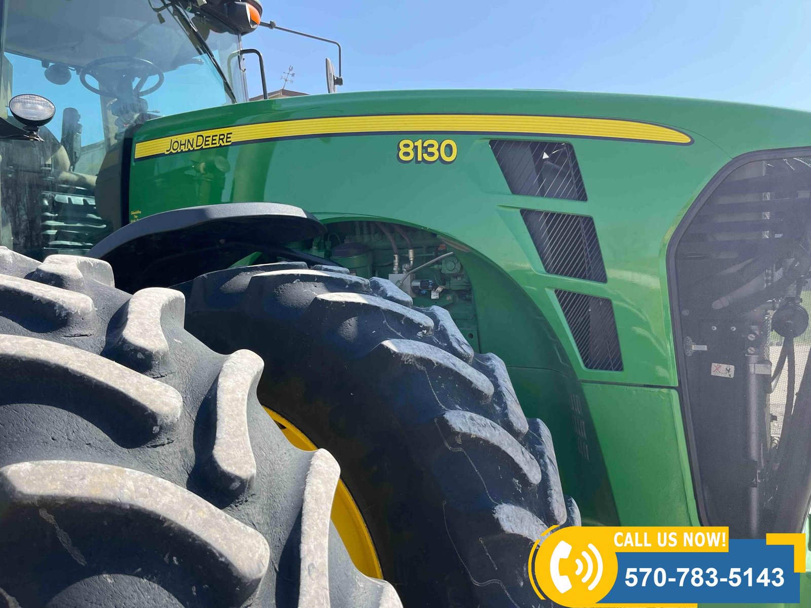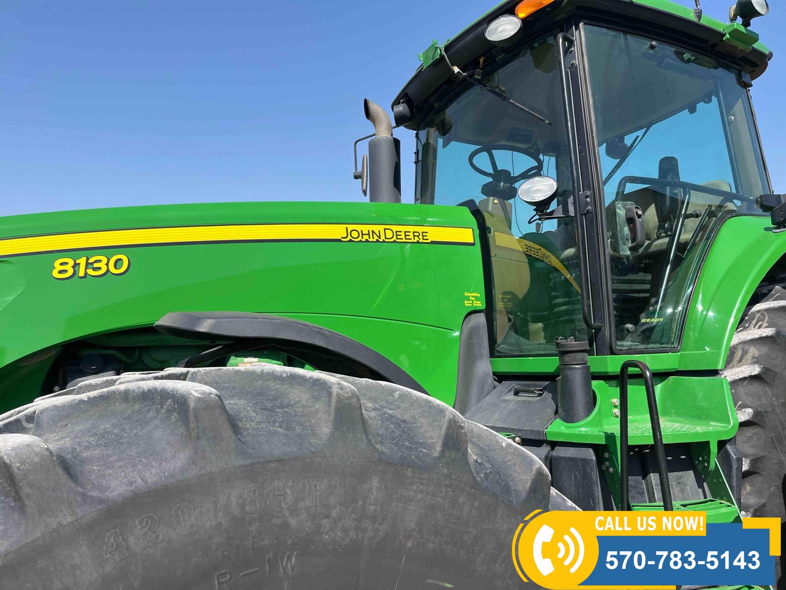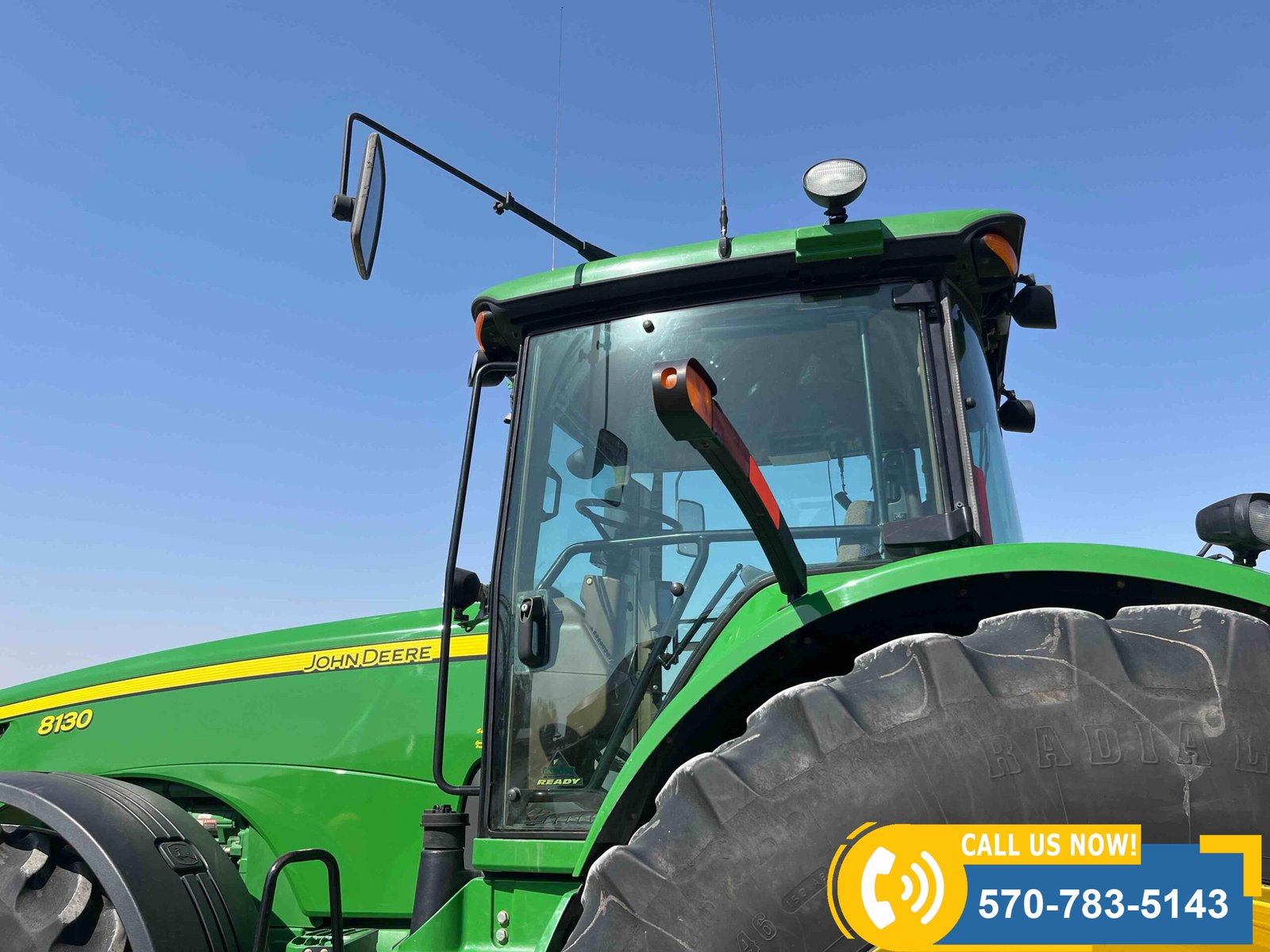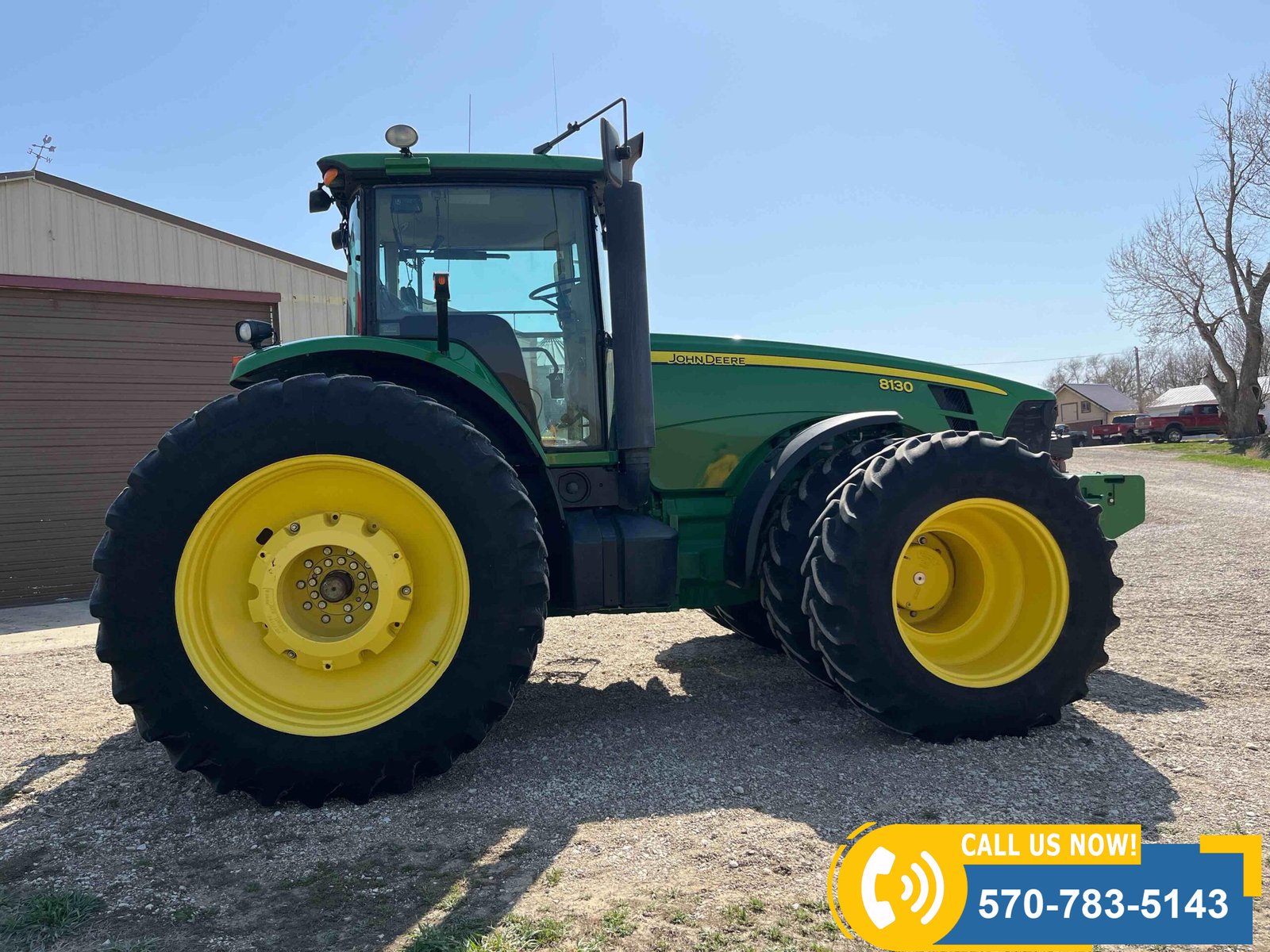 2009 John Deere 8130 MFWD Tractor – 5,789 hours showing, equipped with IVT transmission, ILS front suspension, and deluxe comfort package. Features 4 hydraulic outlets, 3-point hitch with quick hitch, 540/1000 PTO, front fenders, 16 front weights, and one pair of 450 lb rear axle weights. Rides on 420/85R34 front duals and 480/80R46 rear duals.