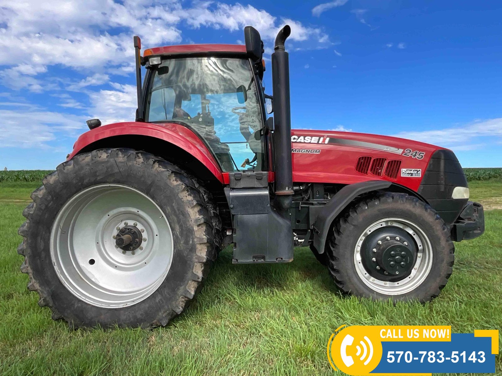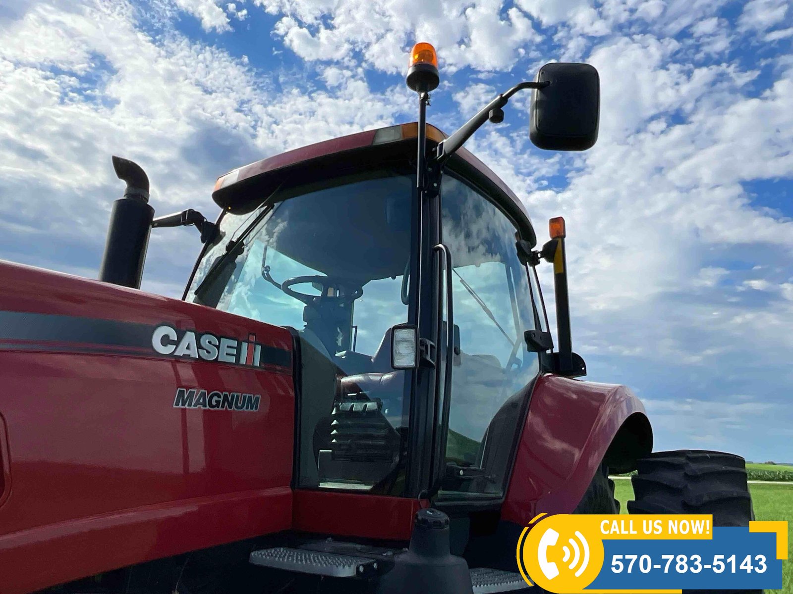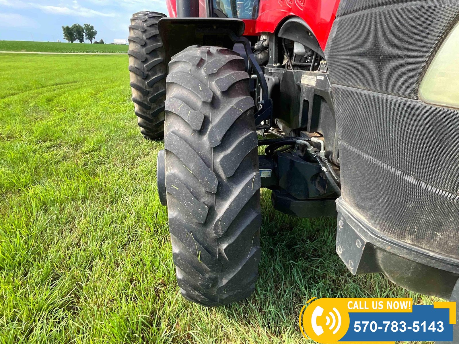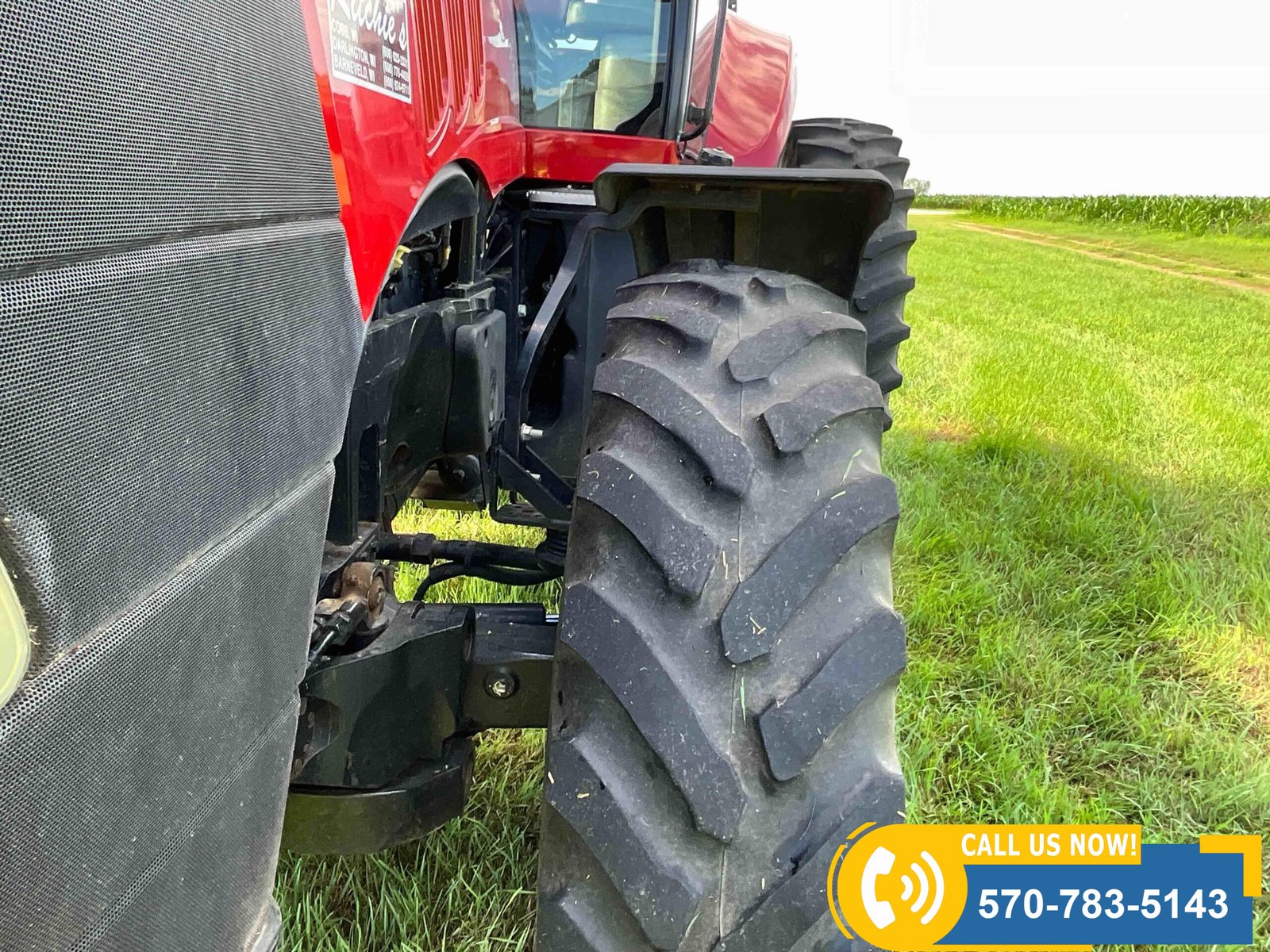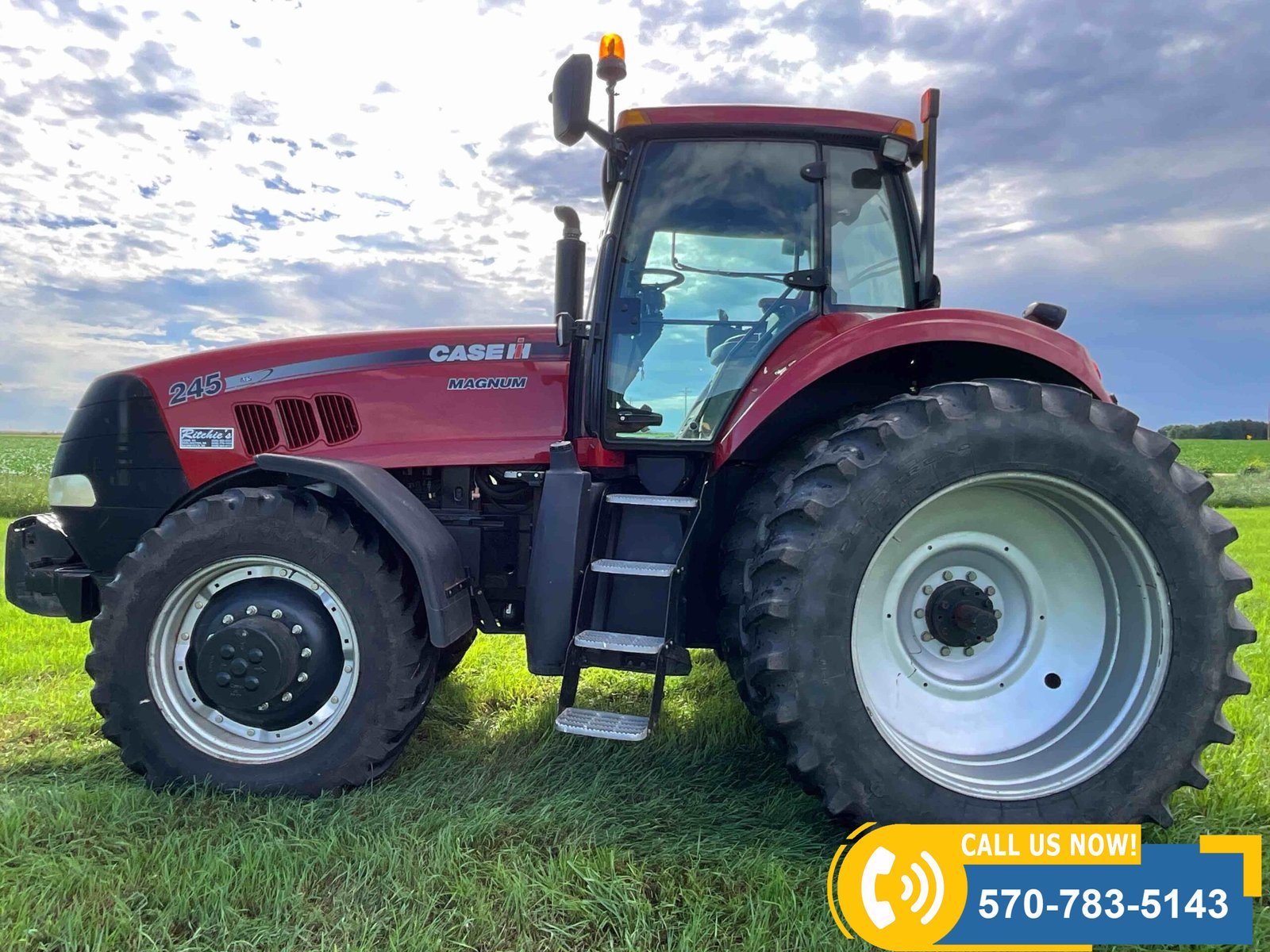 2010 Case IH Magnum 245 MFWD Tractor – 3,260 hours showing, 245 HP CNH 8.3L engine with block heater and 19-speed powershift (19F/4R). Equipped with large 1000 PTO, rear PTO with fender control, 4 hydraulic outlets, power beyond valve, and 3-point hitch with quick hitch. Features deluxe leather seat, ISOBUS compatibility, front fenders, and (6) 100 lb front weights. Rides on 380/85R34 front tires and 18.4R46 rear duals.