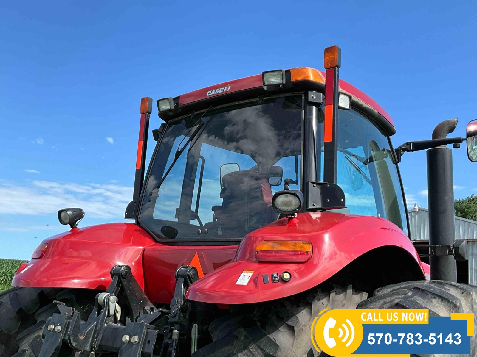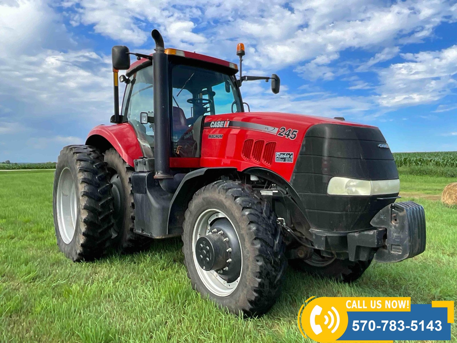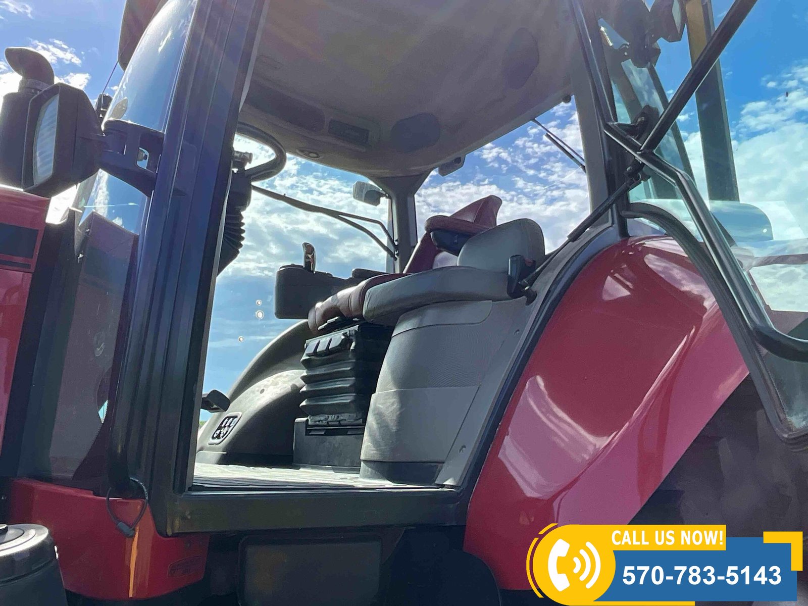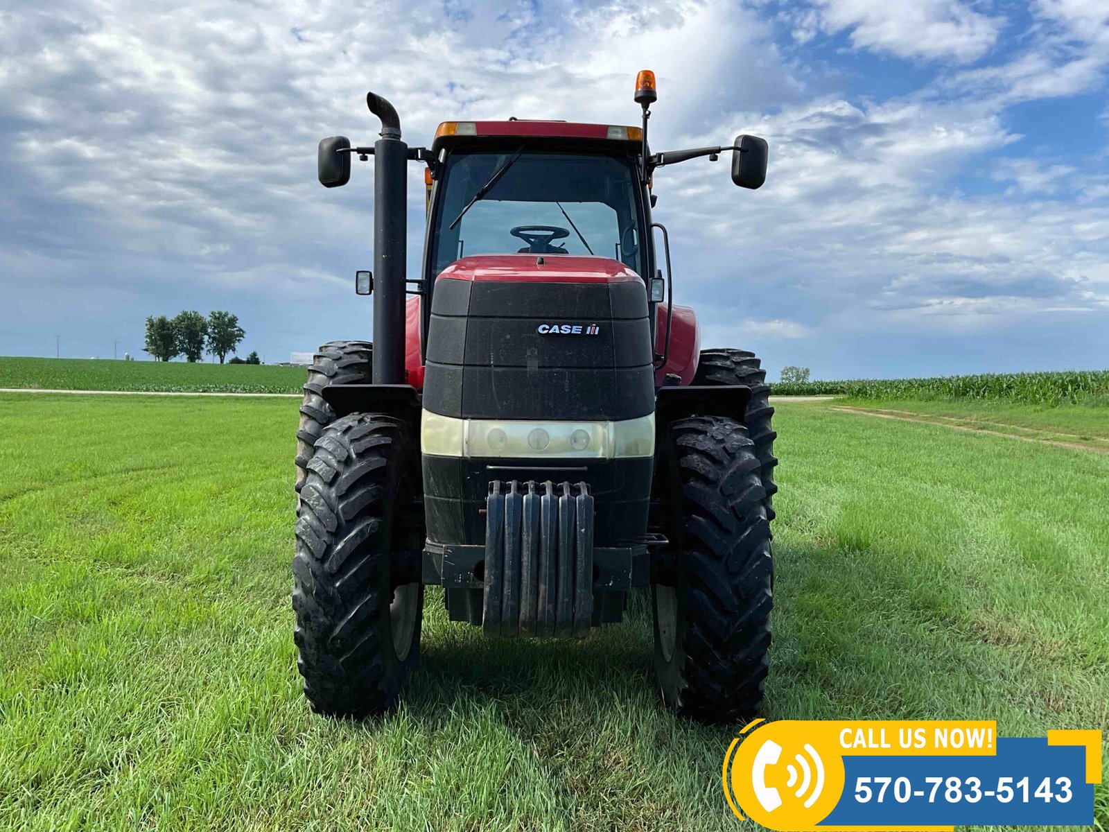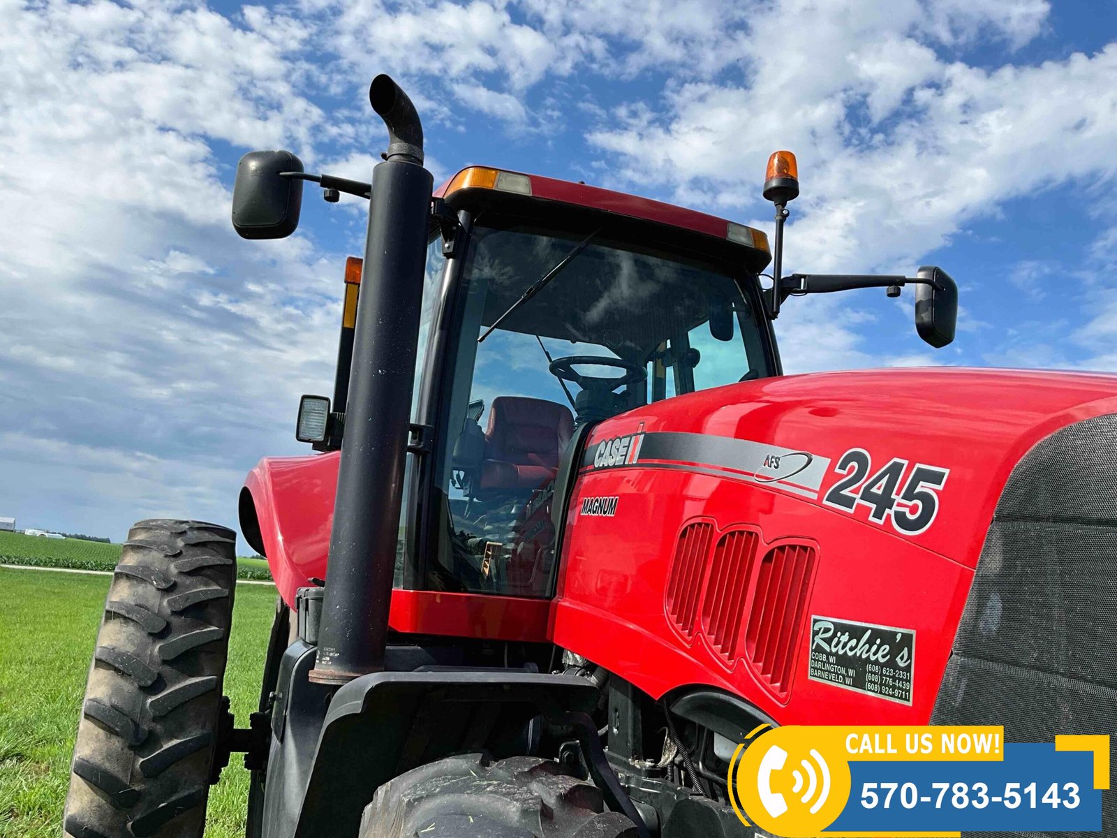 2010 Case IH Magnum 245 MFWD Tractor – 3,260 hours showing, 245 HP CNH 8.3L engine with block heater and 19-speed powershift (19F/4R). Equipped with large 1000 PTO, rear PTO with fender control, 4 hydraulic outlets, power beyond valve, and 3-point hitch with quick hitch. Features deluxe leather seat, ISOBUS compatibility, front fenders, and (6) 100 lb front weights. Rides on 380/85R34 front tires and 18.4R46 rear duals.