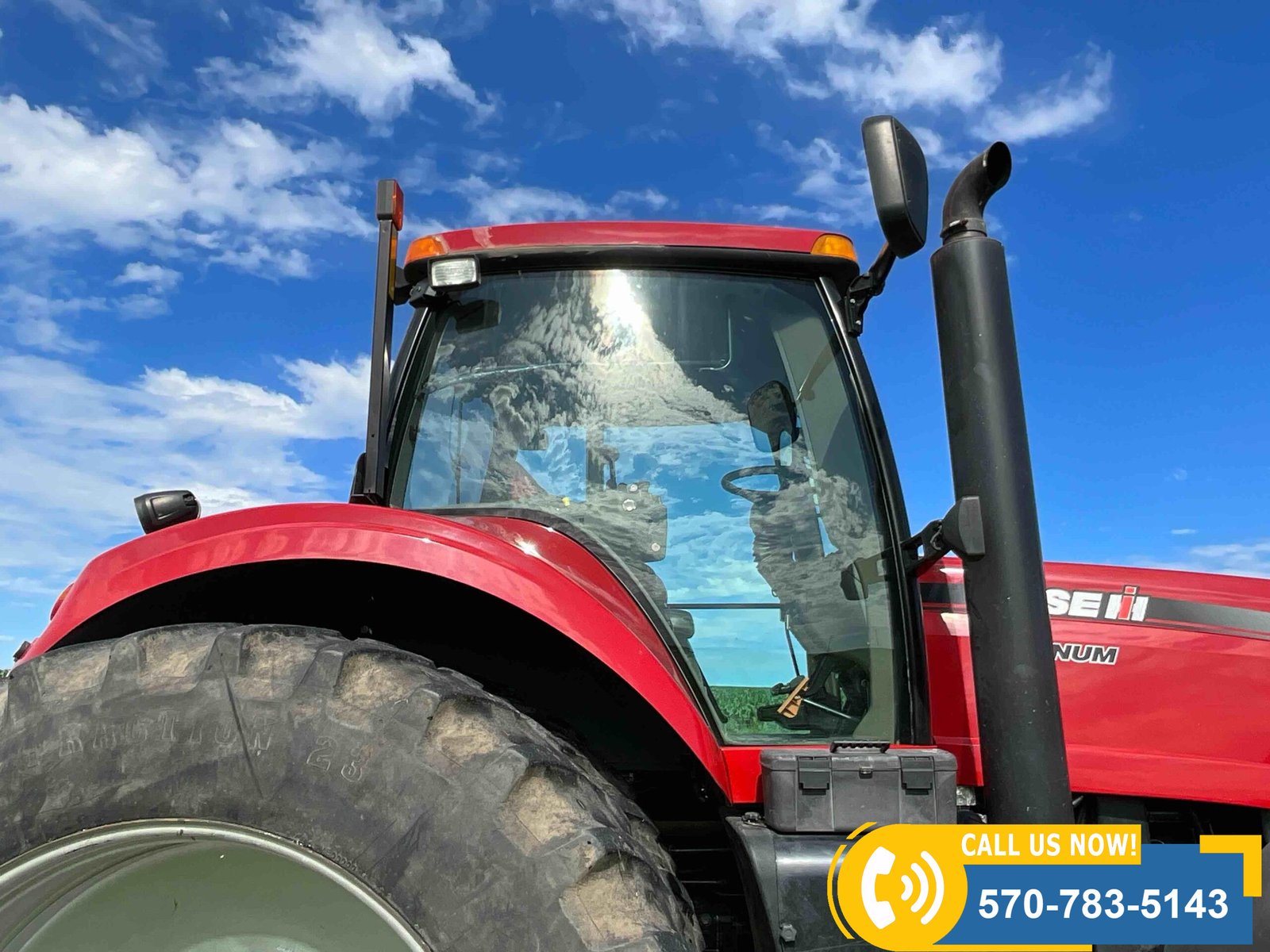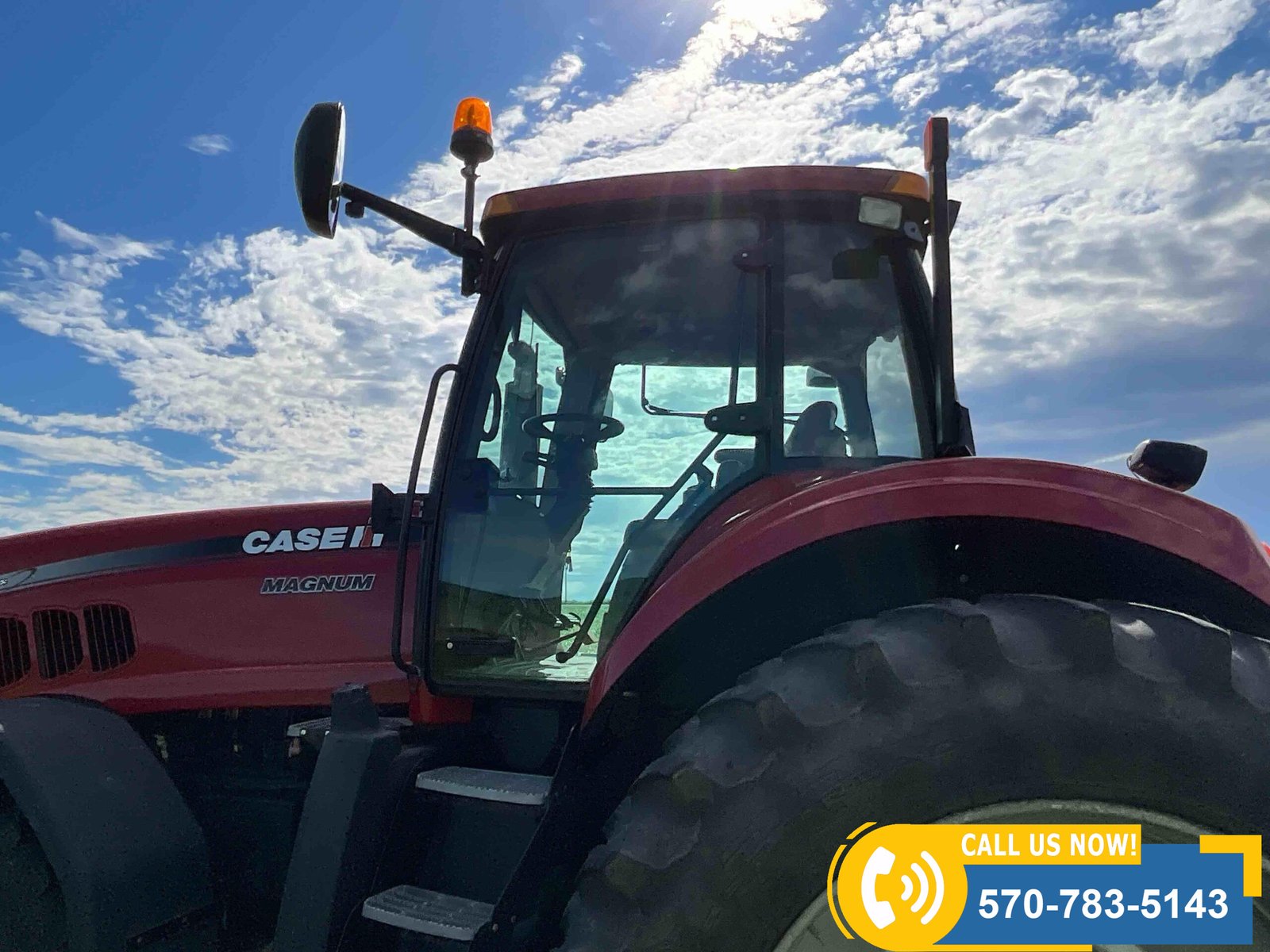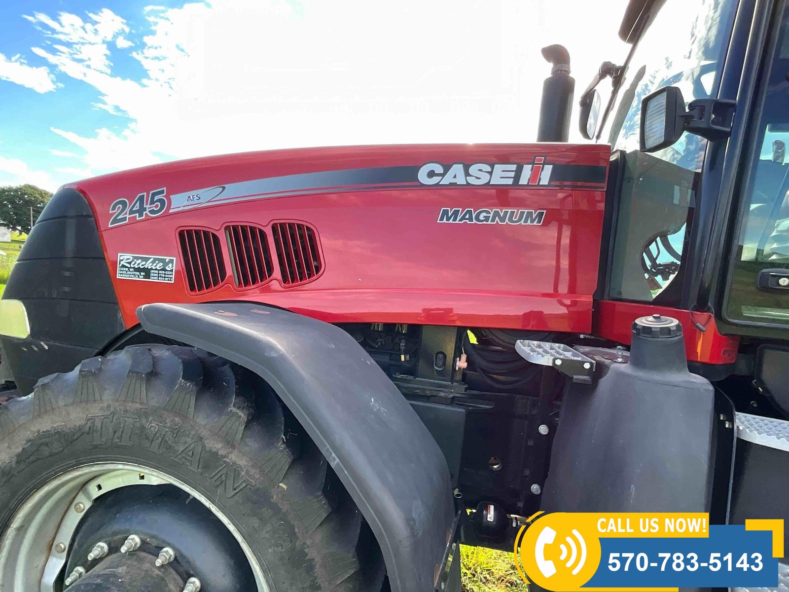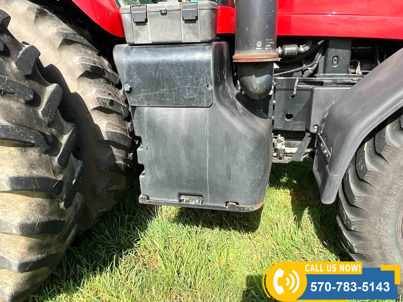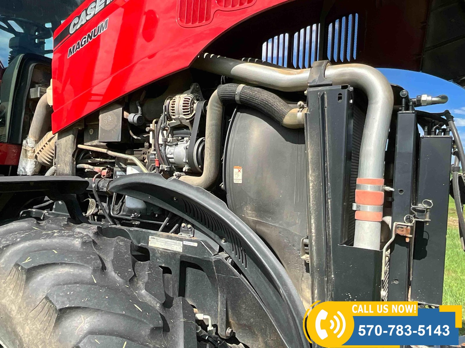 2010 Case IH Magnum 245 MFWD Tractor – 3,260 hours showing, 245 HP CNH 8.3L engine with block heater and 19-speed powershift (19F/4R). Equipped with large 1000 PTO, rear PTO with fender control, 4 hydraulic outlets, power beyond valve, and 3-point hitch with quick hitch. Features deluxe leather seat, ISOBUS compatibility, front fenders, and (6) 100 lb front weights. Rides on 380/85R34 front tires and 18.4R46 rear duals.