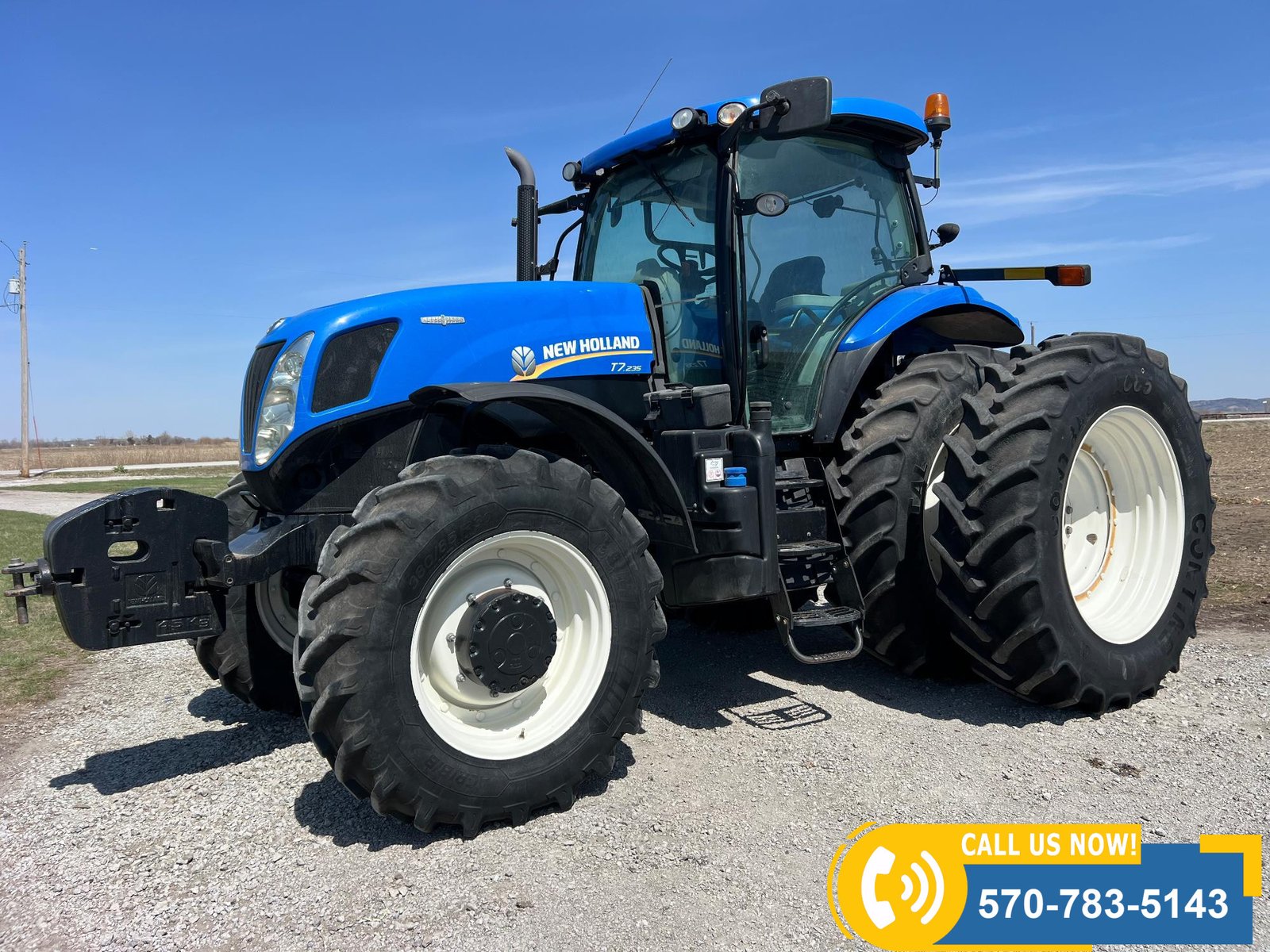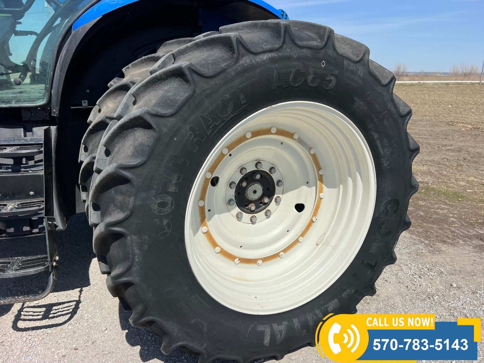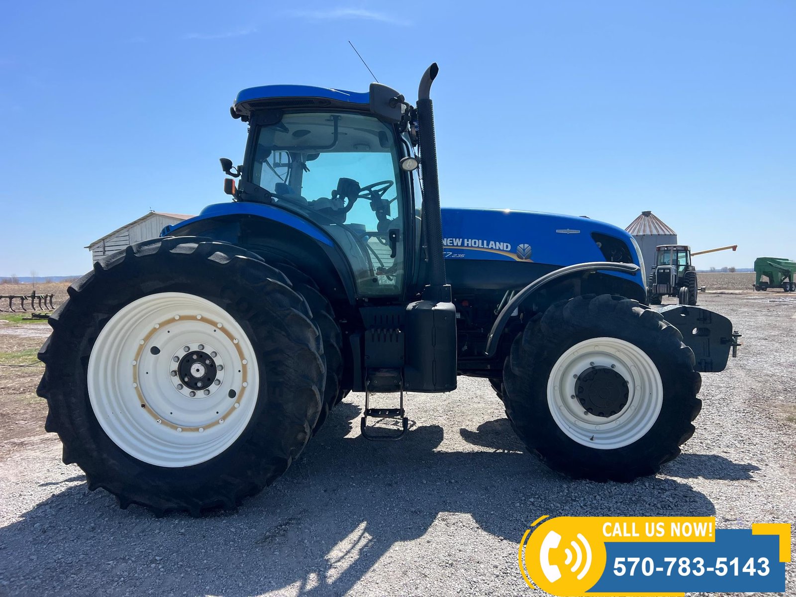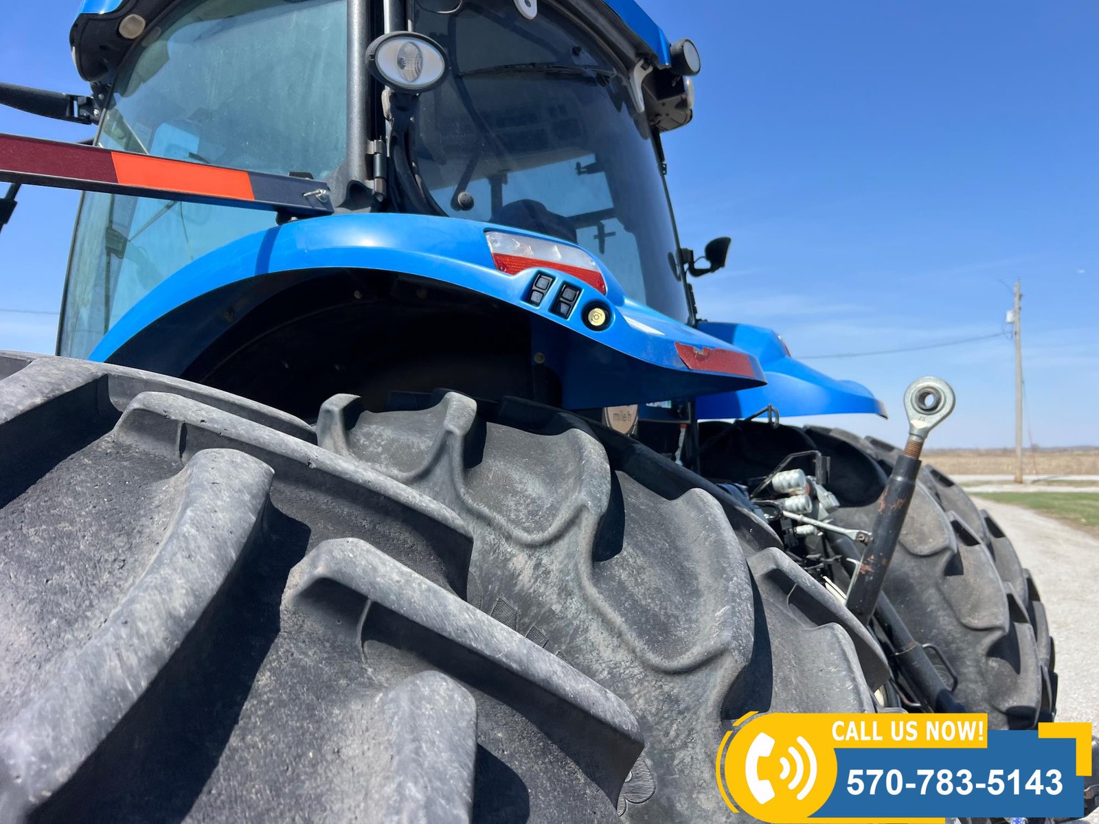 2013 New Holland T7.235 MFWD Tractor – 1,801 hours showing, powered by an FPT 6.7L 6-cylinder diesel engine with AutoCommand CVT transmission. Equipped with 3-point hitch, small 1000 PTO, monitor on armrest, 4 hydraulic outlets, and 10 front weights. Rides on 380/85R30 front tires and 480/80R42 rear duals.