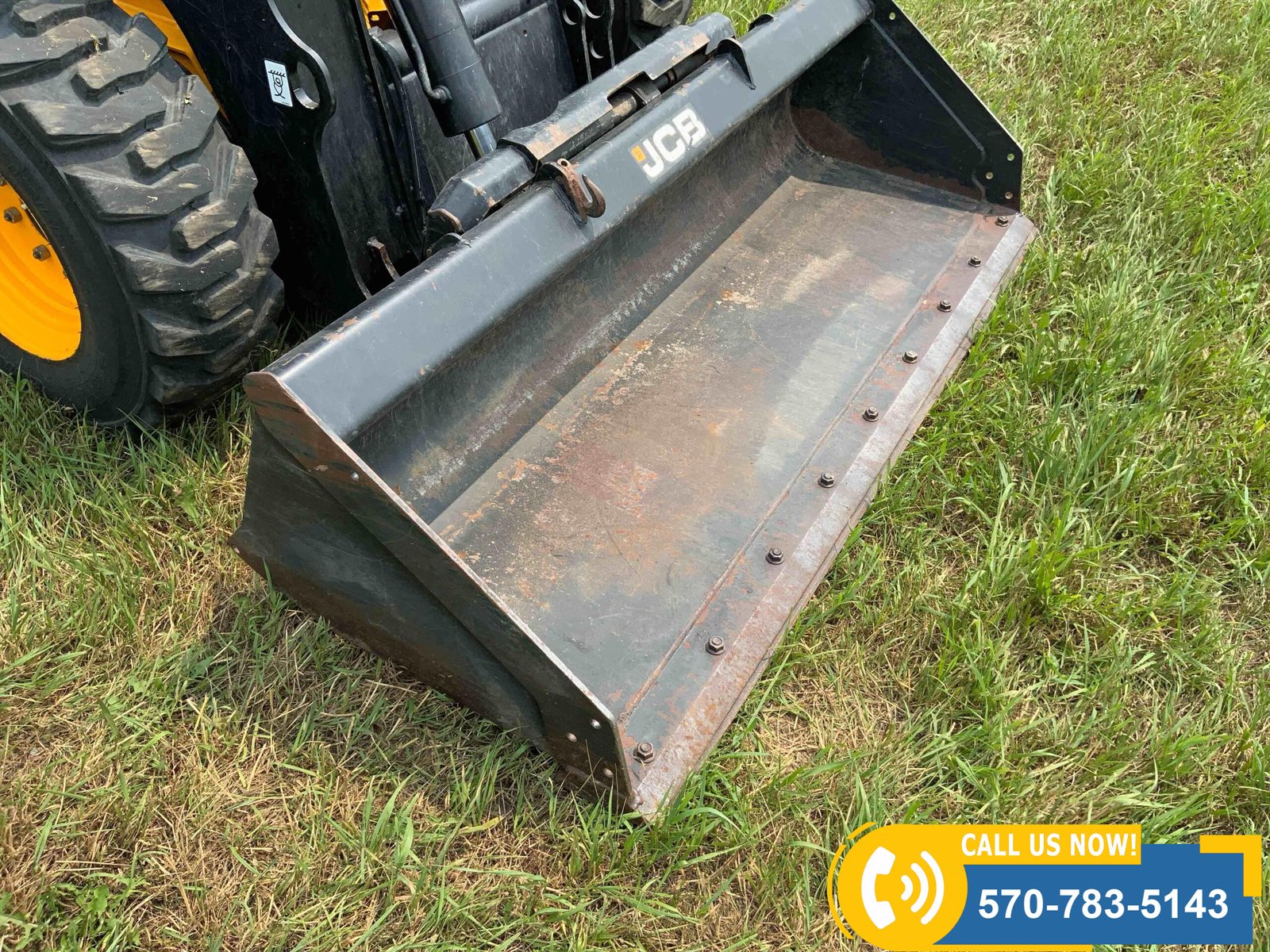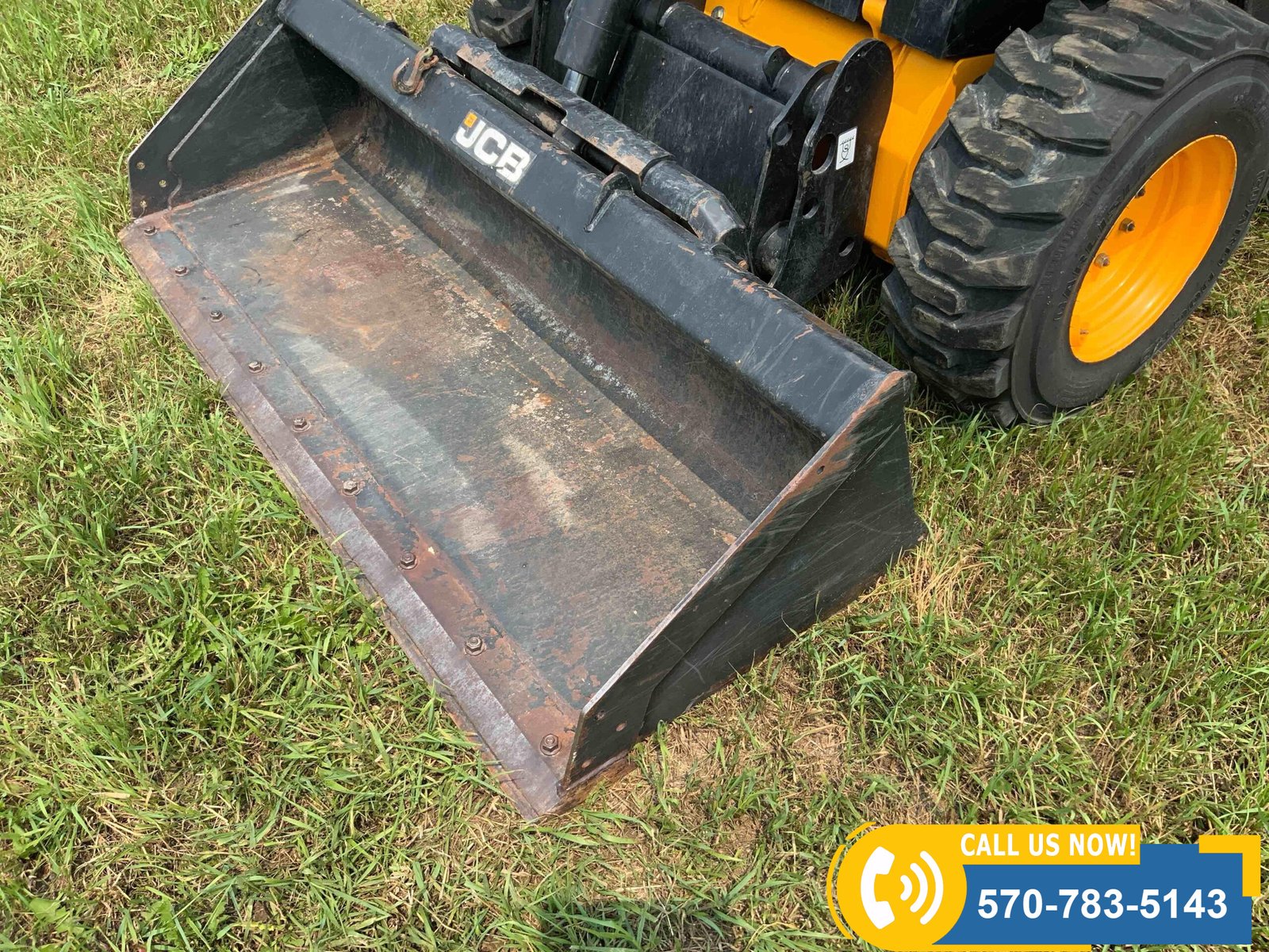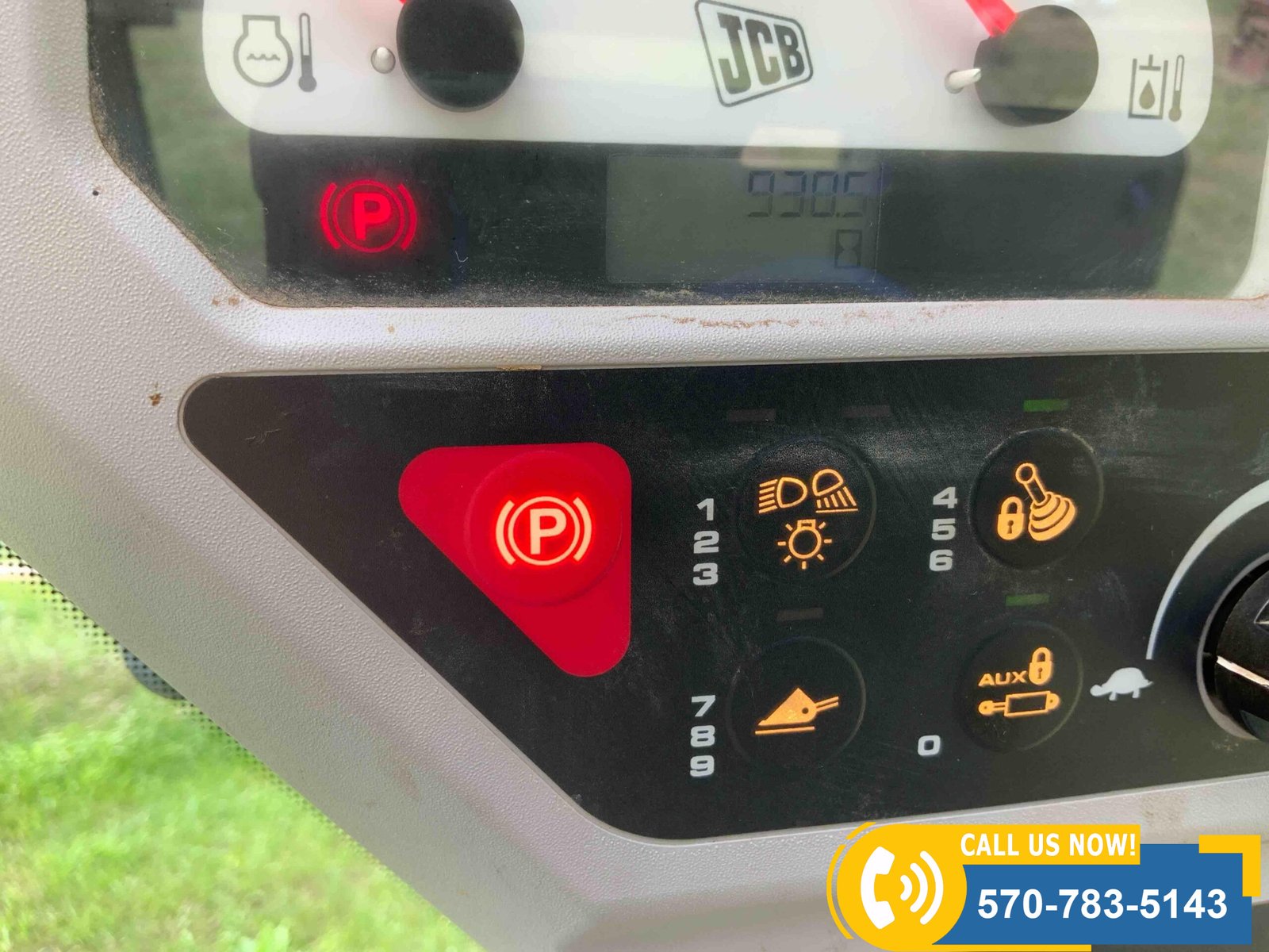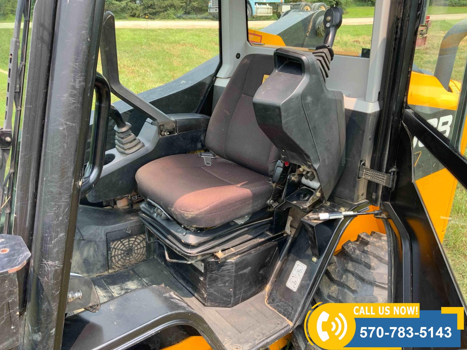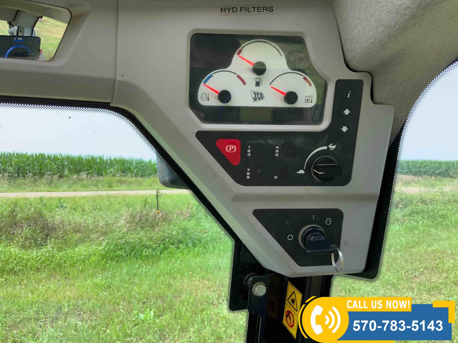 Clean machine with 938.5 hours showing. Powered by a 4-cylinder turbo diesel engine and hydrostatic transmission. Features include JCB 7-way controls (ISO & H pattern), high-flow hydraulics, 78” bucket with bolt-on cutting edge (BOCE), reversing fan, parallel lift, smooth ride, and 110V engine block heater. Comfortable enclosed cab with air suspension seat, A/C, heat, radio, and foot throttle. Rides on 12-16.5 tires.