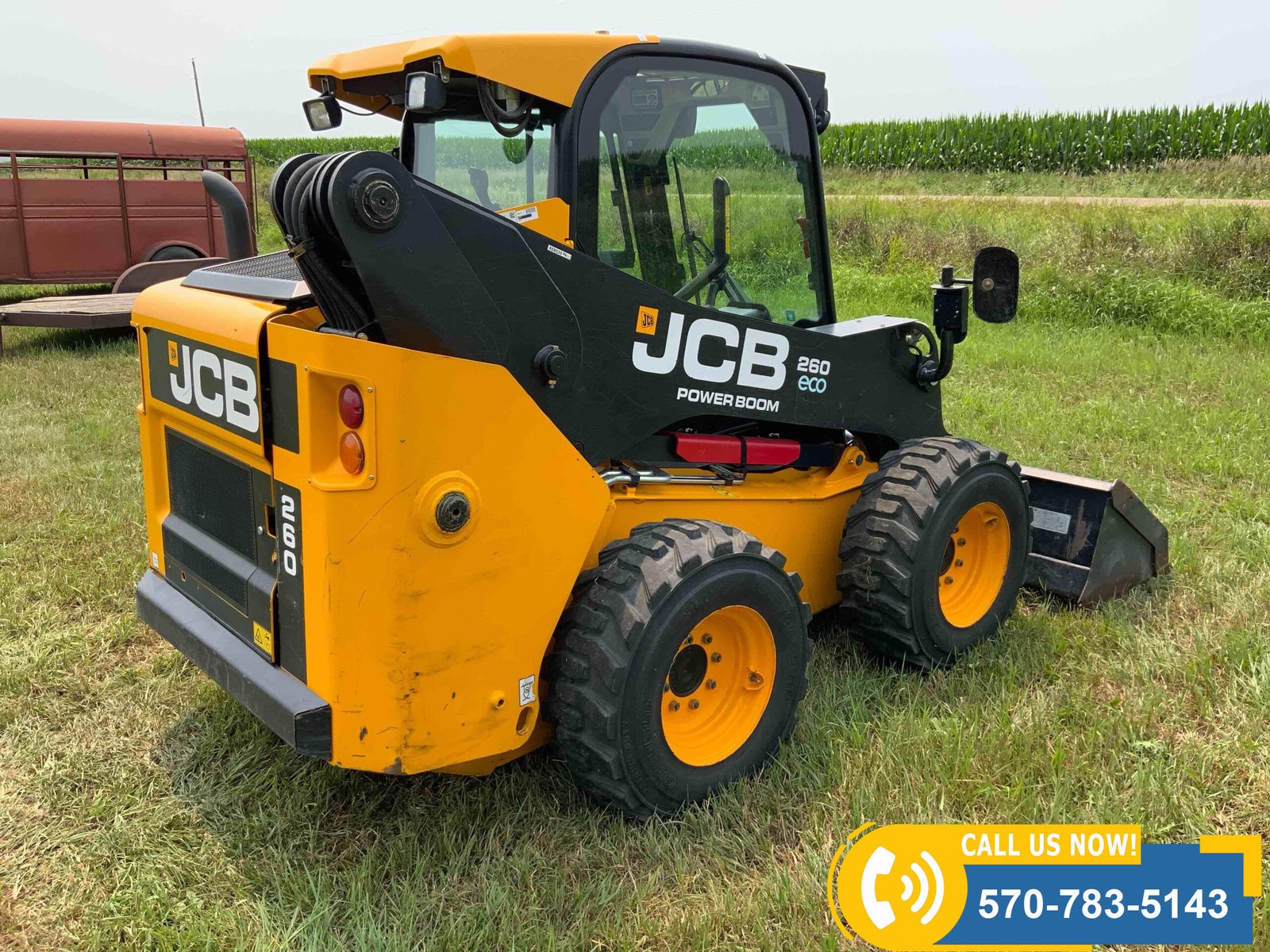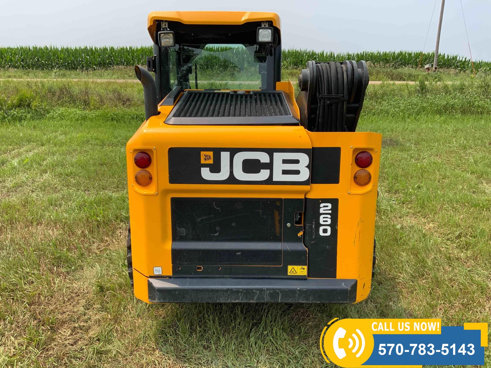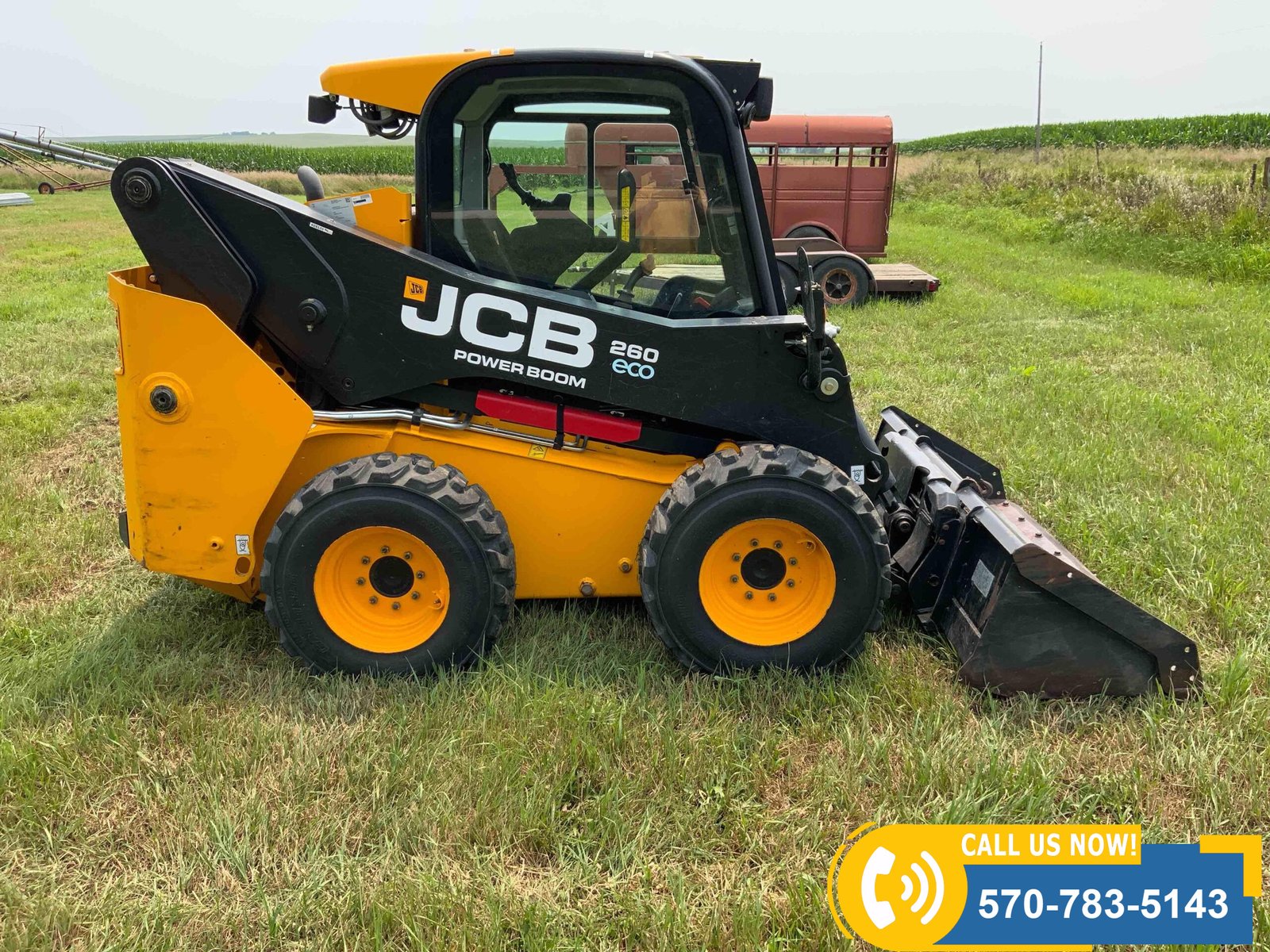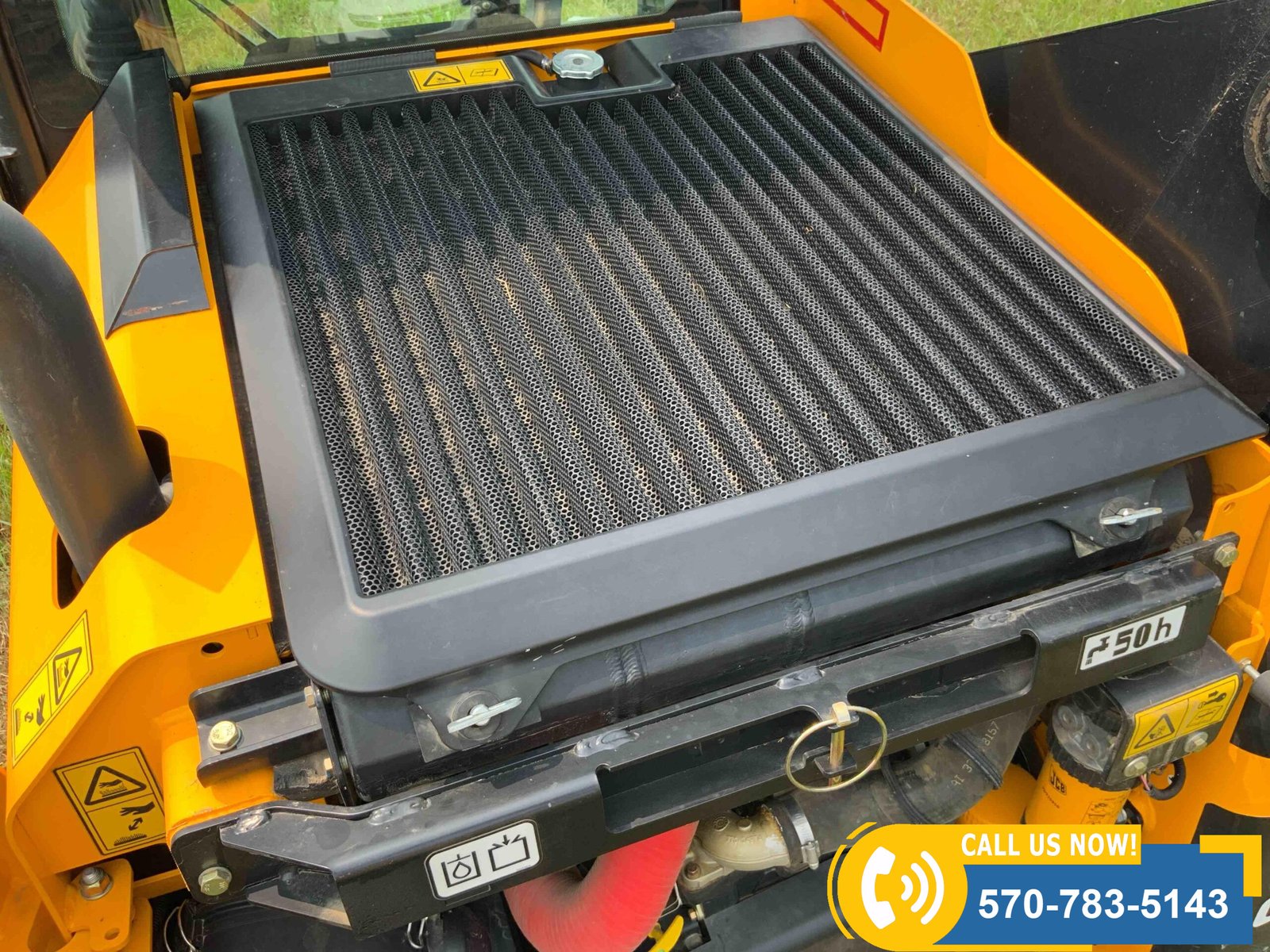 Clean machine with 938.5 hours showing. Powered by a 4-cylinder turbo diesel engine and hydrostatic transmission. Features include JCB 7-way controls (ISO & H pattern), high-flow hydraulics, 78” bucket with bolt-on cutting edge (BOCE), reversing fan, parallel lift, smooth ride, and 110V engine block heater. Comfortable enclosed cab with air suspension seat, A/C, heat, radio, and foot throttle. Rides on 12-16.5 tires.