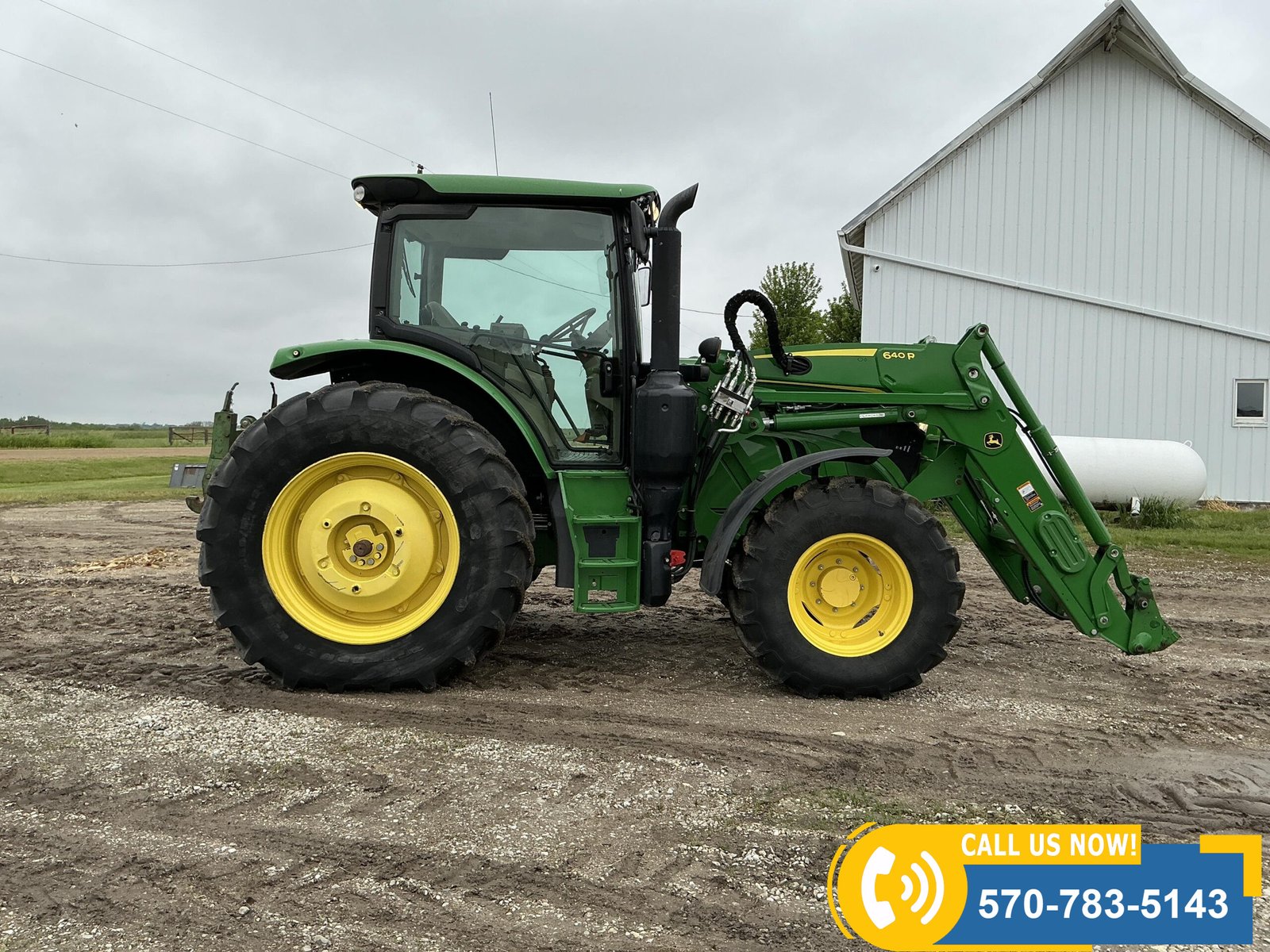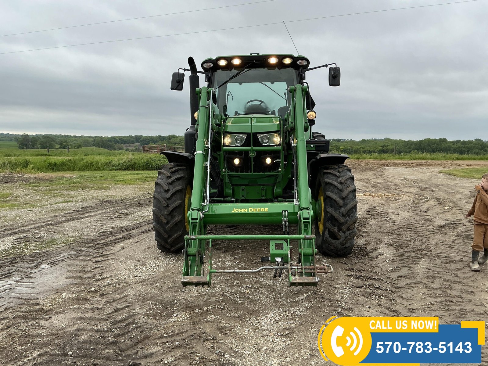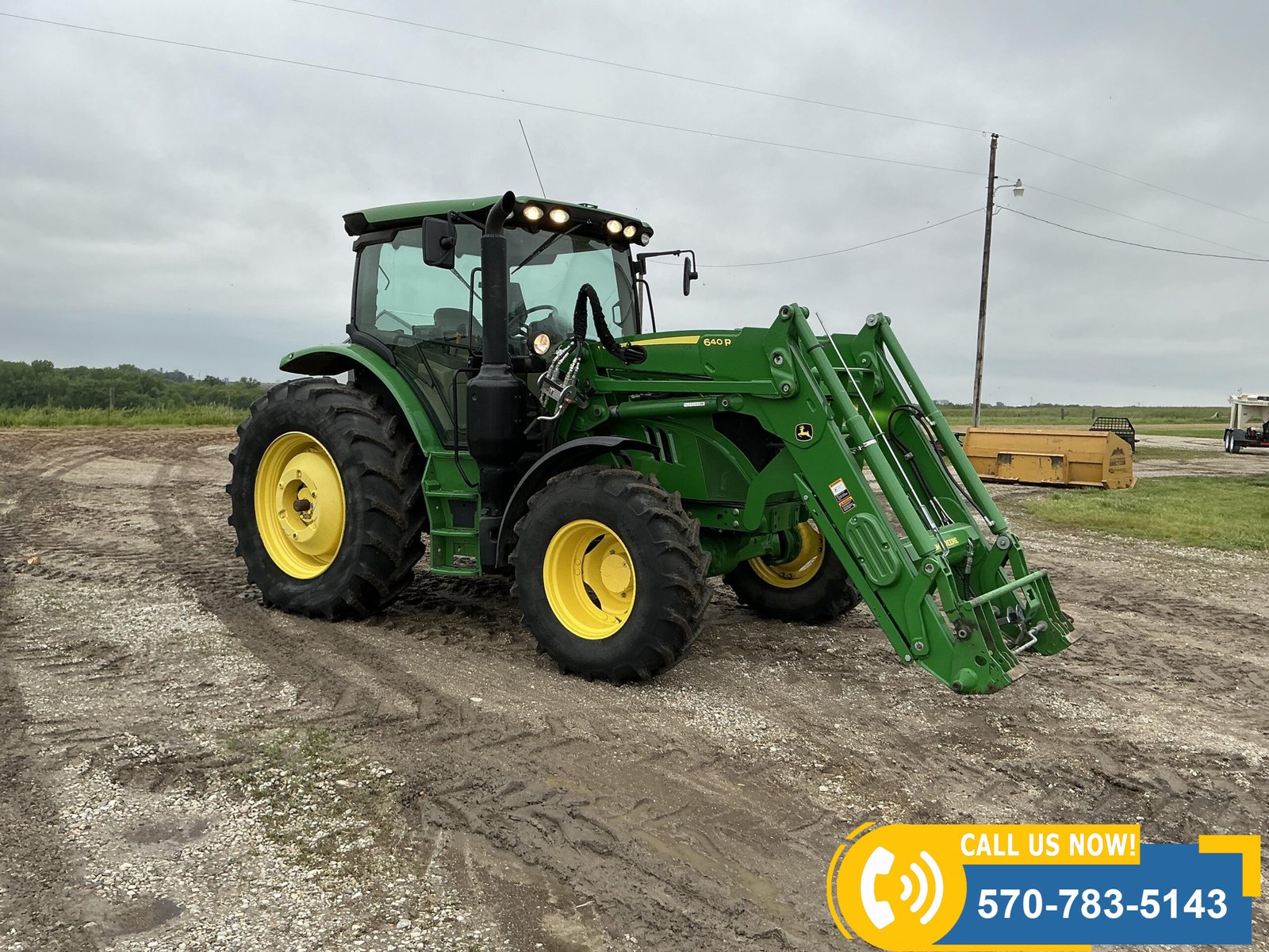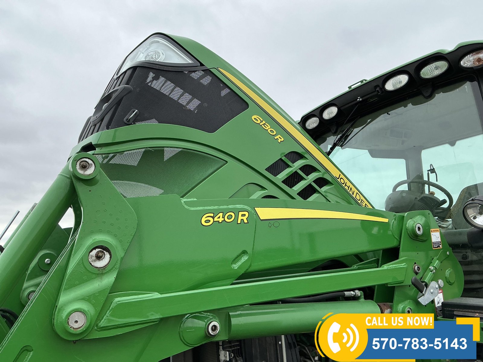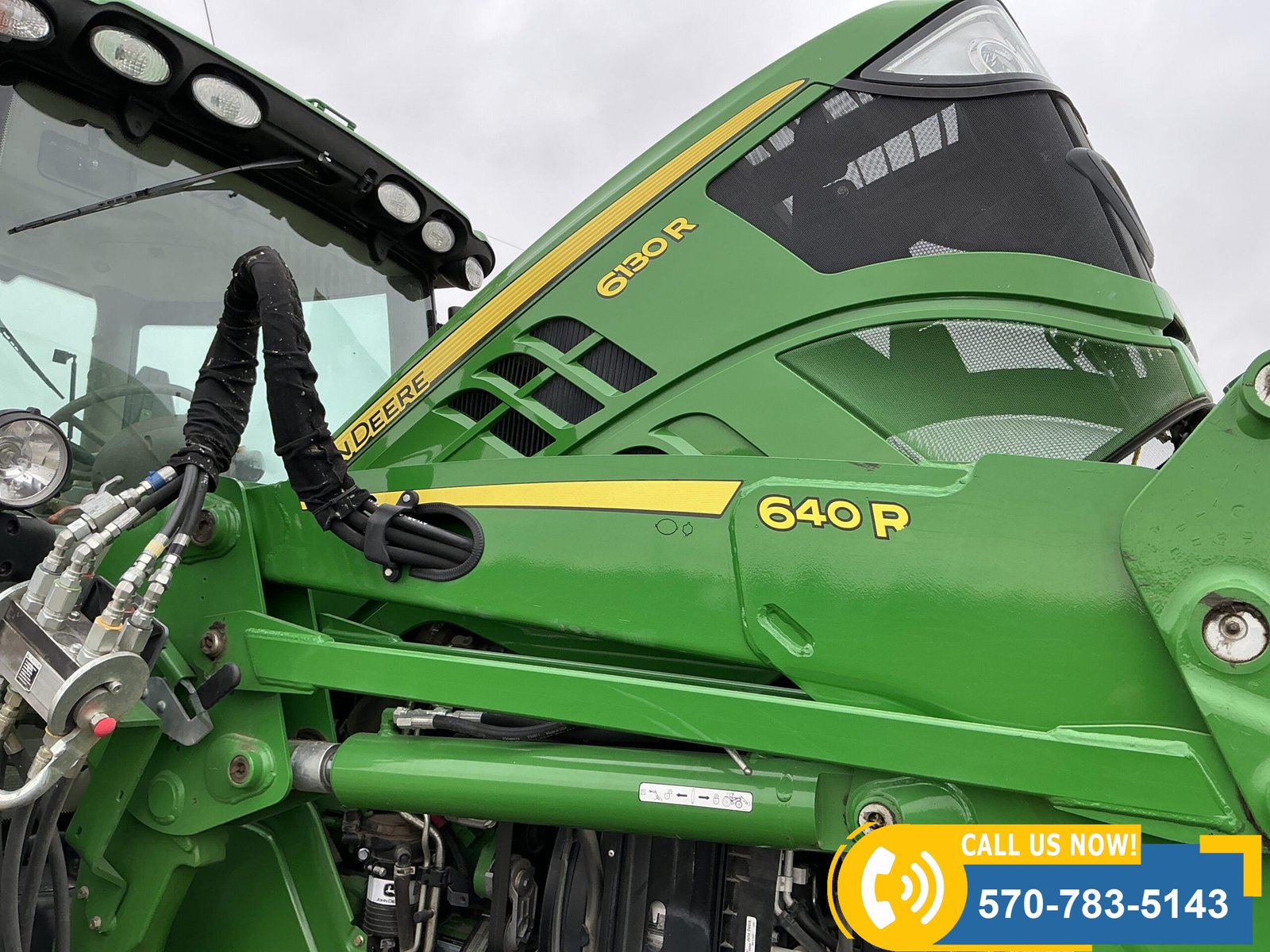 2016 John Deere 6130R MFWD Tractor w/ Loader – 2,563 hours showing, 130 HP John Deere 4.5L 4-cylinder turbo diesel with block heater and AutoQuad Plus Eco 24F/24R transmission. Equipped with 540/small 1000 PTO, rear PTO with fender control, 3 hydraulic outlets, rear fender 3-point hitch control, quick hitch, and differential lock. Features ComfortView cab, AutoTrac readiness, ISOBUS compatibility, hydrostatic power steering, and pressure/flow compensated hydraulics with 32.1 GPM pump flow. Rides on 380/85R24 front and 460/85R38 rear tires with front and rear fenders, rear outer wheel weights, and front/rear locking differential. Includes John Deere 640 quick attach loader with joystick control, single-point hydraulic hookup, front hood/grill guard, 163″ max lift height, and 3,832 lb lift capacity.