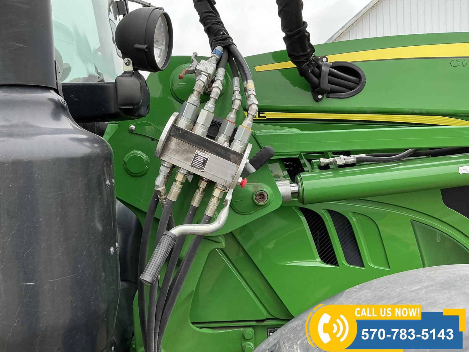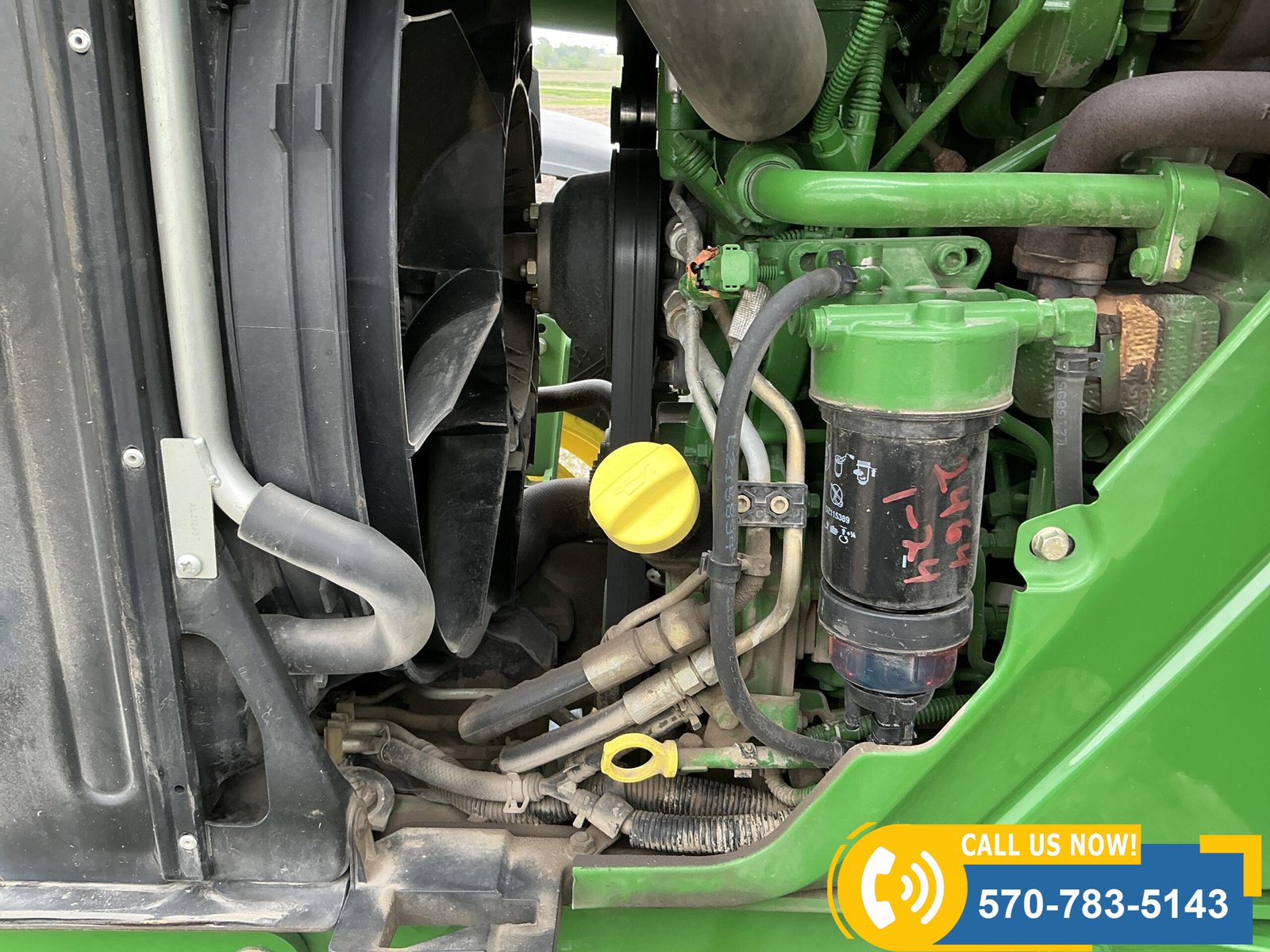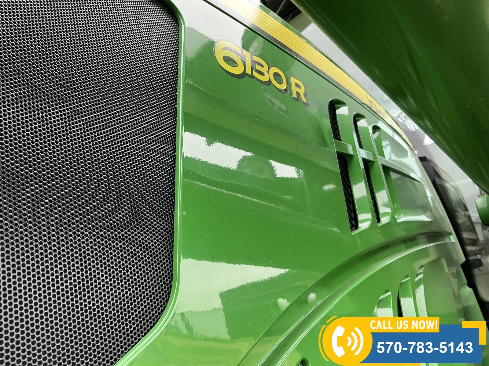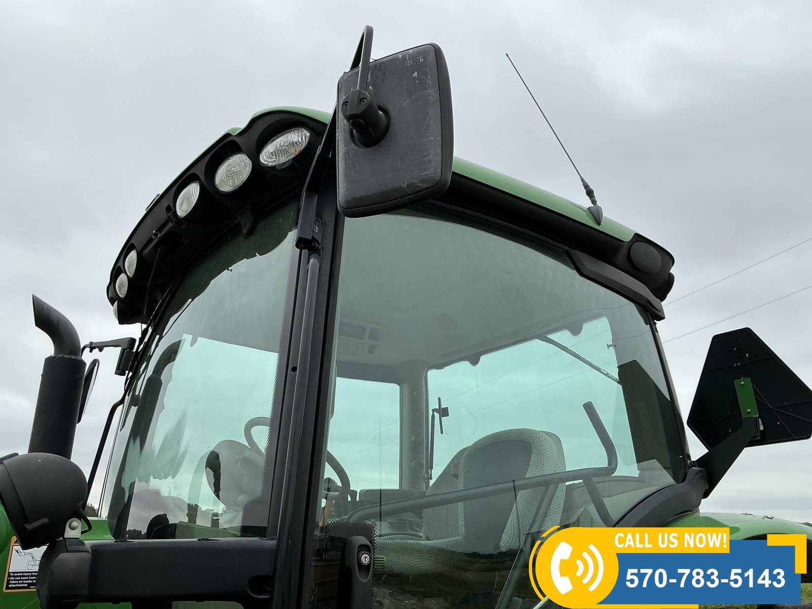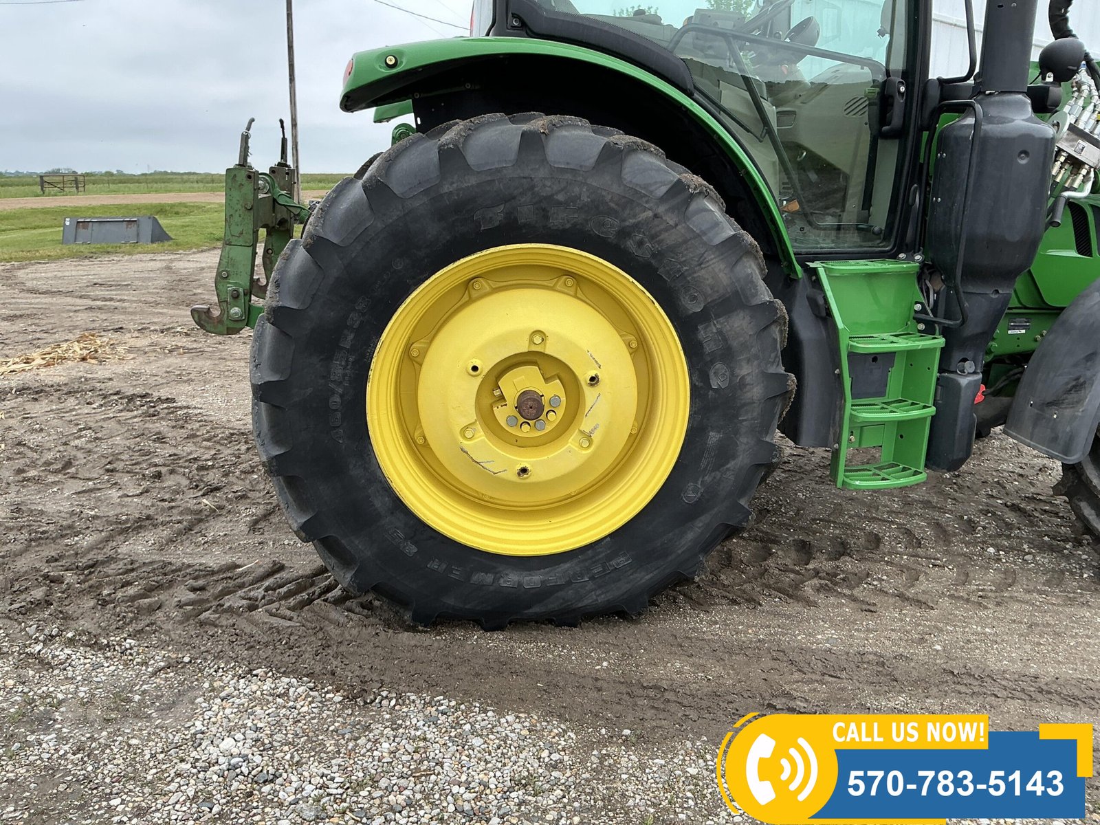 2016 John Deere 6130R MFWD Tractor w/ Loader – 2,563 hours showing, 130 HP John Deere 4.5L 4-cylinder turbo diesel with block heater and AutoQuad Plus Eco 24F/24R transmission. Equipped with 540/small 1000 PTO, rear PTO with fender control, 3 hydraulic outlets, rear fender 3-point hitch control, quick hitch, and differential lock. Features ComfortView cab, AutoTrac readiness, ISOBUS compatibility, hydrostatic power steering, and pressure/flow compensated hydraulics with 32.1 GPM pump flow. Rides on 380/85R24 front and 460/85R38 rear tires with front and rear fenders, rear outer wheel weights, and front/rear locking differential. Includes John Deere 640 quick attach loader with joystick control, single-point hydraulic hookup, front hood/grill guard, 163″ max lift height, and 3,832 lb lift capacity.