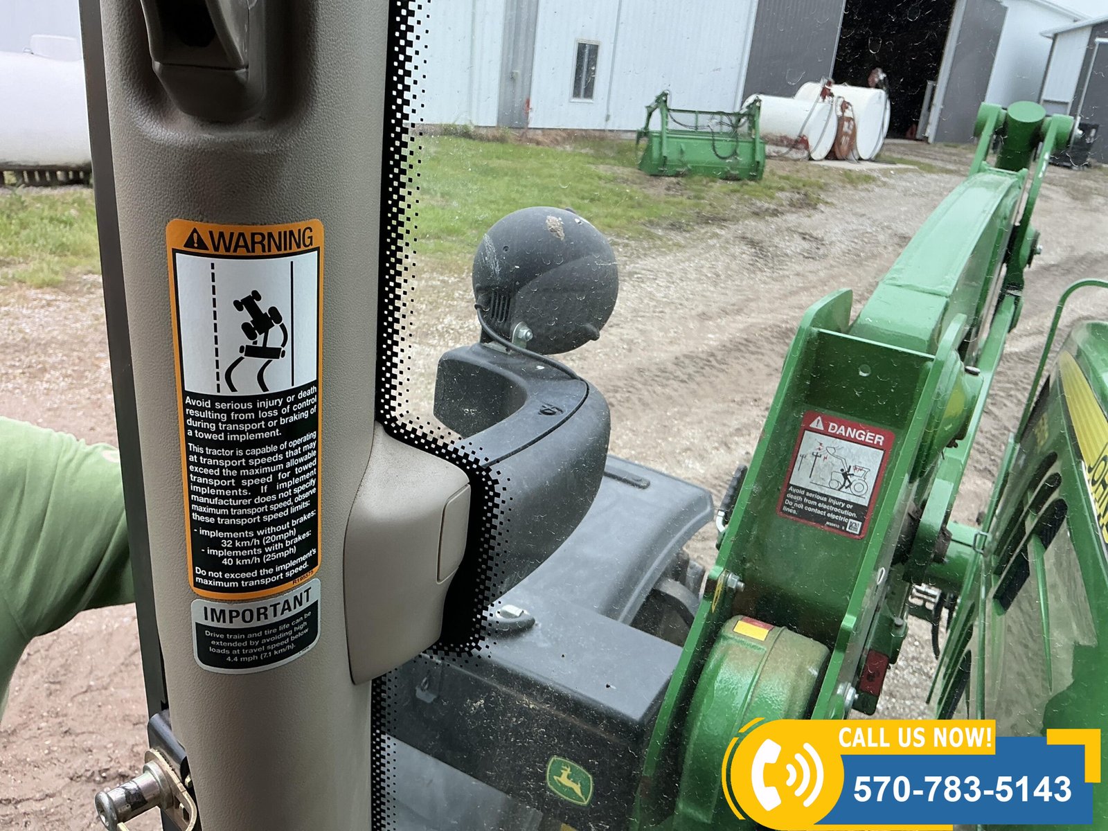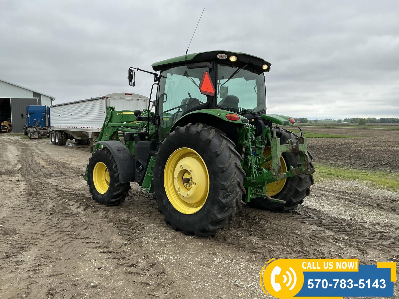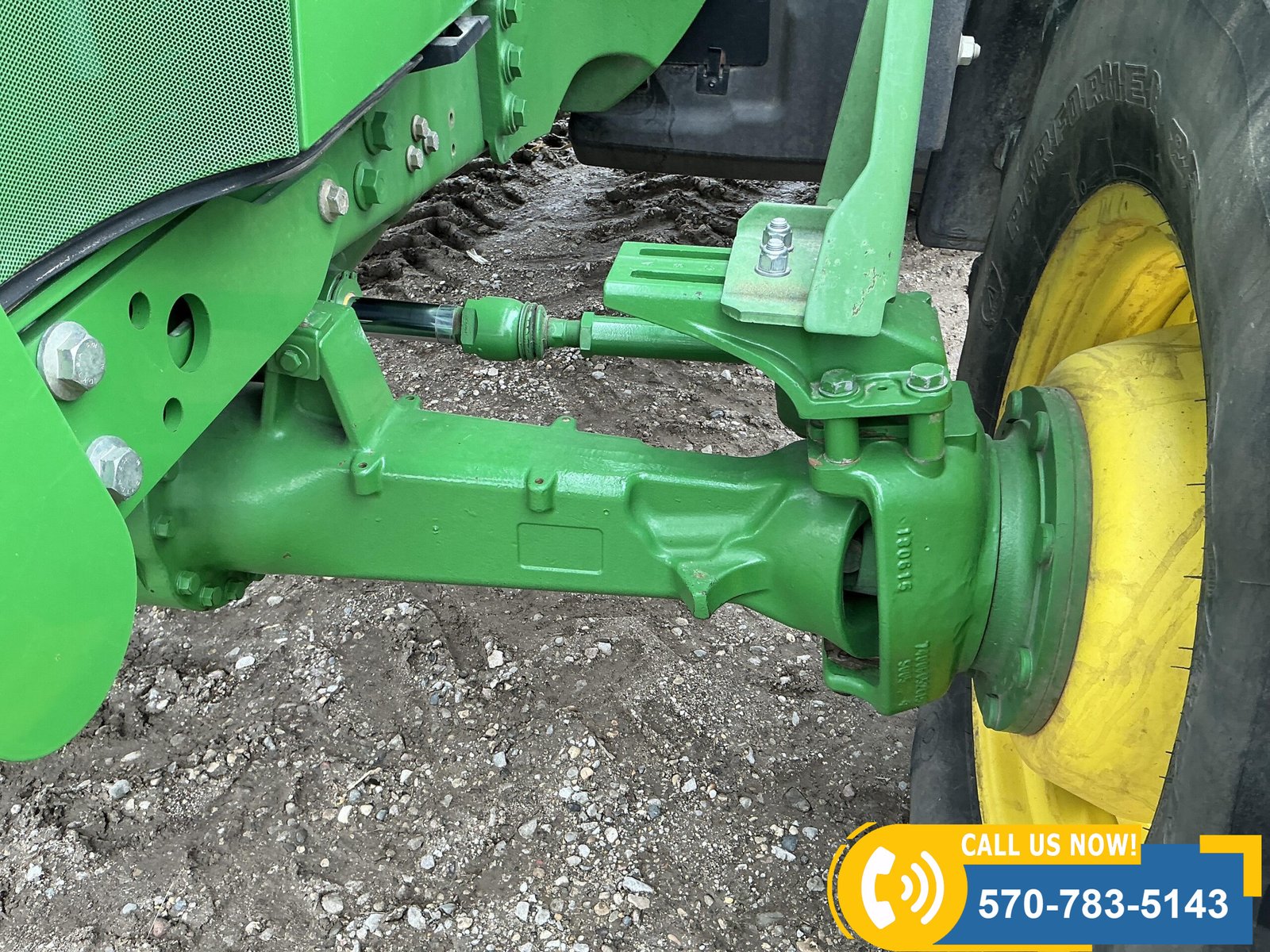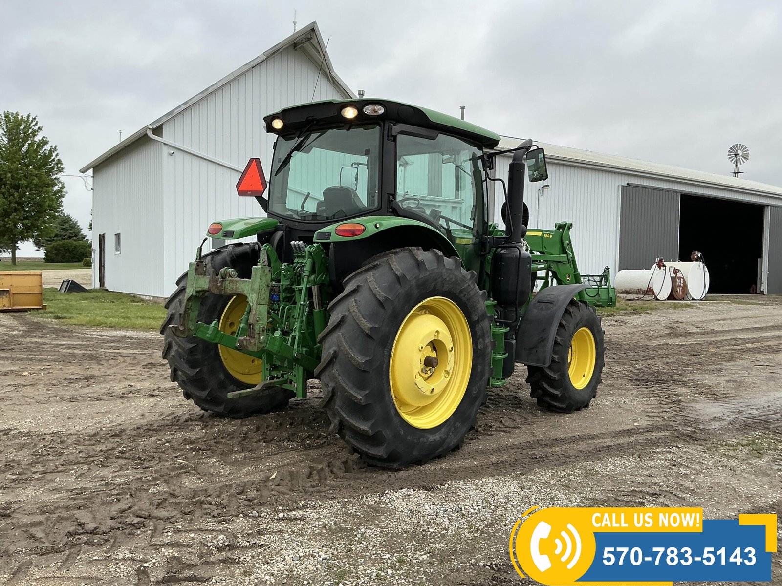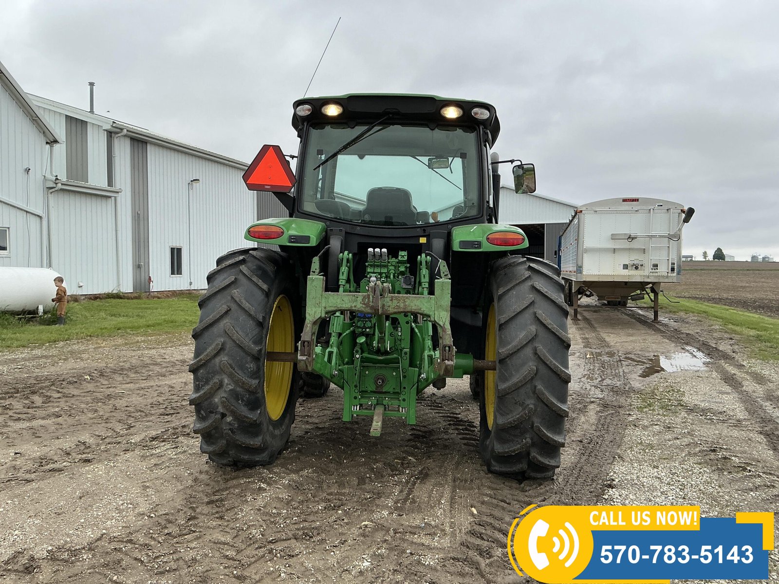 2016 John Deere 6130R MFWD Tractor w/ Loader – 2,563 hours showing, 130 HP John Deere 4.5L 4-cylinder turbo diesel with block heater and AutoQuad Plus Eco 24F/24R transmission. Equipped with 540/small 1000 PTO, rear PTO with fender control, 3 hydraulic outlets, rear fender 3-point hitch control, quick hitch, and differential lock. Features ComfortView cab, AutoTrac readiness, ISOBUS compatibility, hydrostatic power steering, and pressure/flow compensated hydraulics with 32.1 GPM pump flow. Rides on 380/85R24 front and 460/85R38 rear tires with front and rear fenders, rear outer wheel weights, and front/rear locking differential. Includes John Deere 640 quick attach loader with joystick control, single-point hydraulic hookup, front hood/grill guard, 163″ max lift height, and 3,832 lb lift capacity.
