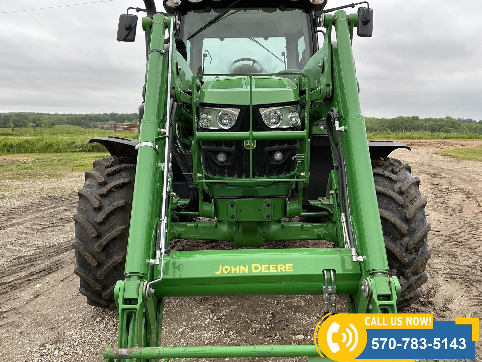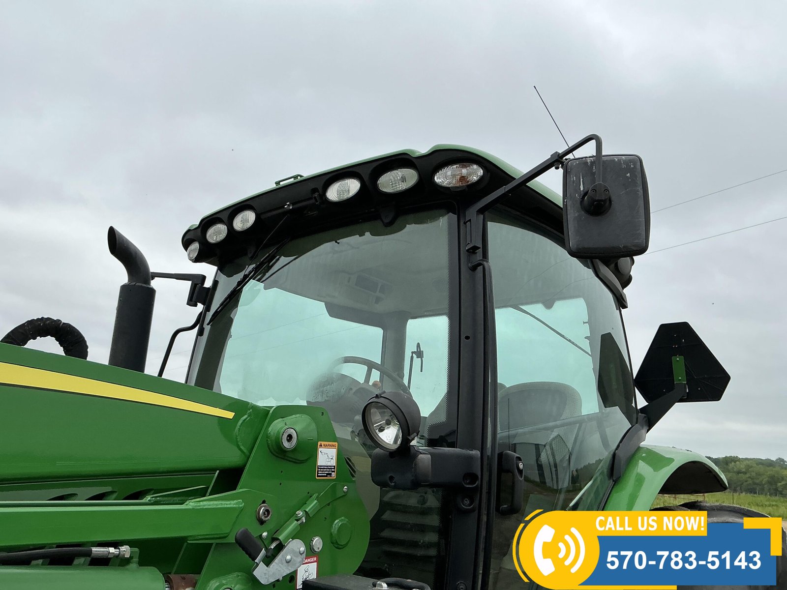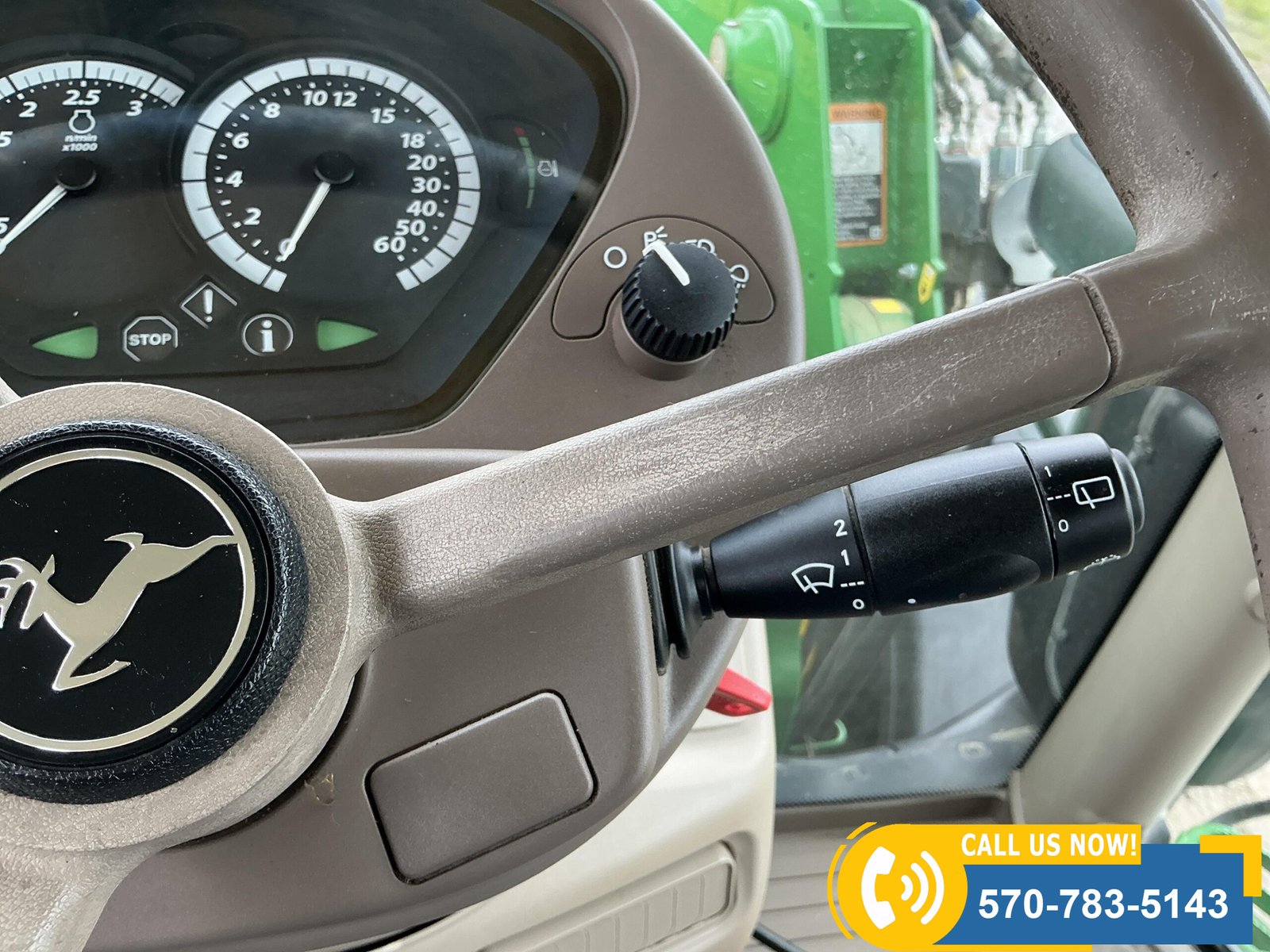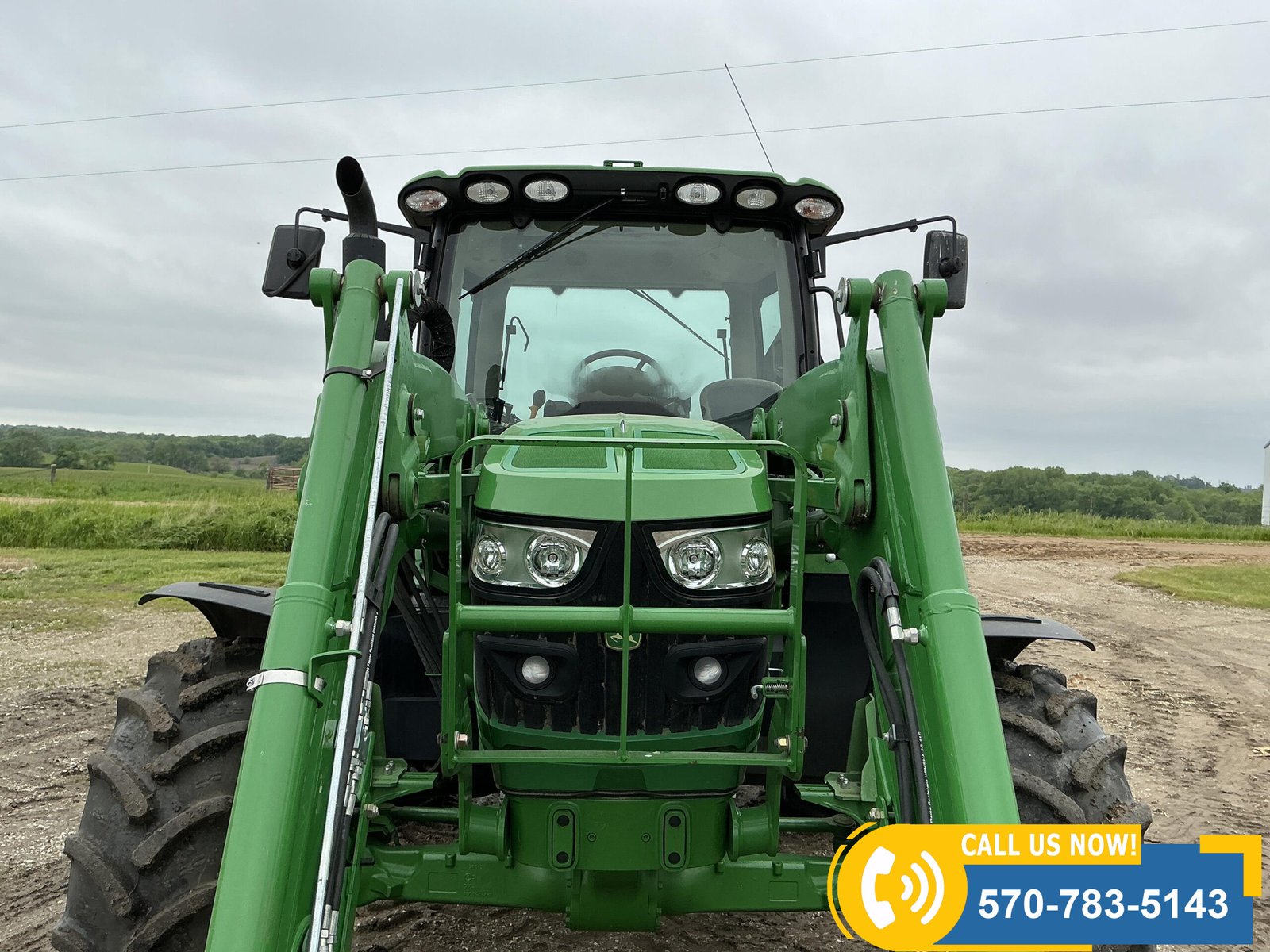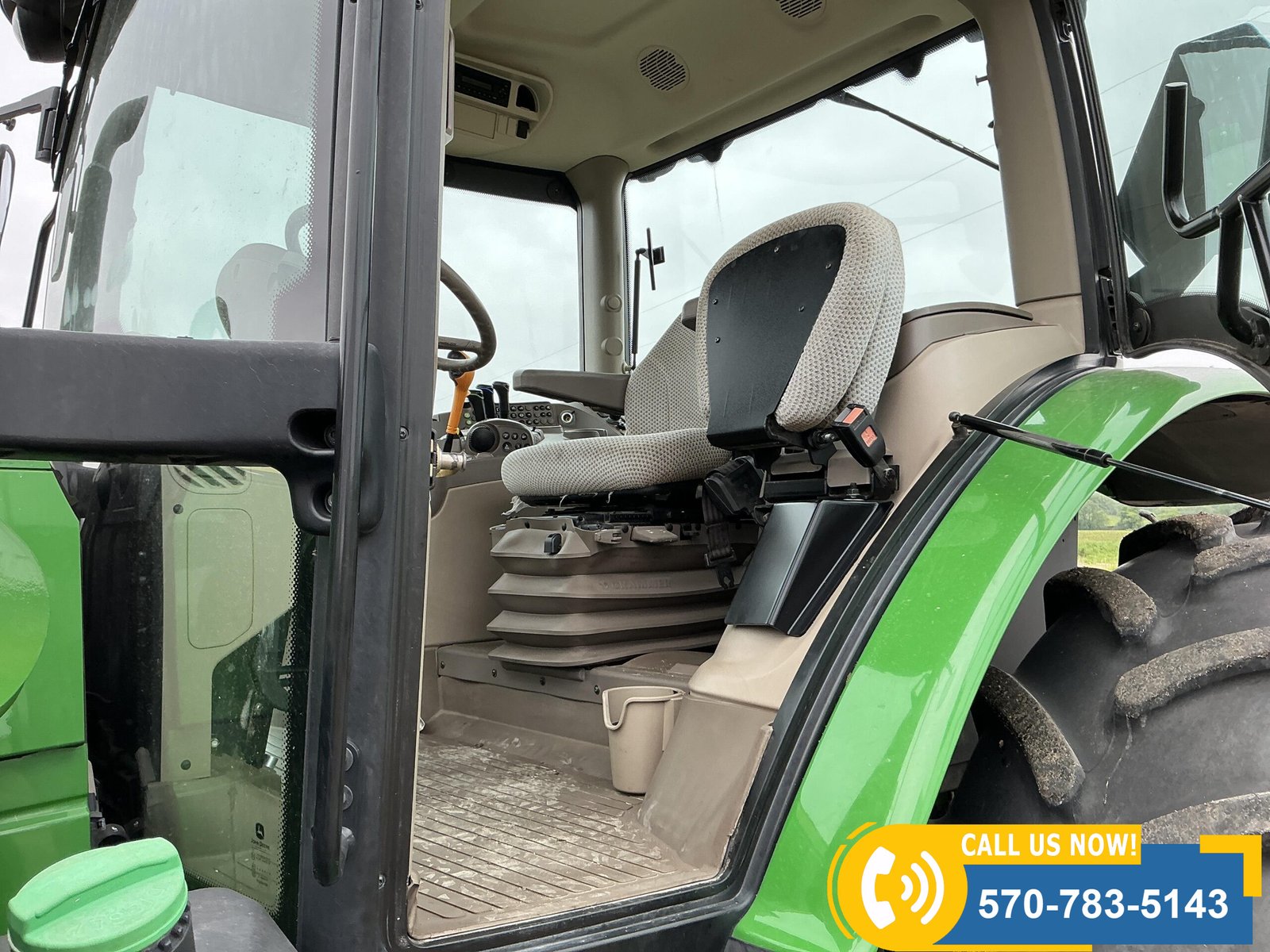 2016 John Deere 6130R MFWD Tractor w/ Loader – 2,563 hours showing, 130 HP John Deere 4.5L 4-cylinder turbo diesel with block heater and AutoQuad Plus Eco 24F/24R transmission. Equipped with 540/small 1000 PTO, rear PTO with fender control, 3 hydraulic outlets, rear fender 3-point hitch control, quick hitch, and differential lock. Features ComfortView cab, AutoTrac readiness, ISOBUS compatibility, hydrostatic power steering, and pressure/flow compensated hydraulics with 32.1 GPM pump flow. Rides on 380/85R24 front and 460/85R38 rear tires with front and rear fenders, rear outer wheel weights, and front/rear locking differential. Includes John Deere 640 quick attach loader with joystick control, single-point hydraulic hookup, front hood/grill guard, 163″ max lift height, and 3,832 lb lift capacity.