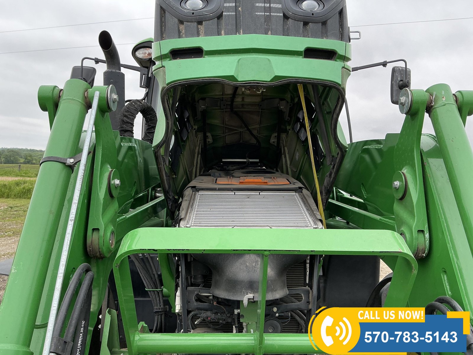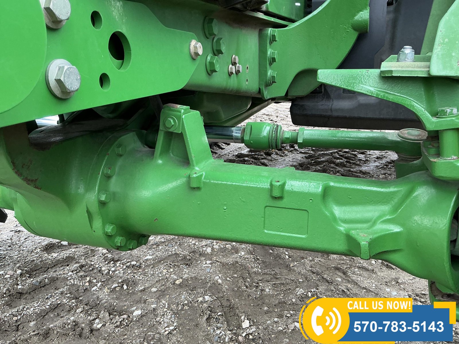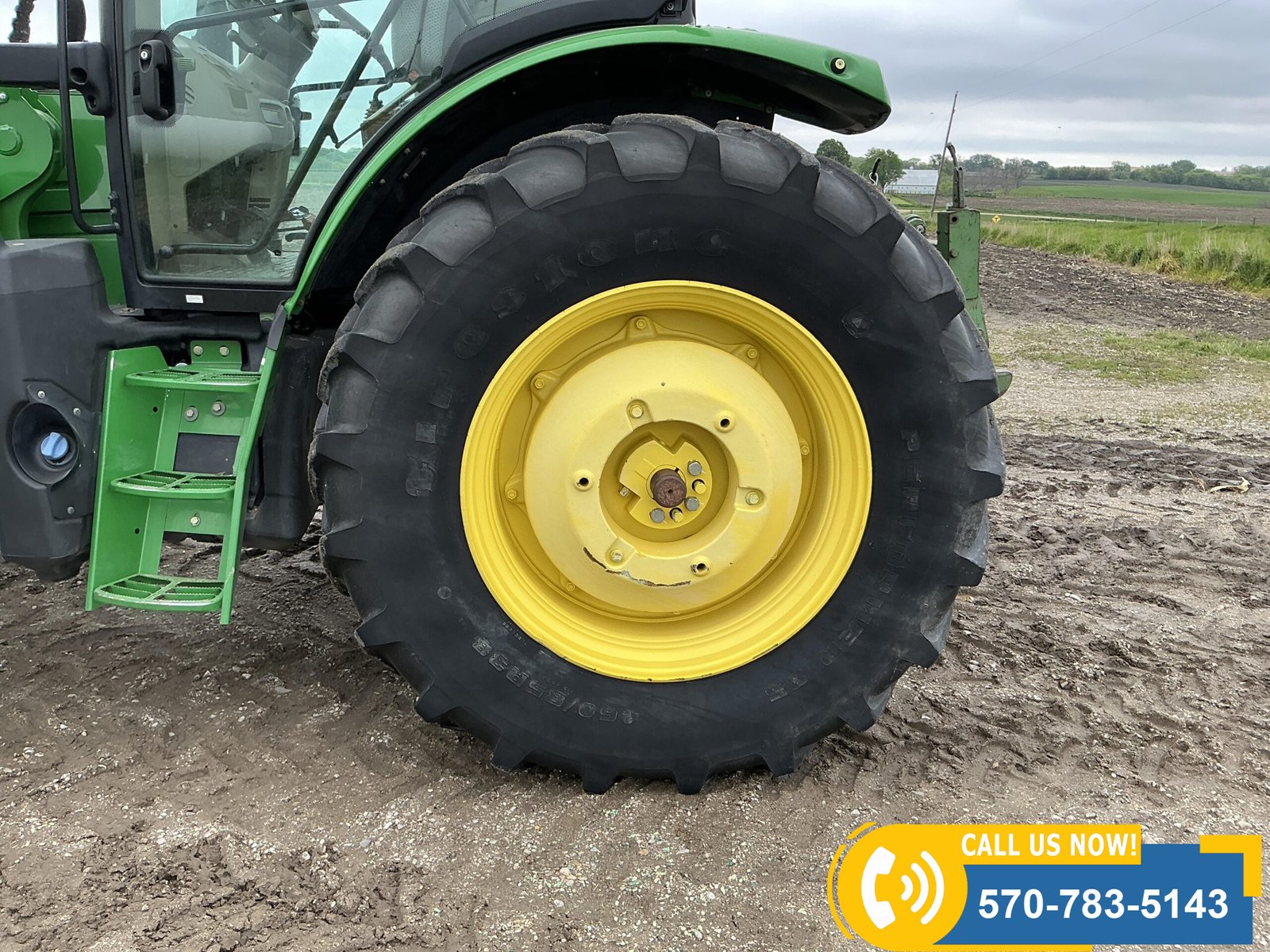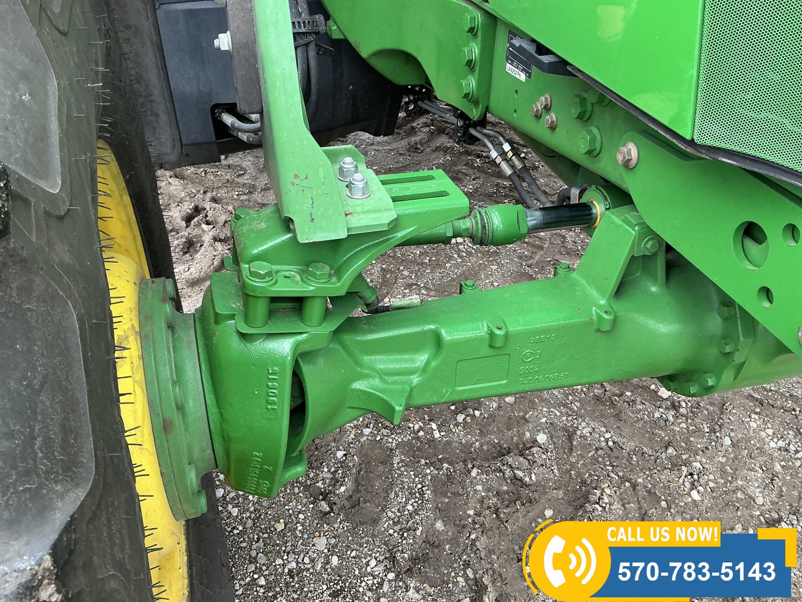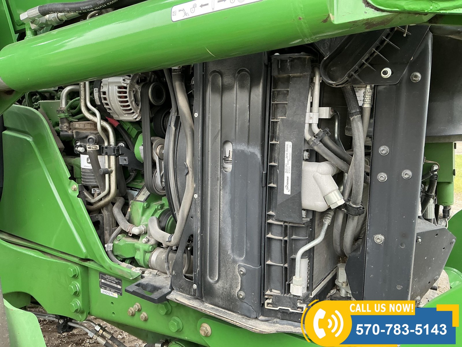 2016 John Deere 6130R MFWD Tractor w/ Loader – 2,563 hours showing, 130 HP John Deere 4.5L 4-cylinder turbo diesel with block heater and AutoQuad Plus Eco 24F/24R transmission. Equipped with 540/small 1000 PTO, rear PTO with fender control, 3 hydraulic outlets, rear fender 3-point hitch control, quick hitch, and differential lock. Features ComfortView cab, AutoTrac readiness, ISOBUS compatibility, hydrostatic power steering, and pressure/flow compensated hydraulics with 32.1 GPM pump flow. Rides on 380/85R24 front and 460/85R38 rear tires with front and rear fenders, rear outer wheel weights, and front/rear locking differential. Includes John Deere 640 quick attach loader with joystick control, single-point hydraulic hookup, front hood/grill guard, 163″ max lift height, and 3,832 lb lift capacity.