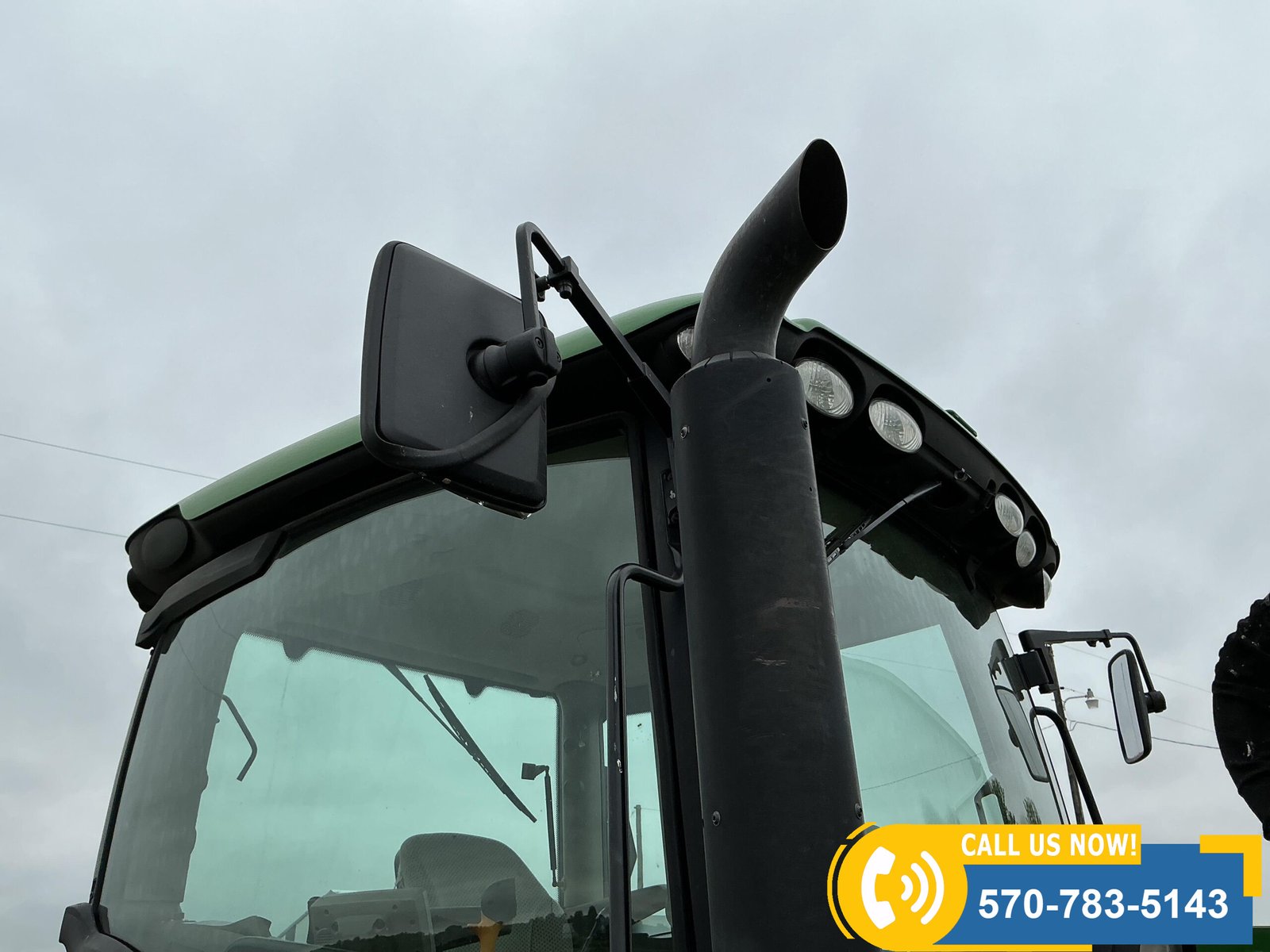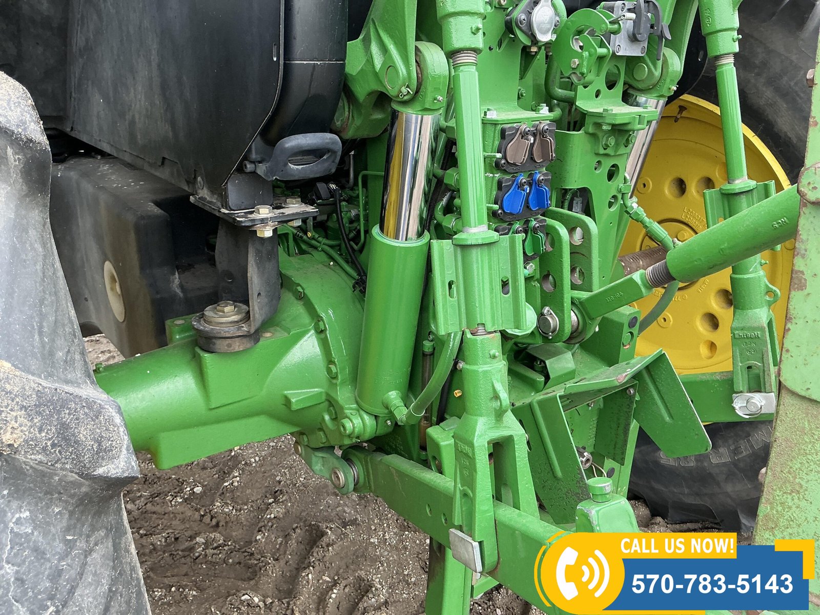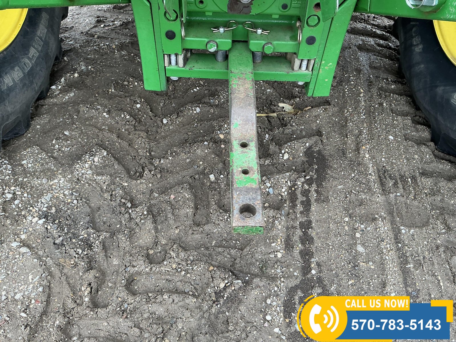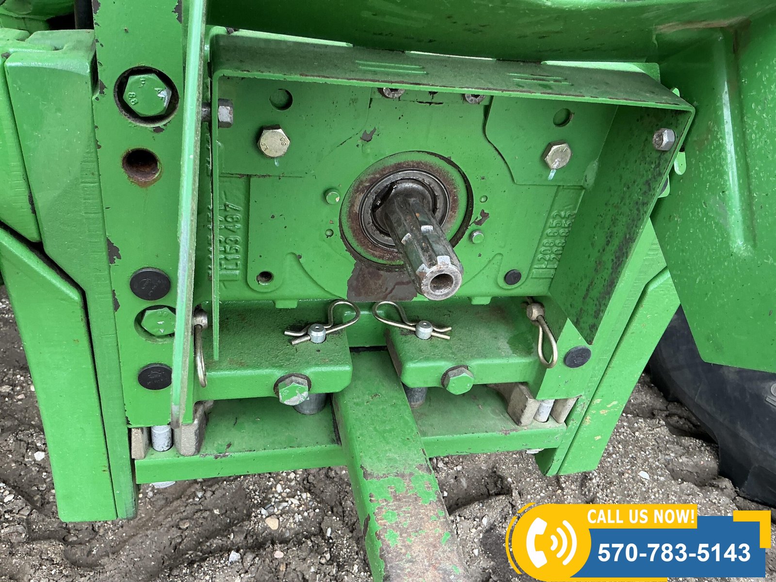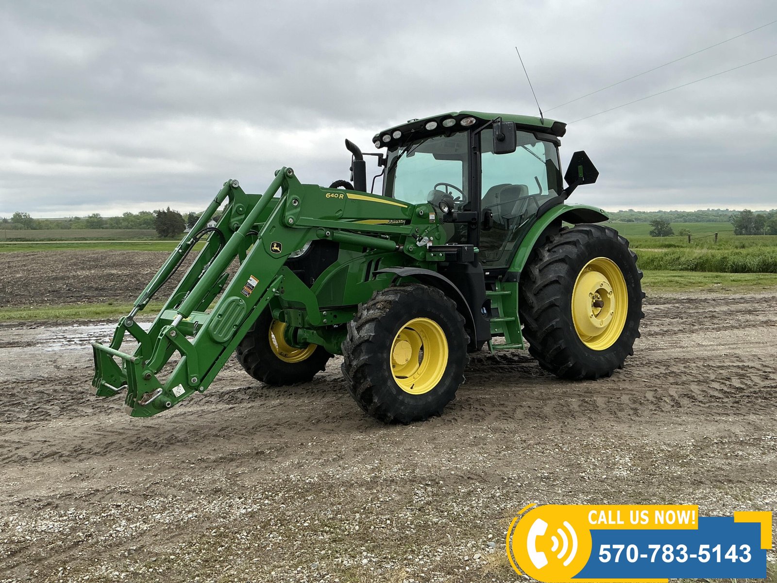 2016 John Deere 6130R MFWD Tractor w/ Loader – 2,563 hours showing, 130 HP John Deere 4.5L 4-cylinder turbo diesel with block heater and AutoQuad Plus Eco 24F/24R transmission. Equipped with 540/small 1000 PTO, rear PTO with fender control, 3 hydraulic outlets, rear fender 3-point hitch control, quick hitch, and differential lock. Features ComfortView cab, AutoTrac readiness, ISOBUS compatibility, hydrostatic power steering, and pressure/flow compensated hydraulics with 32.1 GPM pump flow. Rides on 380/85R24 front and 460/85R38 rear tires with front and rear fenders, rear outer wheel weights, and front/rear locking differential. Includes John Deere 640 quick attach loader with joystick control, single-point hydraulic hookup, front hood/grill guard, 163″ max lift height, and 3,832 lb lift capacity.