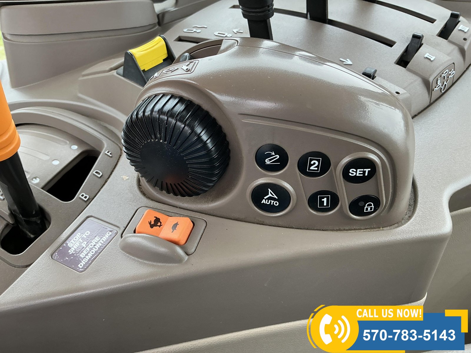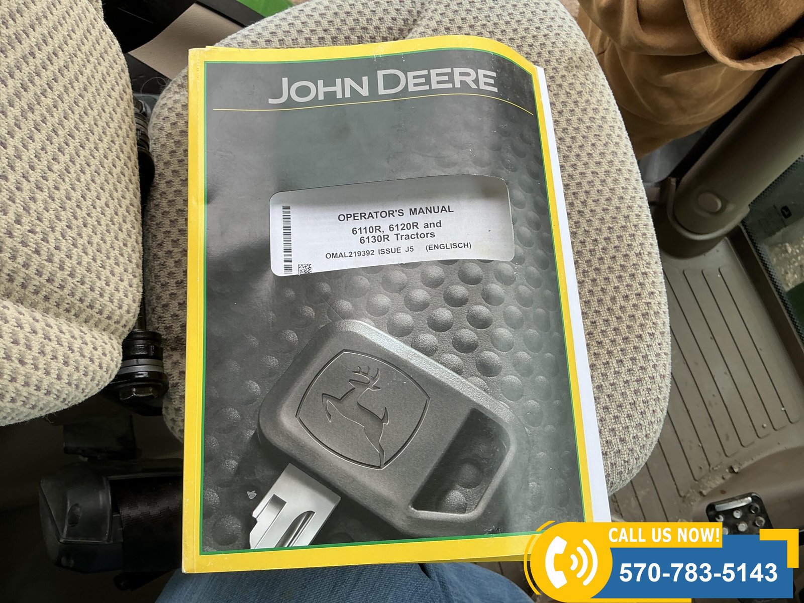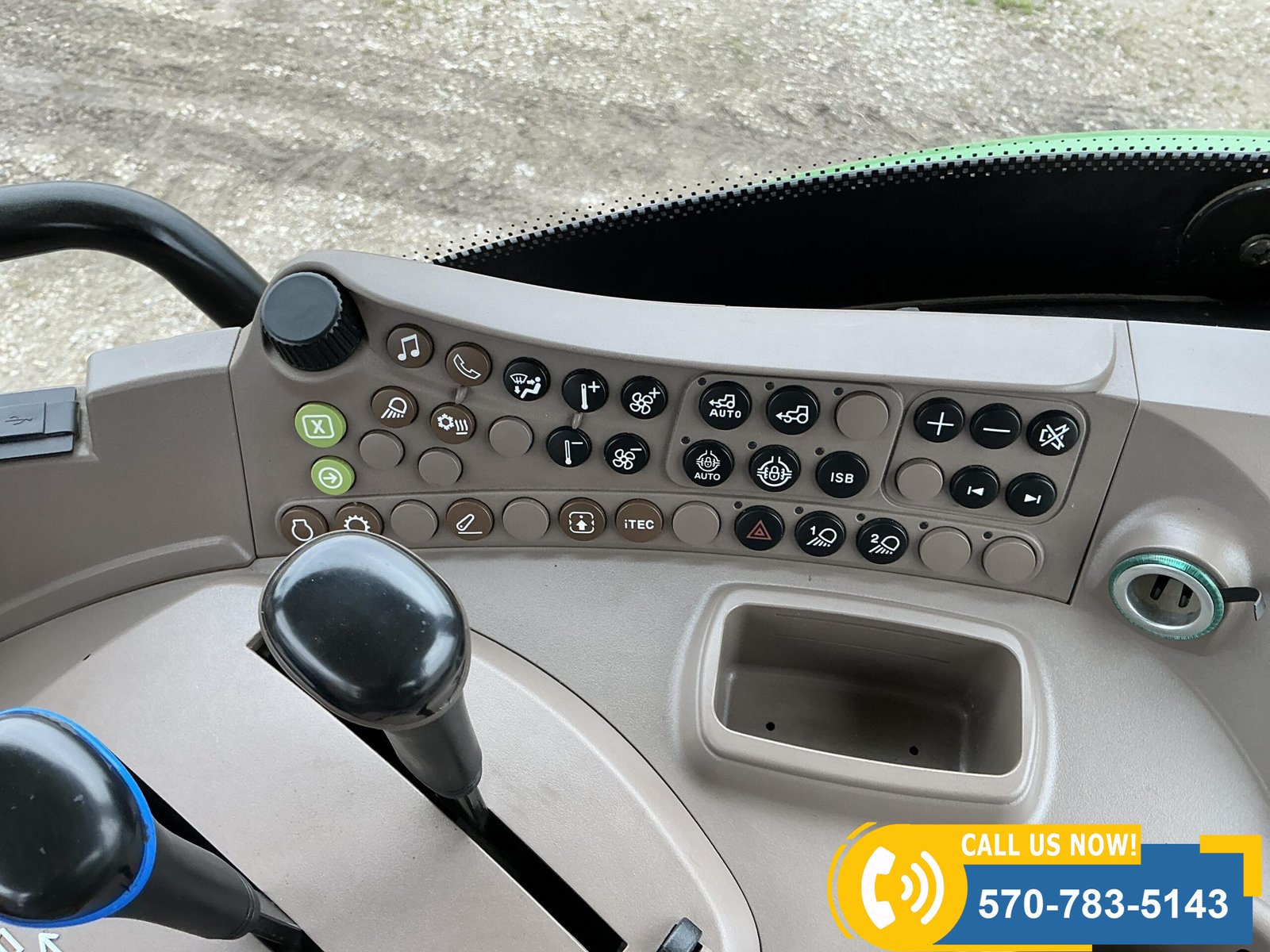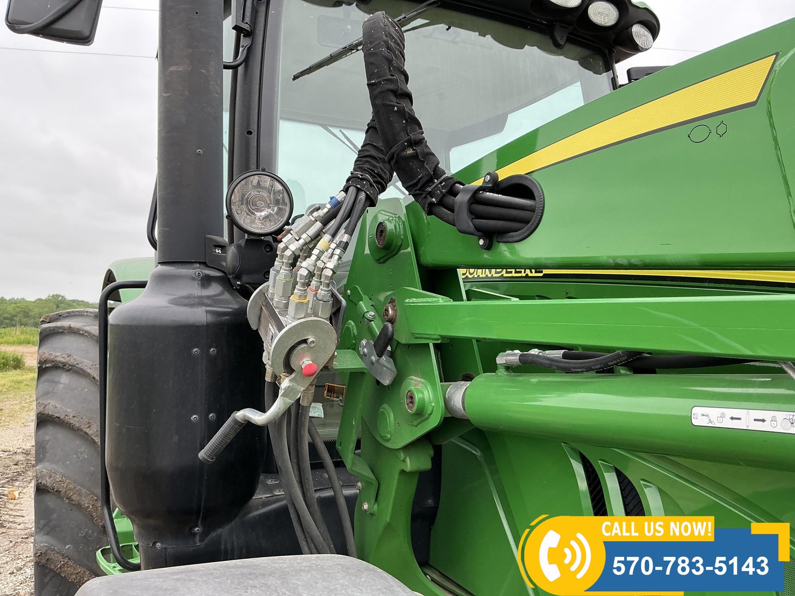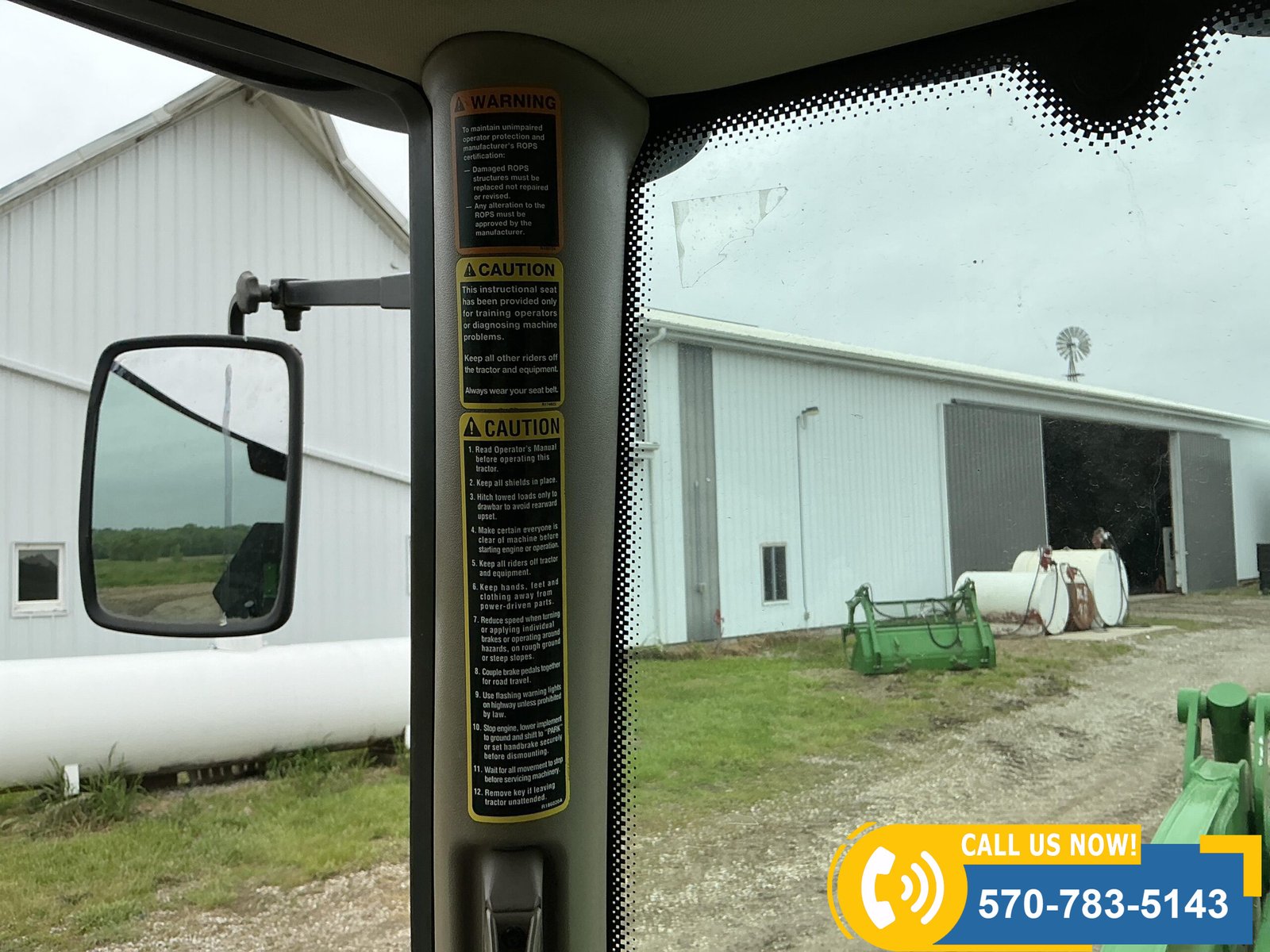 2016 John Deere 6130R MFWD Tractor w/ Loader – 2,563 hours showing, 130 HP John Deere 4.5L 4-cylinder turbo diesel with block heater and AutoQuad Plus Eco 24F/24R transmission. Equipped with 540/small 1000 PTO, rear PTO with fender control, 3 hydraulic outlets, rear fender 3-point hitch control, quick hitch, and differential lock. Features ComfortView cab, AutoTrac readiness, ISOBUS compatibility, hydrostatic power steering, and pressure/flow compensated hydraulics with 32.1 GPM pump flow. Rides on 380/85R24 front and 460/85R38 rear tires with front and rear fenders, rear outer wheel weights, and front/rear locking differential. Includes John Deere 640 quick attach loader with joystick control, single-point hydraulic hookup, front hood/grill guard, 163″ max lift height, and 3,832 lb lift capacity.
