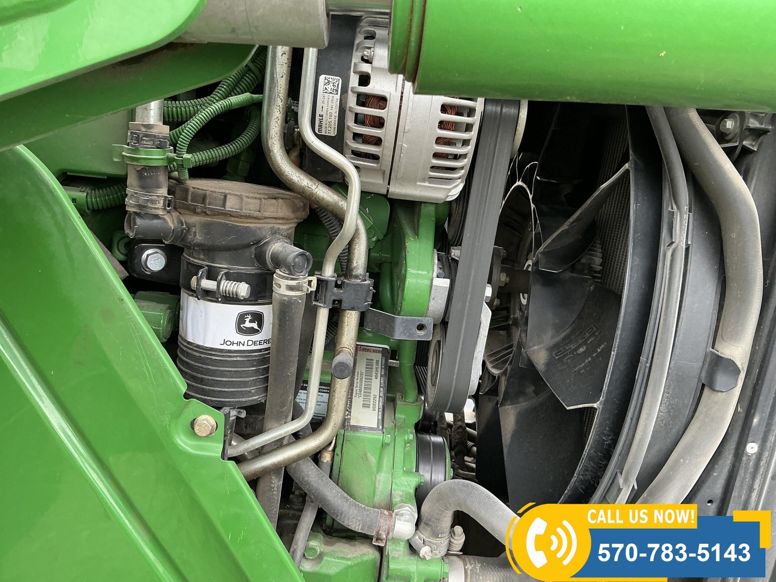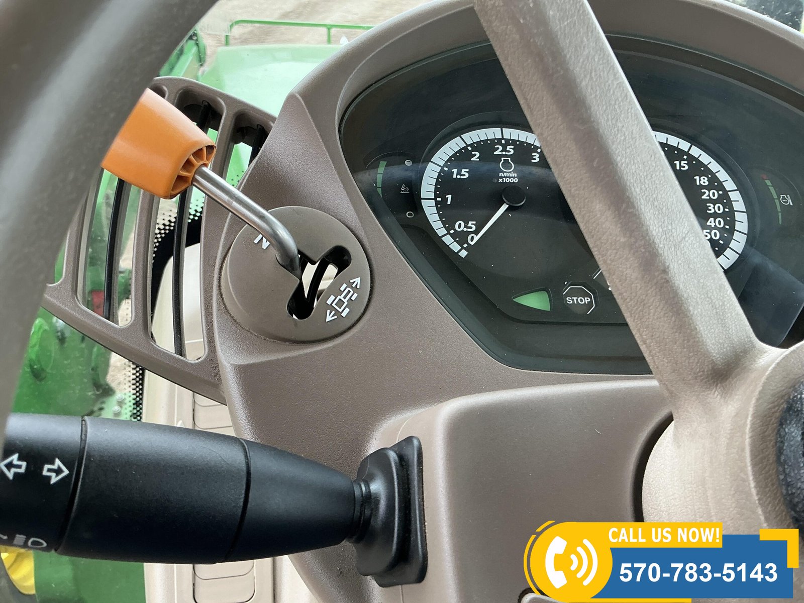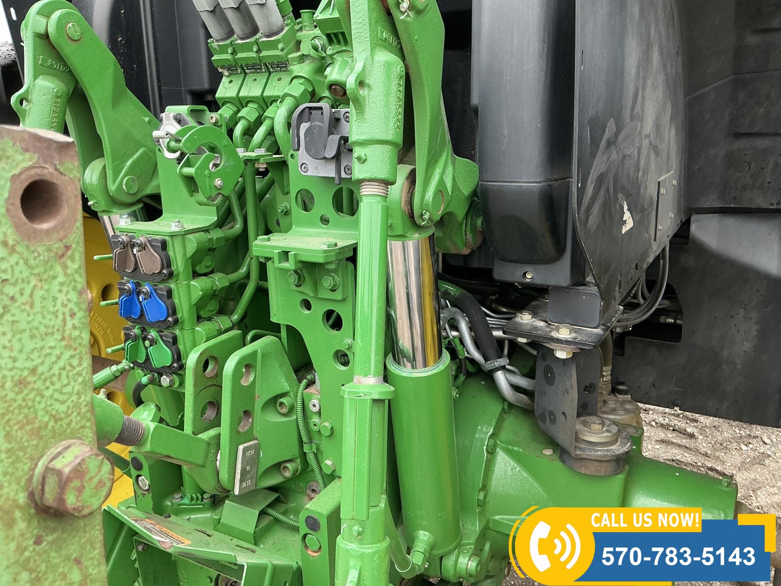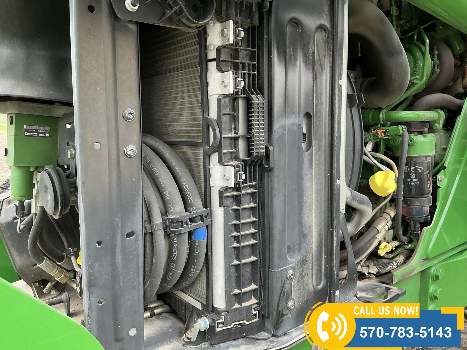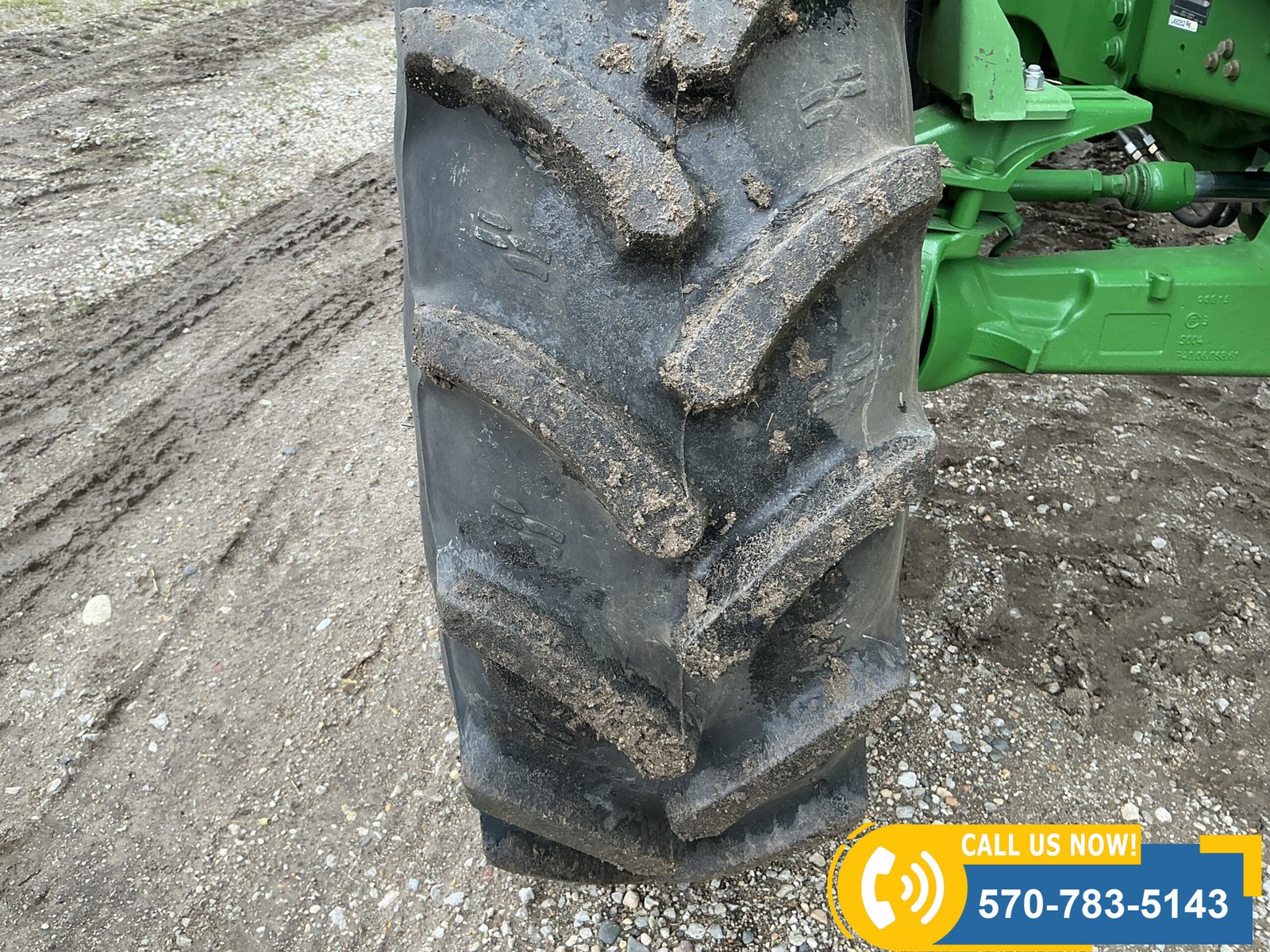 2016 John Deere 6130R MFWD Tractor w/ Loader – 2,563 hours showing, 130 HP John Deere 4.5L 4-cylinder turbo diesel with block heater and AutoQuad Plus Eco 24F/24R transmission. Equipped with 540/small 1000 PTO, rear PTO with fender control, 3 hydraulic outlets, rear fender 3-point hitch control, quick hitch, and differential lock. Features ComfortView cab, AutoTrac readiness, ISOBUS compatibility, hydrostatic power steering, and pressure/flow compensated hydraulics with 32.1 GPM pump flow. Rides on 380/85R24 front and 460/85R38 rear tires with front and rear fenders, rear outer wheel weights, and front/rear locking differential. Includes John Deere 640 quick attach loader with joystick control, single-point hydraulic hookup, front hood/grill guard, 163″ max lift height, and 3,832 lb lift capacity.