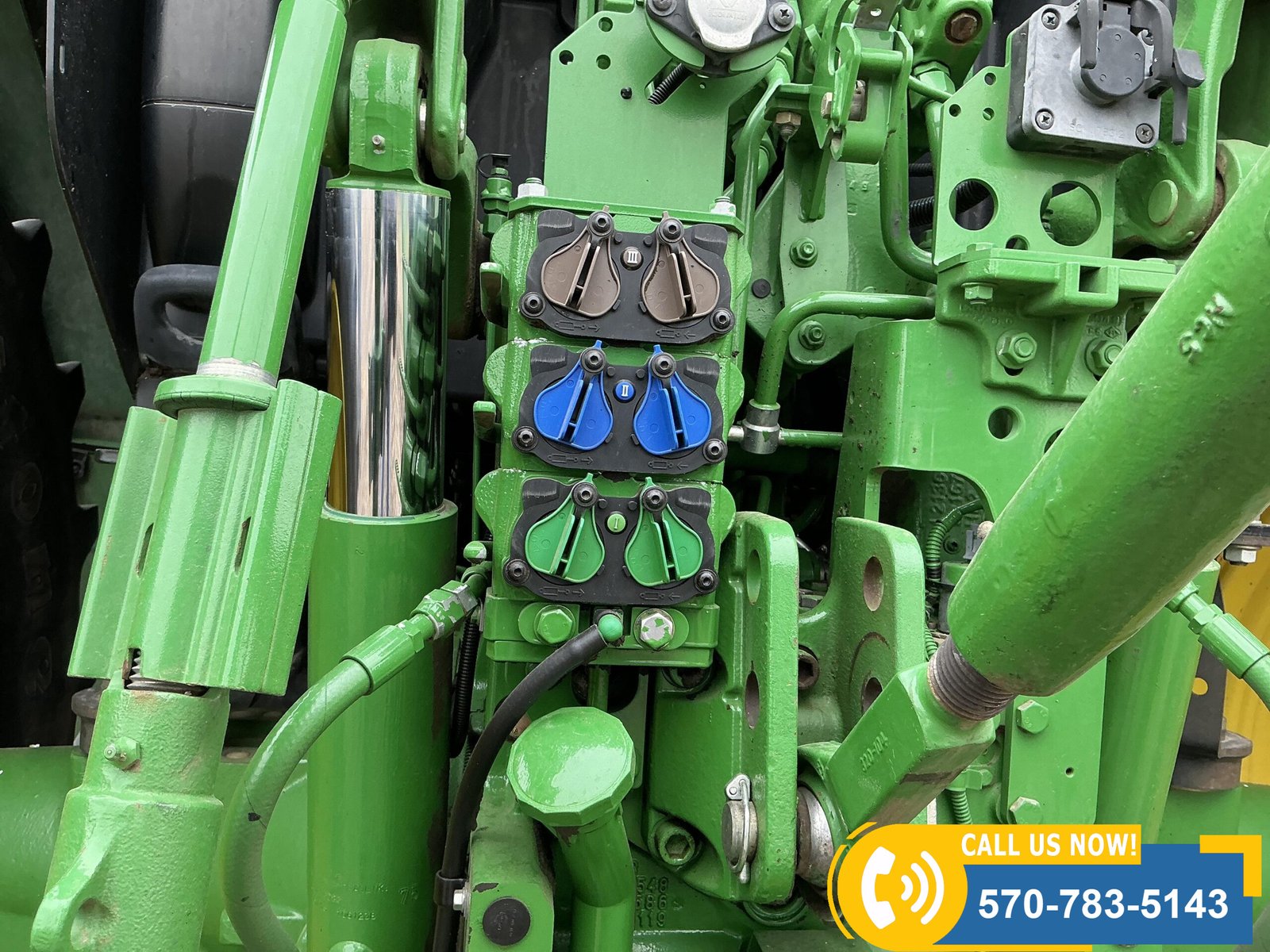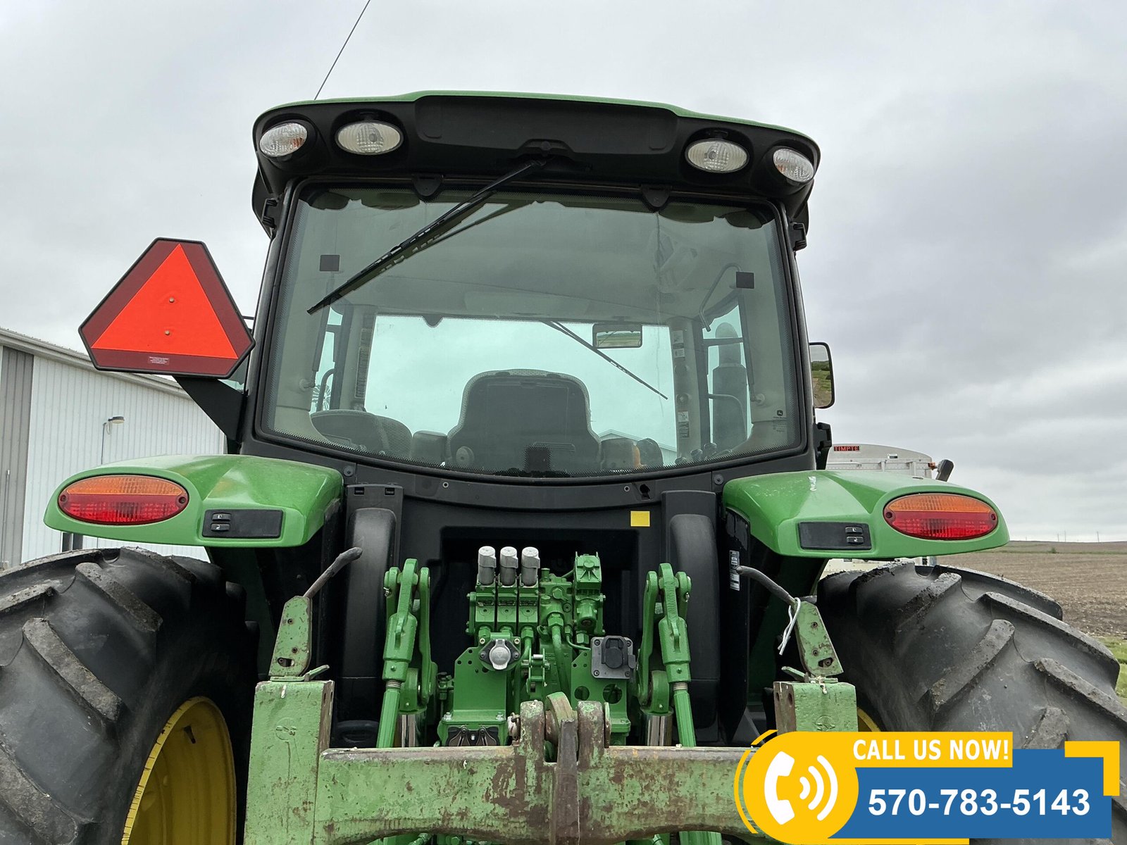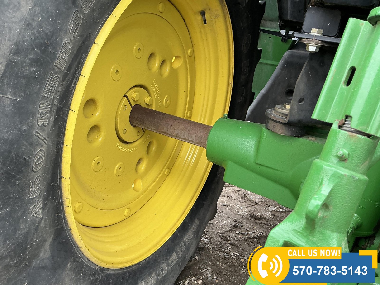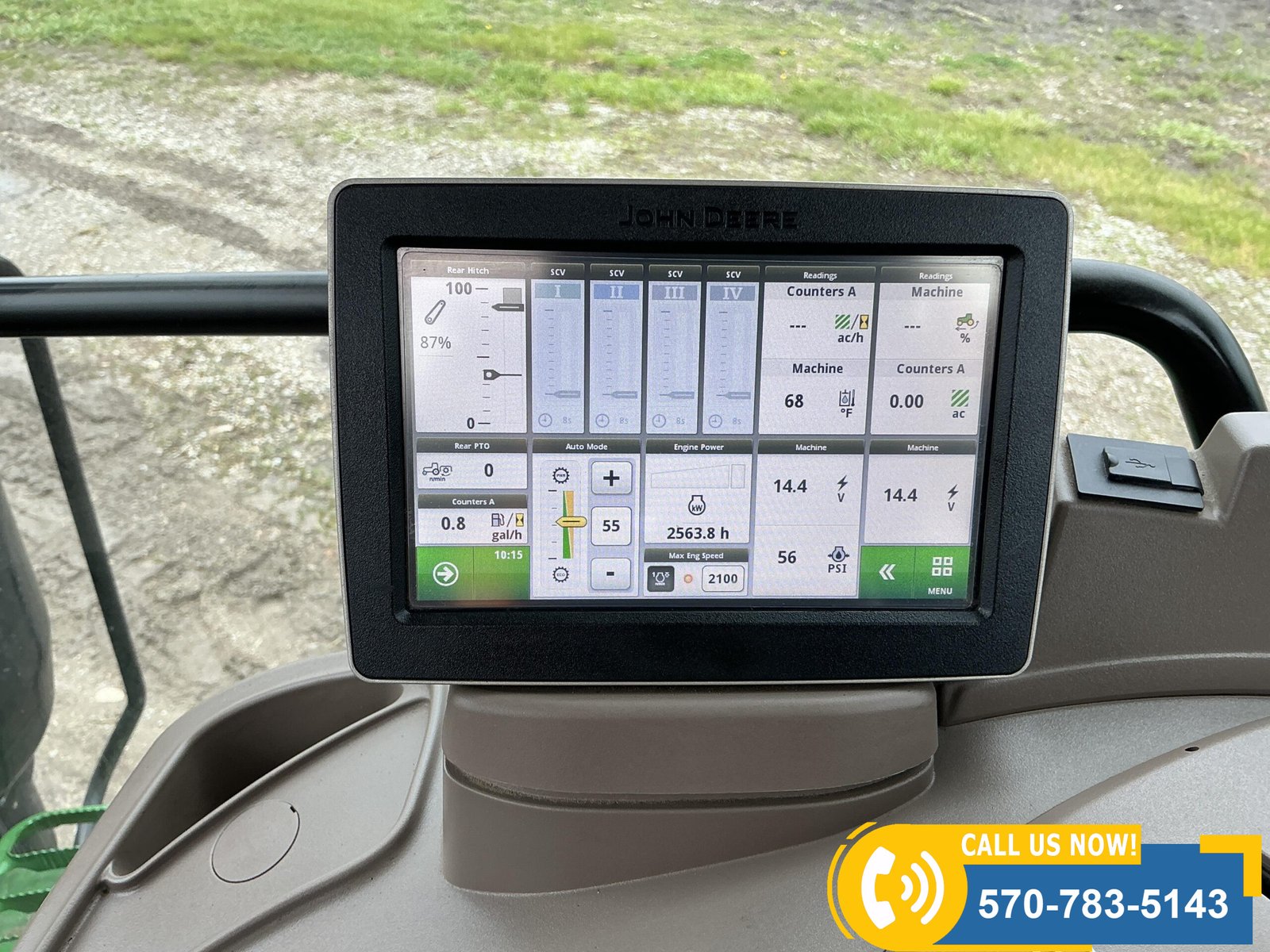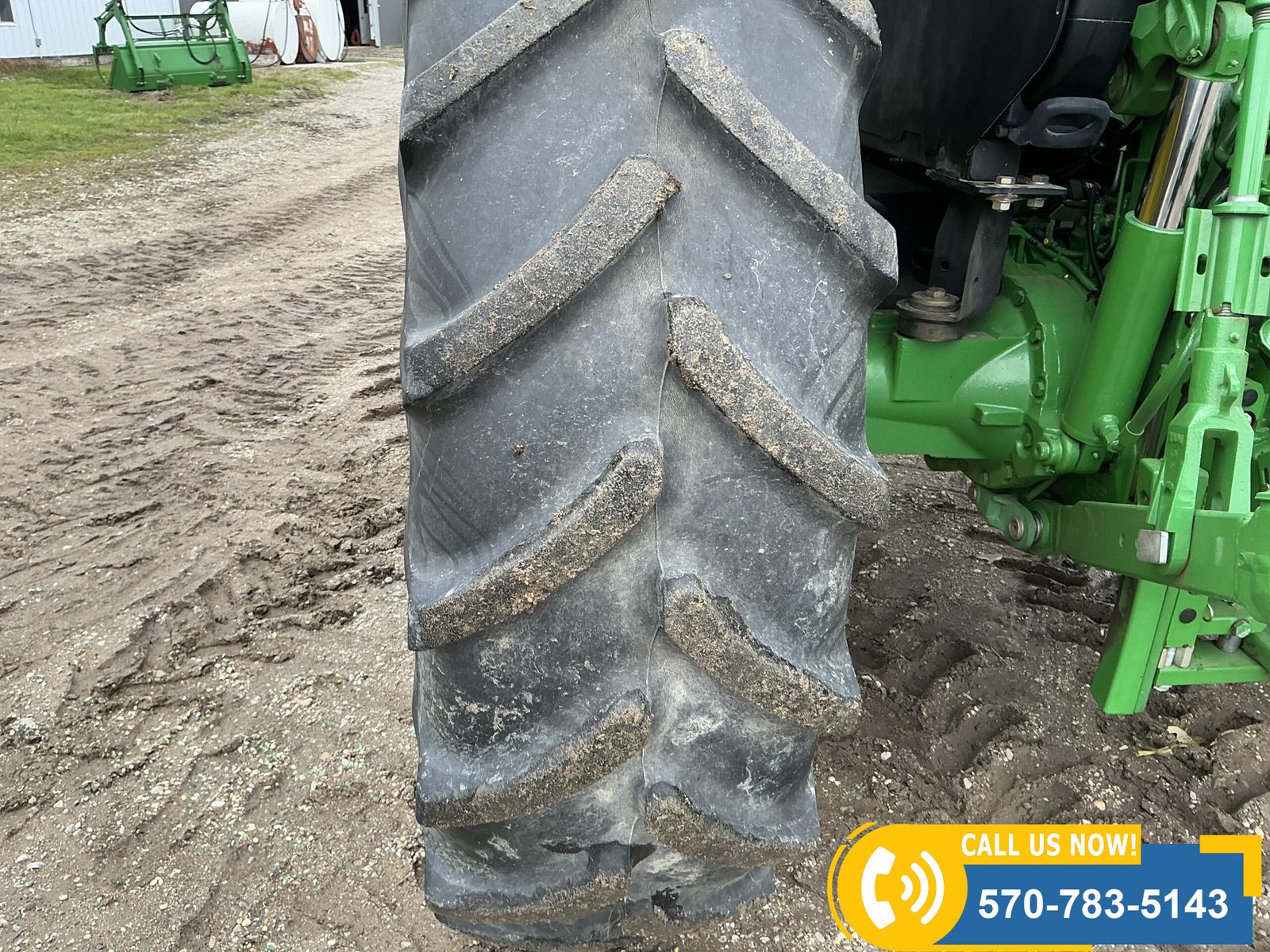 2016 John Deere 6130R MFWD Tractor w/ Loader – 2,563 hours showing, 130 HP John Deere 4.5L 4-cylinder turbo diesel with block heater and AutoQuad Plus Eco 24F/24R transmission. Equipped with 540/small 1000 PTO, rear PTO with fender control, 3 hydraulic outlets, rear fender 3-point hitch control, quick hitch, and differential lock. Features ComfortView cab, AutoTrac readiness, ISOBUS compatibility, hydrostatic power steering, and pressure/flow compensated hydraulics with 32.1 GPM pump flow. Rides on 380/85R24 front and 460/85R38 rear tires with front and rear fenders, rear outer wheel weights, and front/rear locking differential. Includes John Deere 640 quick attach loader with joystick control, single-point hydraulic hookup, front hood/grill guard, 163″ max lift height, and 3,832 lb lift capacity.