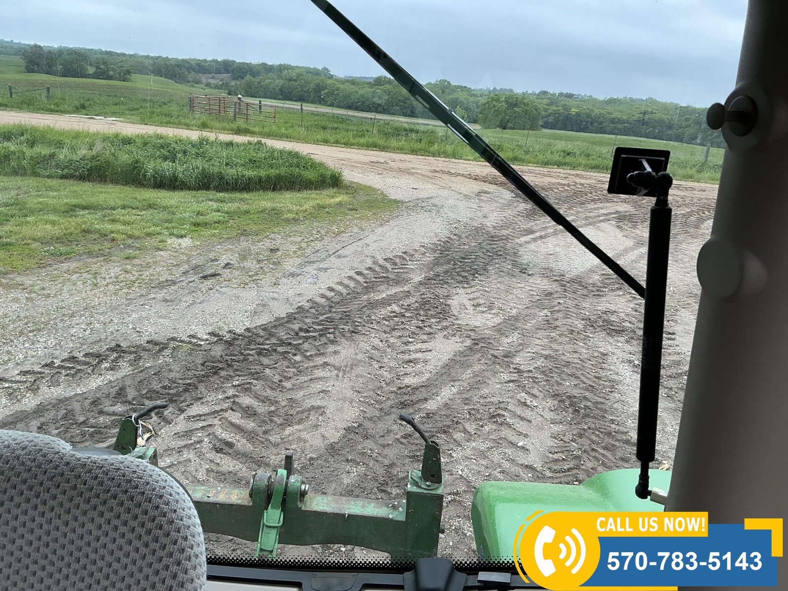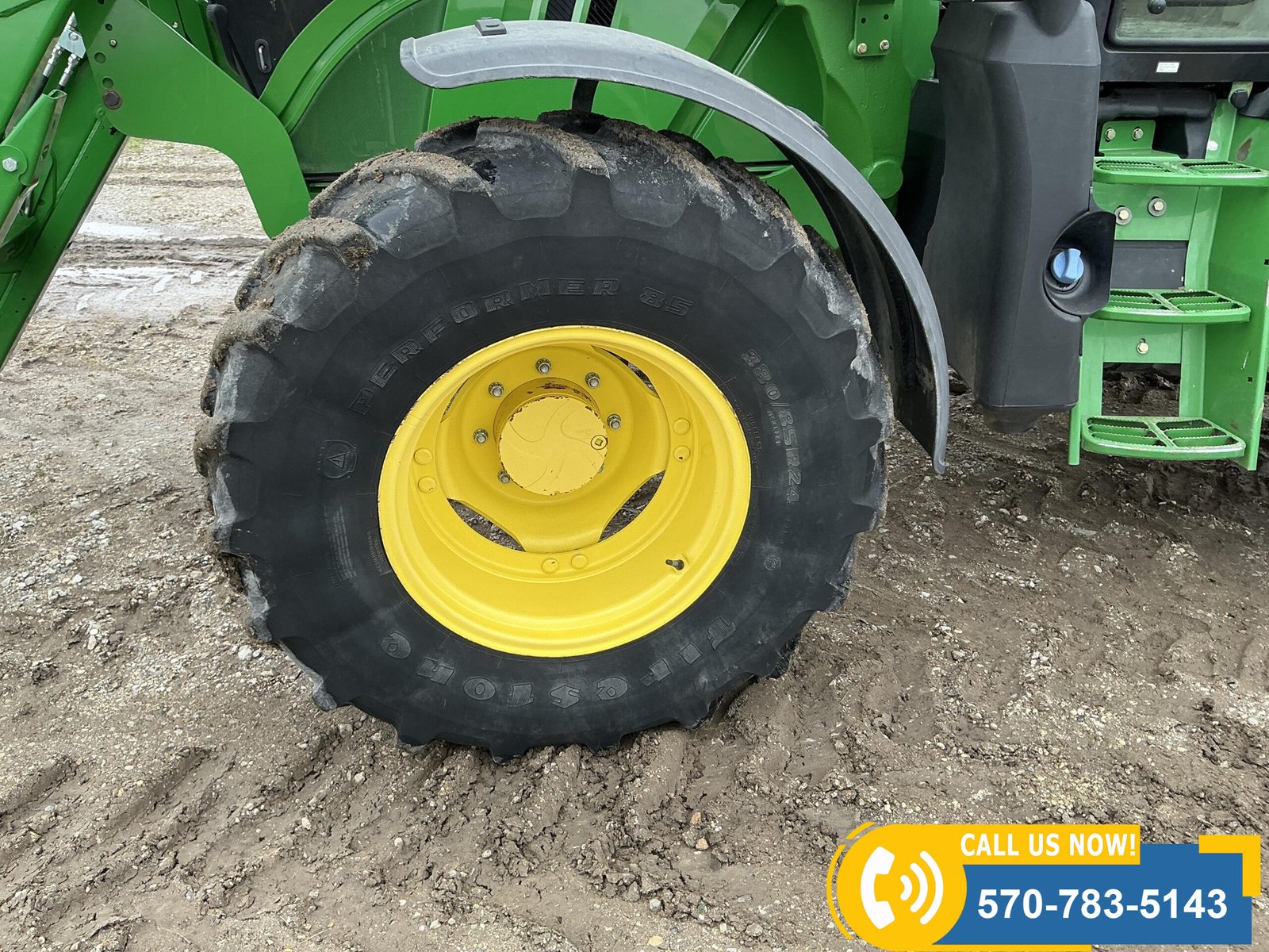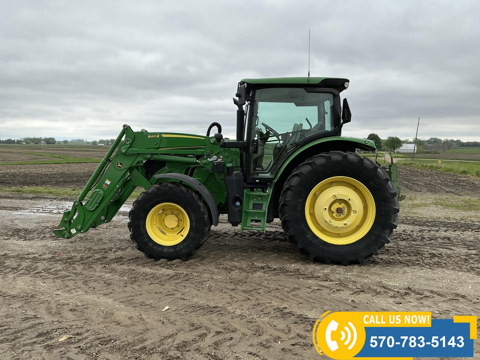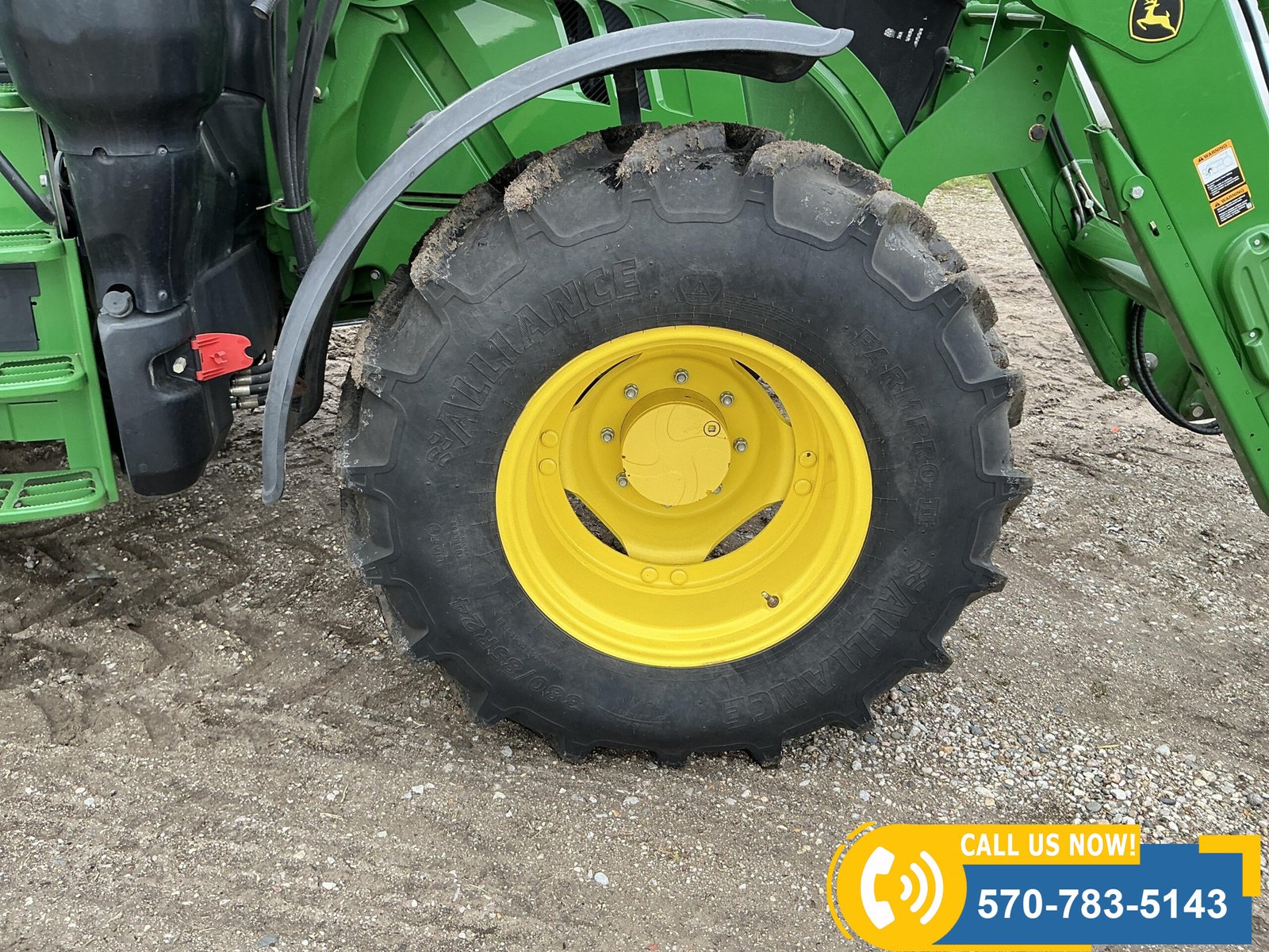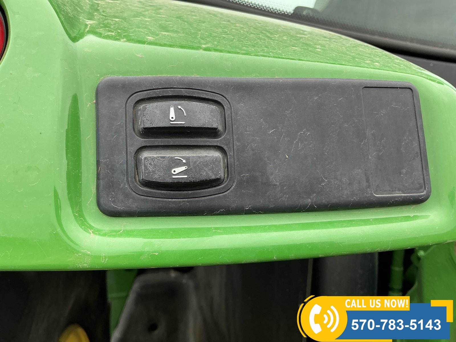 2016 John Deere 6130R MFWD Tractor w/ Loader – 2,563 hours showing, 130 HP John Deere 4.5L 4-cylinder turbo diesel with block heater and AutoQuad Plus Eco 24F/24R transmission. Equipped with 540/small 1000 PTO, rear PTO with fender control, 3 hydraulic outlets, rear fender 3-point hitch control, quick hitch, and differential lock. Features ComfortView cab, AutoTrac readiness, ISOBUS compatibility, hydrostatic power steering, and pressure/flow compensated hydraulics with 32.1 GPM pump flow. Rides on 380/85R24 front and 460/85R38 rear tires with front and rear fenders, rear outer wheel weights, and front/rear locking differential. Includes John Deere 640 quick attach loader with joystick control, single-point hydraulic hookup, front hood/grill guard, 163″ max lift height, and 3,832 lb lift capacity.