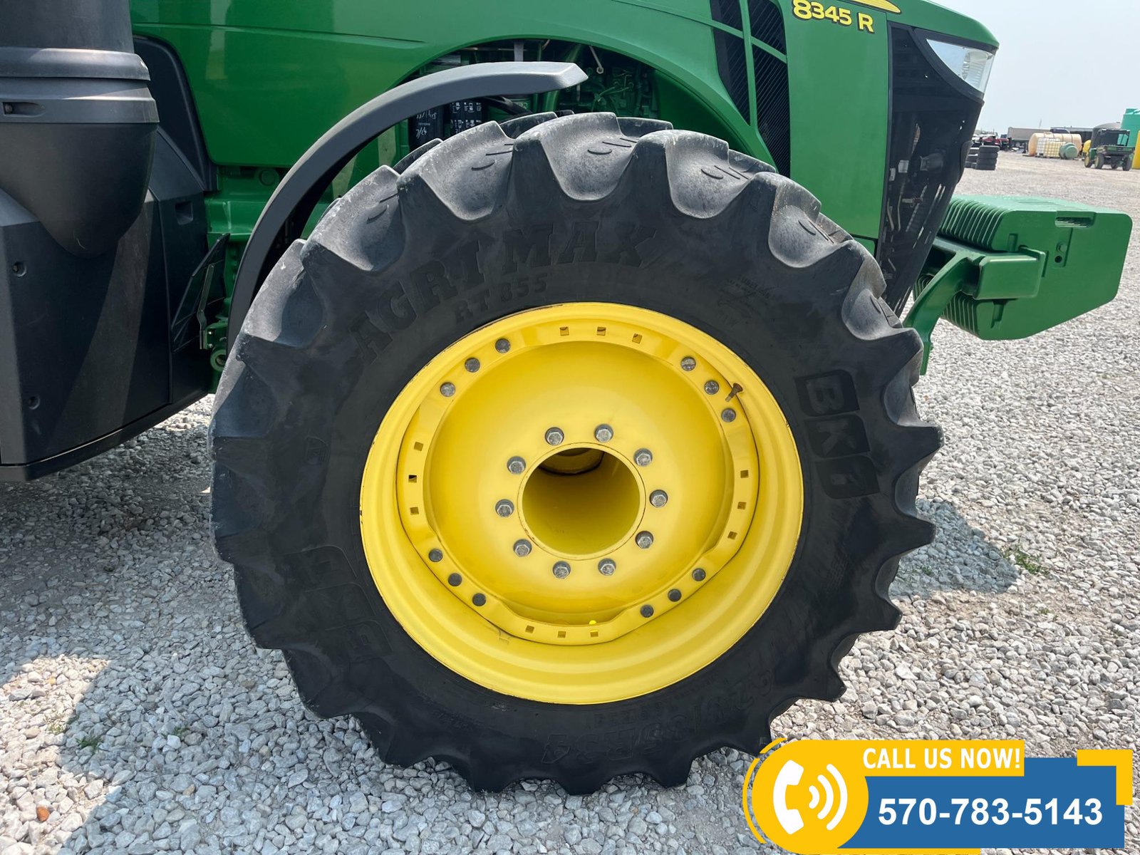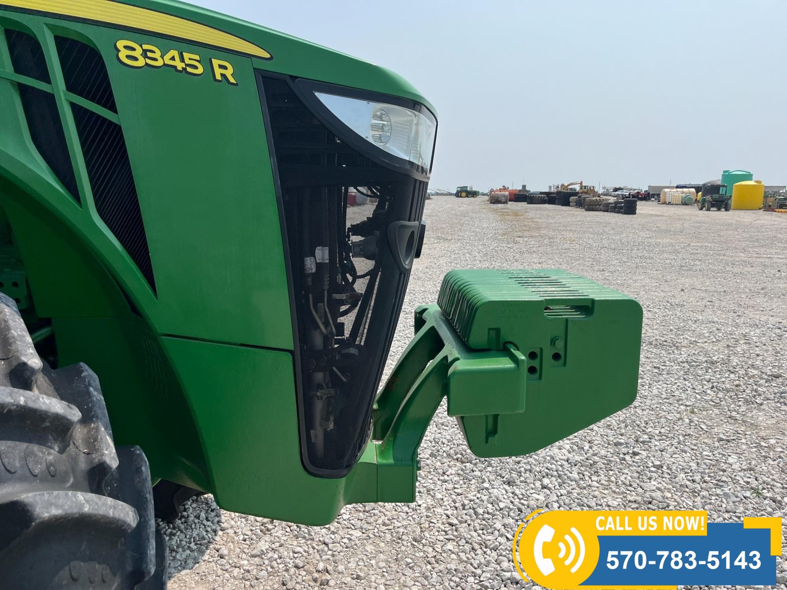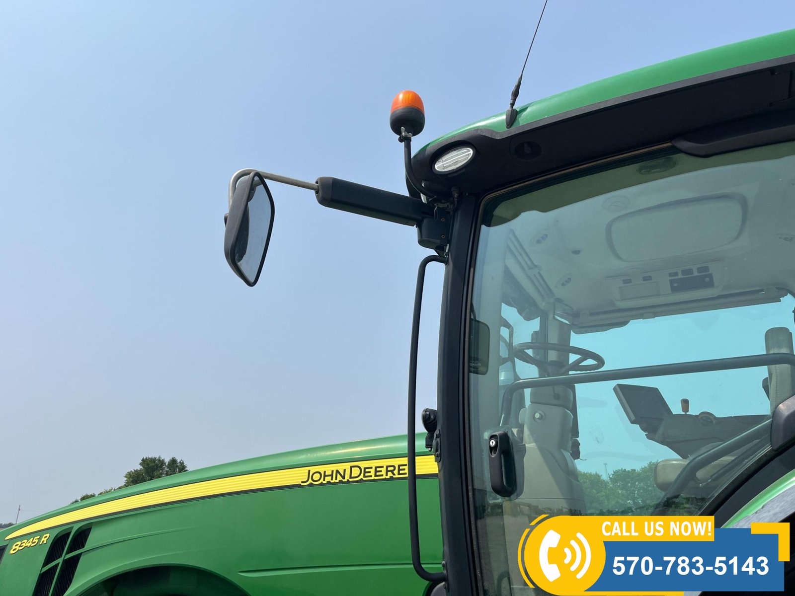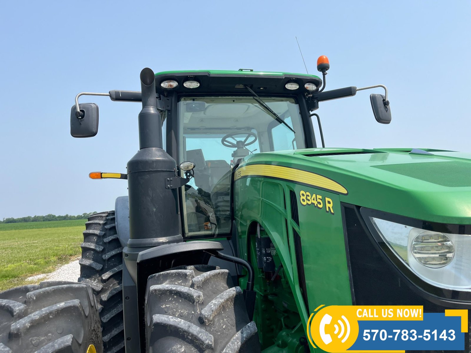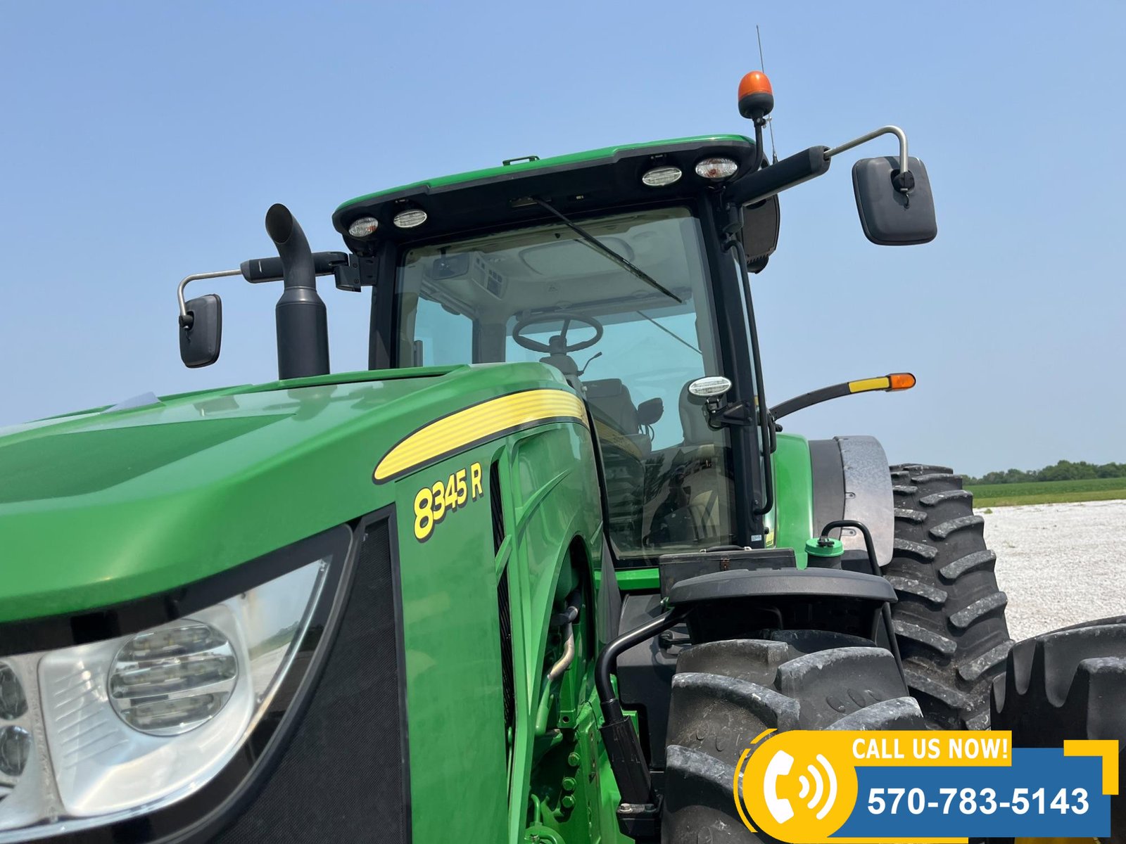 2016 John Deere 8345R MFWD Tractor – 3,453 hours showing, equipped with ILS front suspension, IVT transmission, and premium cab with leather interior. Features 5 hydraulic outlets, 84 GPM dual hydraulic pumps, 1000 PTO, and CommandCenter 10″ display with activations. Rides on 480/80R50 rear duals and 420/85R34 front duals. Includes front and rear fenders, front and rear weights, and premium LED lighting.
