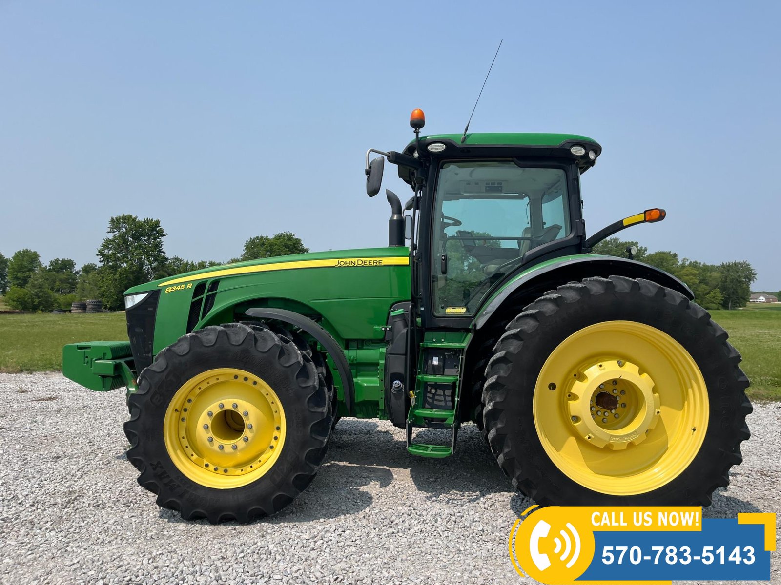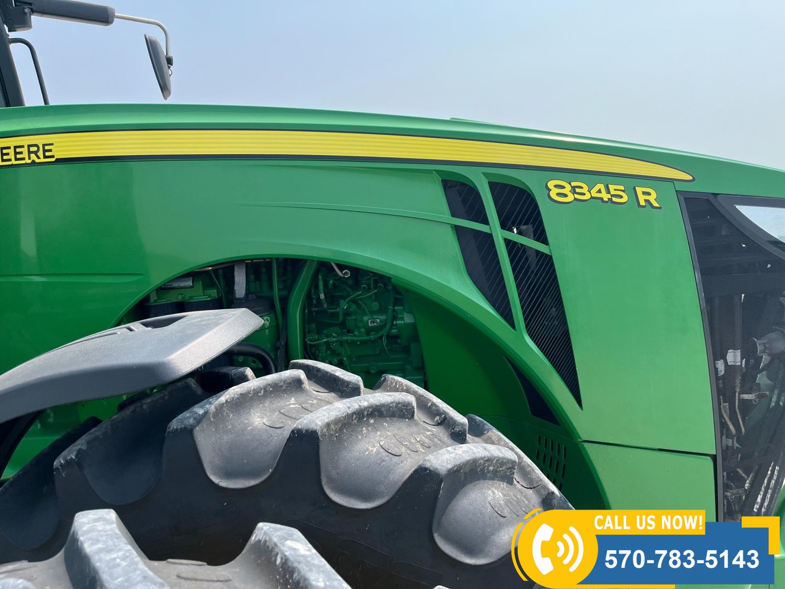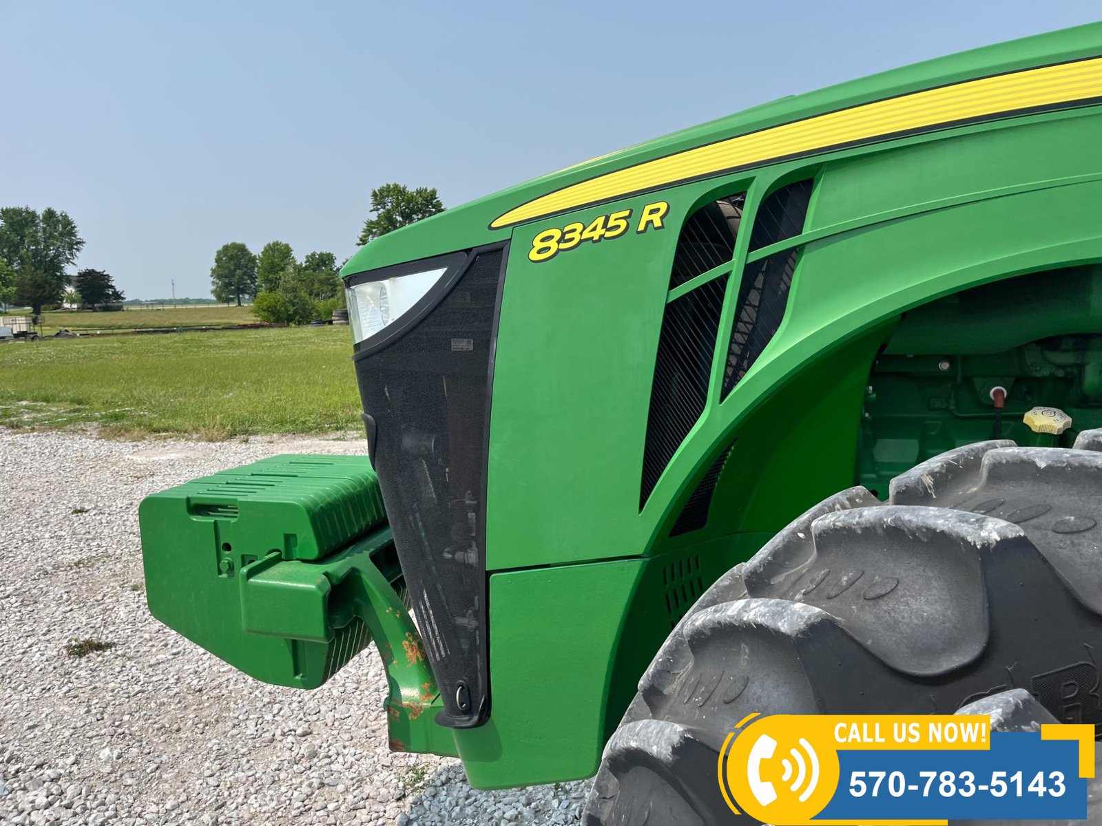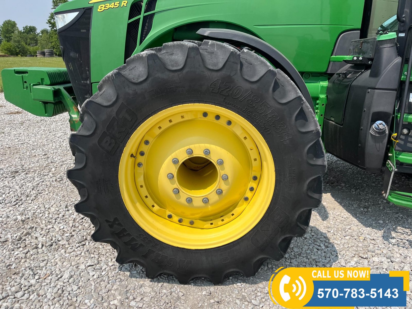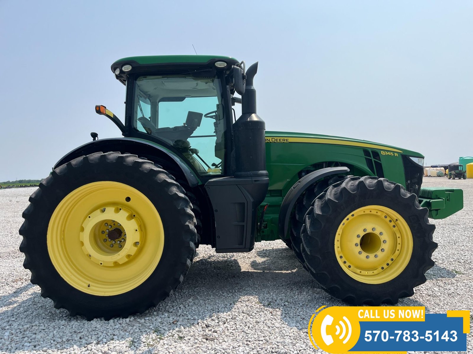 2016 John Deere 8345R MFWD Tractor – 3,453 hours showing, equipped with ILS front suspension, IVT transmission, and premium cab with leather interior. Features 5 hydraulic outlets, 84 GPM dual hydraulic pumps, 1000 PTO, and CommandCenter 10″ display with activations. Rides on 480/80R50 rear duals and 420/85R34 front duals. Includes front and rear fenders, front and rear weights, and premium LED lighting.