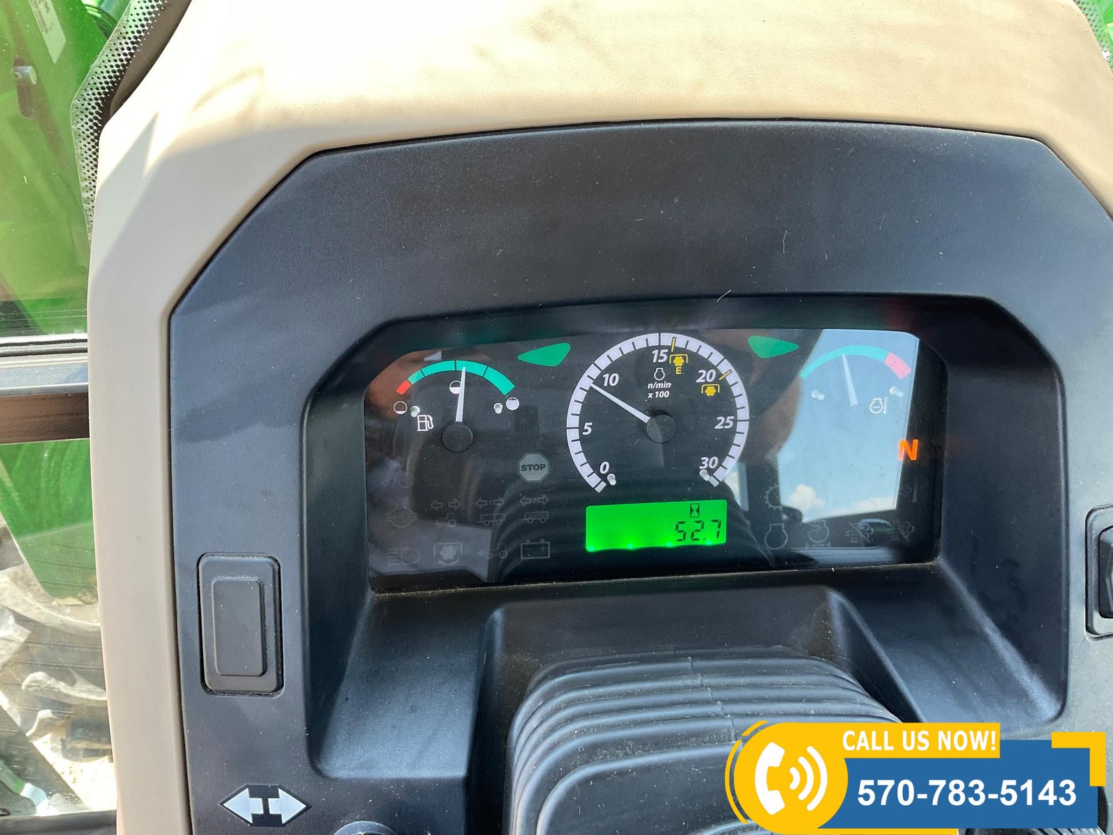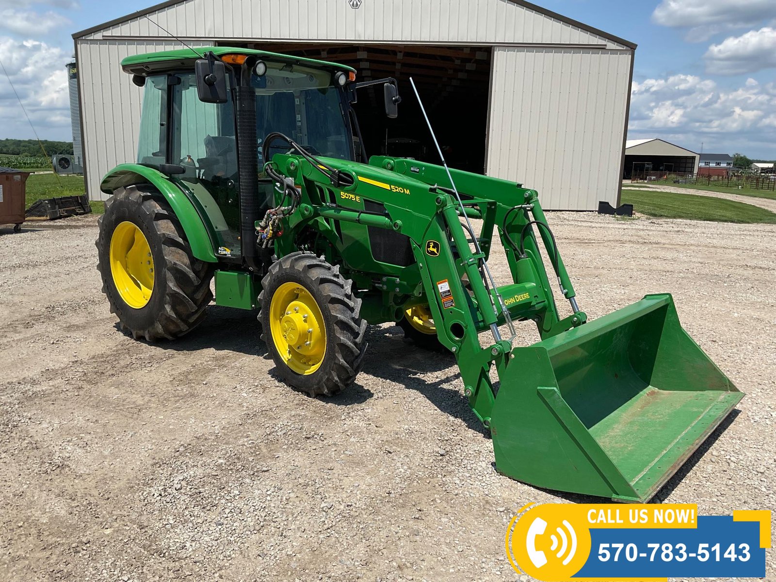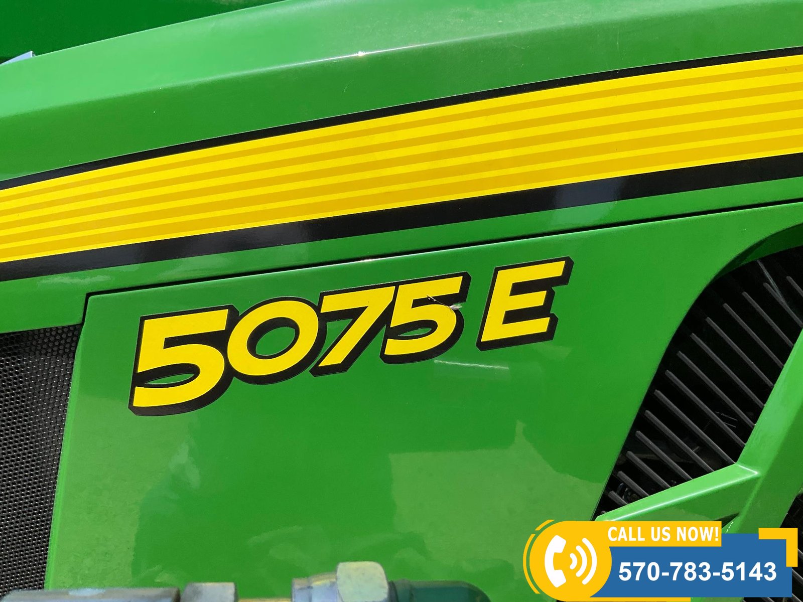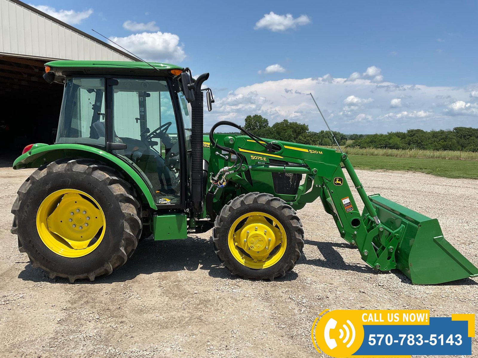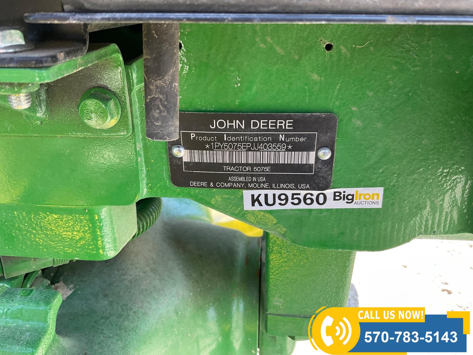 2018 John Deere 5075E MFWD Tractor w/ Loader – Only 52 hours showing, 64 PTO HP PowerTech 2.9L engine, 12F/12R transmission with LH reverser. Equipped with 540 PTO, rear PTO, 1 hydraulic outlet, and 3-point hitch. Rides on 9.5-24 front and 16.9-28 rear tires. Features John Deere 520M front loader with 72″ quick attach bucket, single-point hydraulic hook-up, and standard cloth seat.
