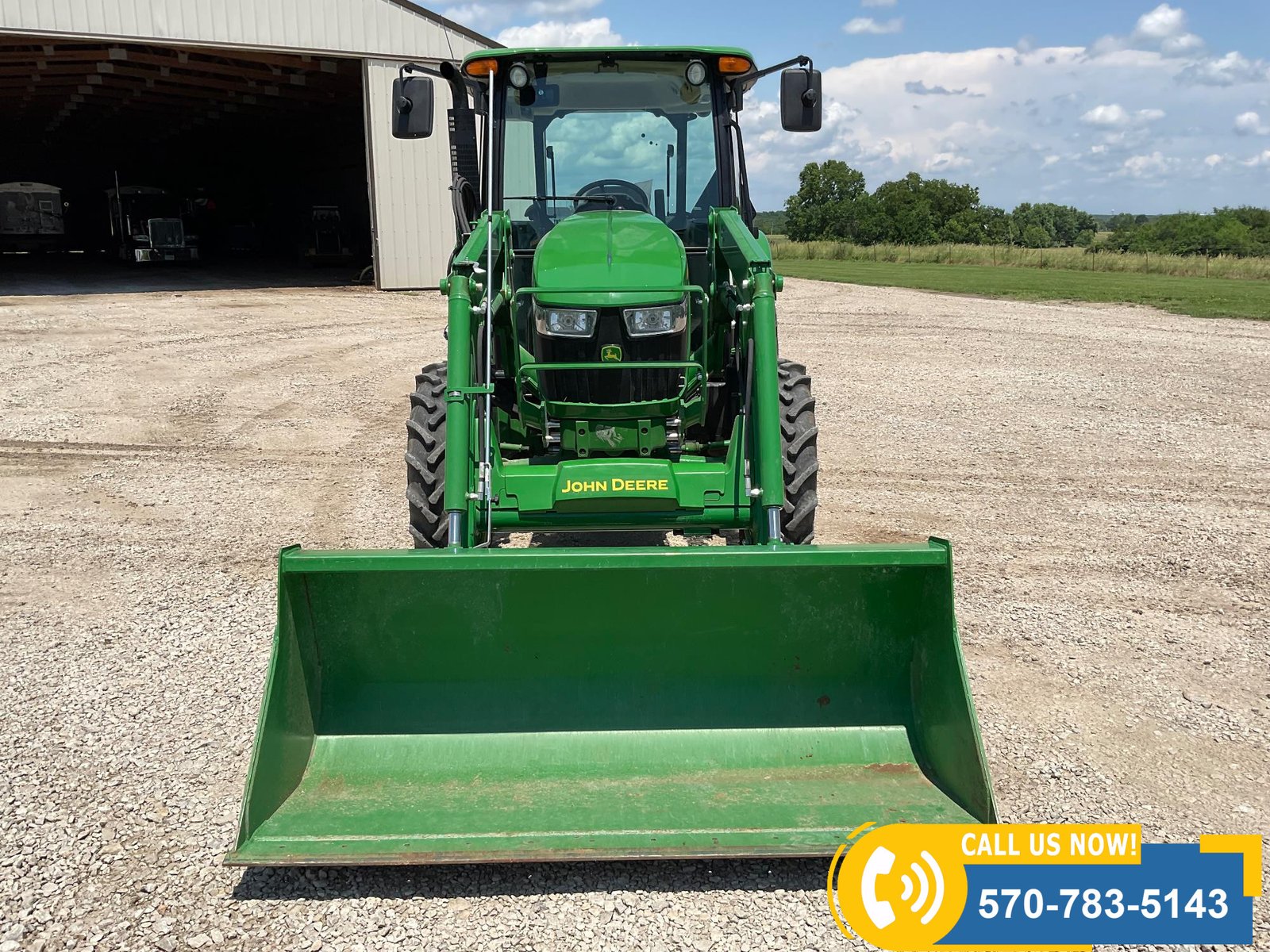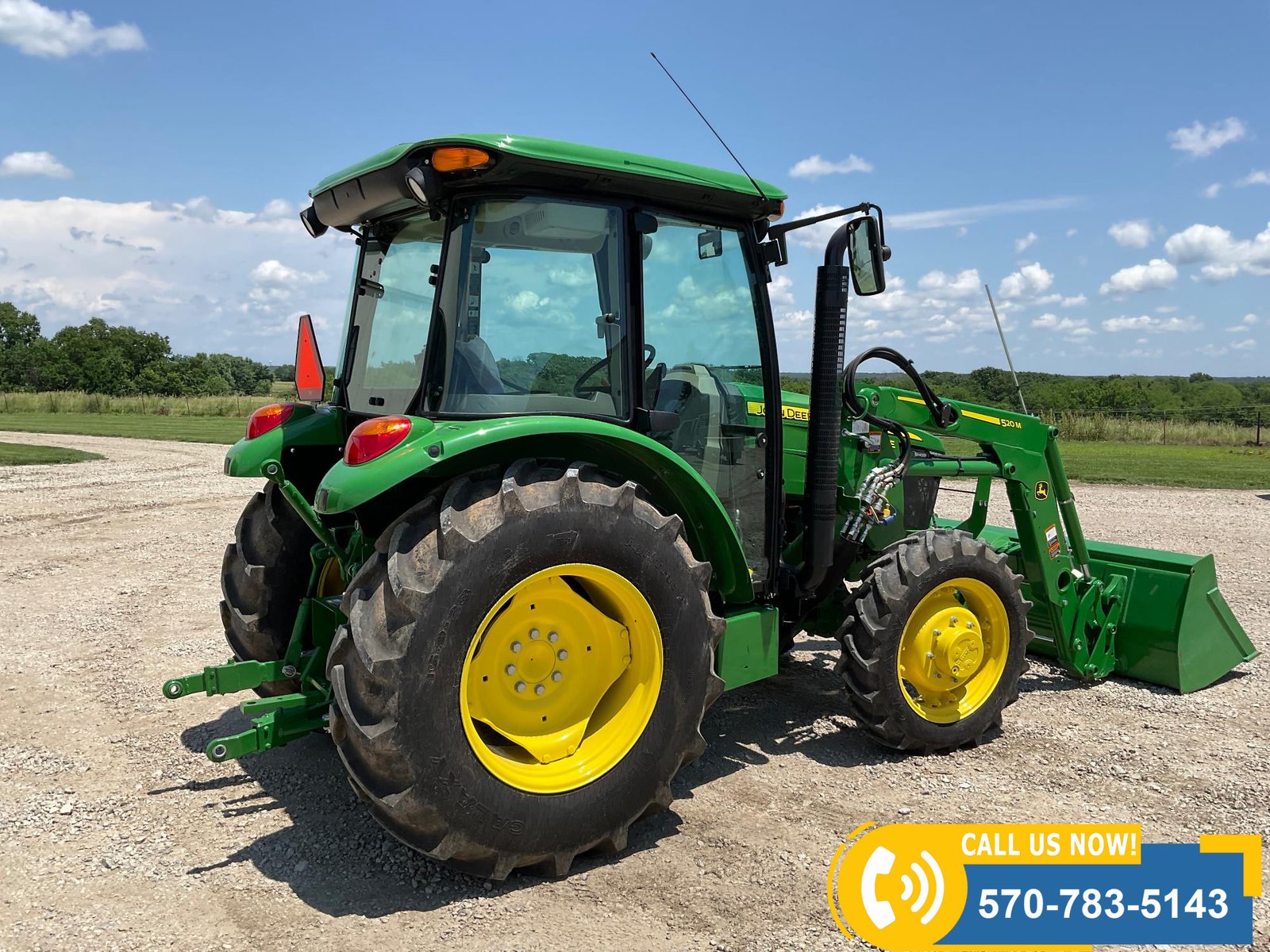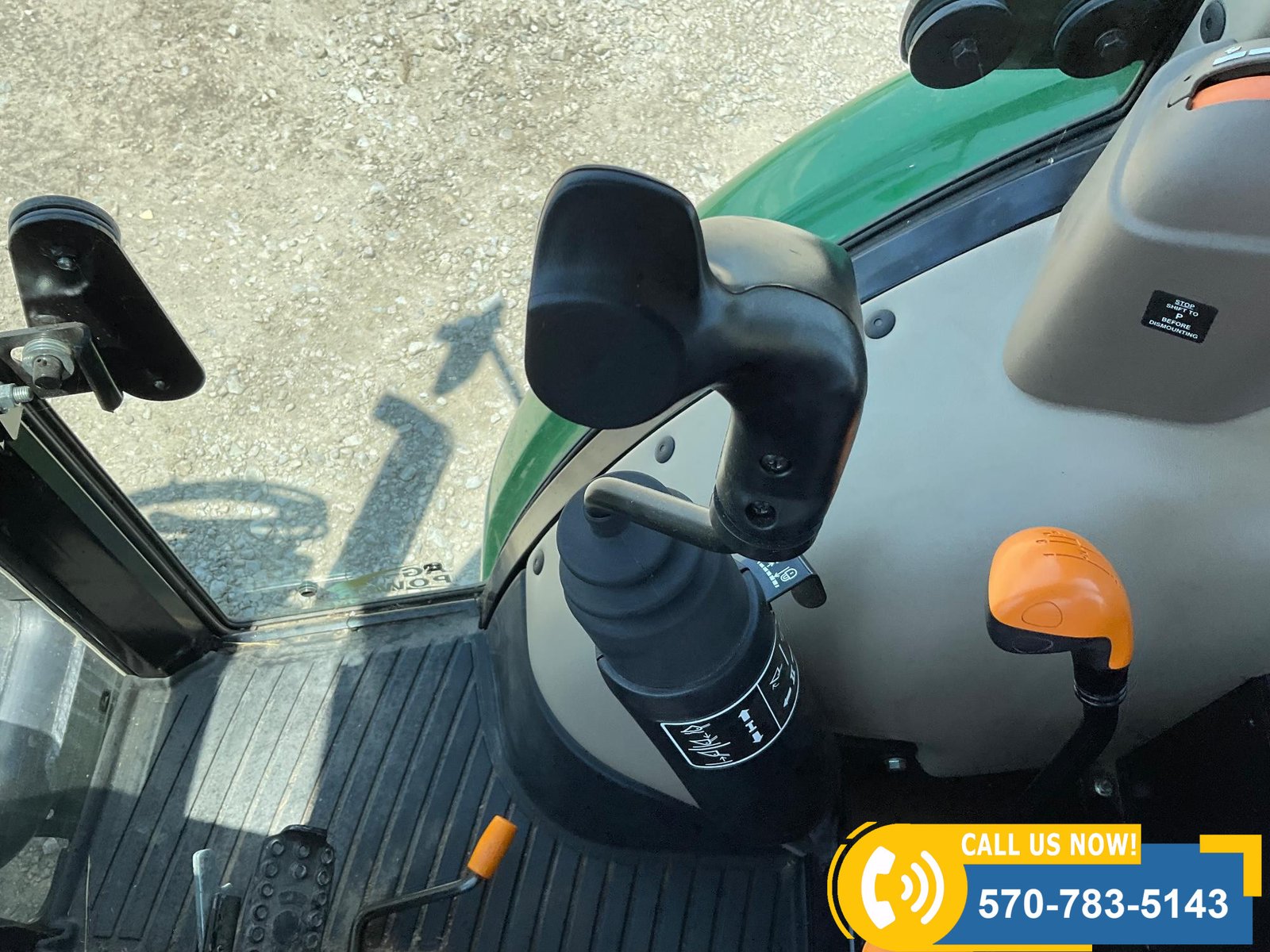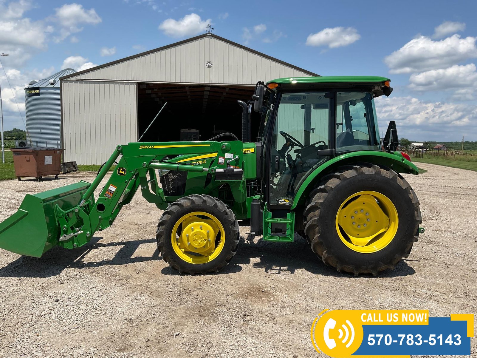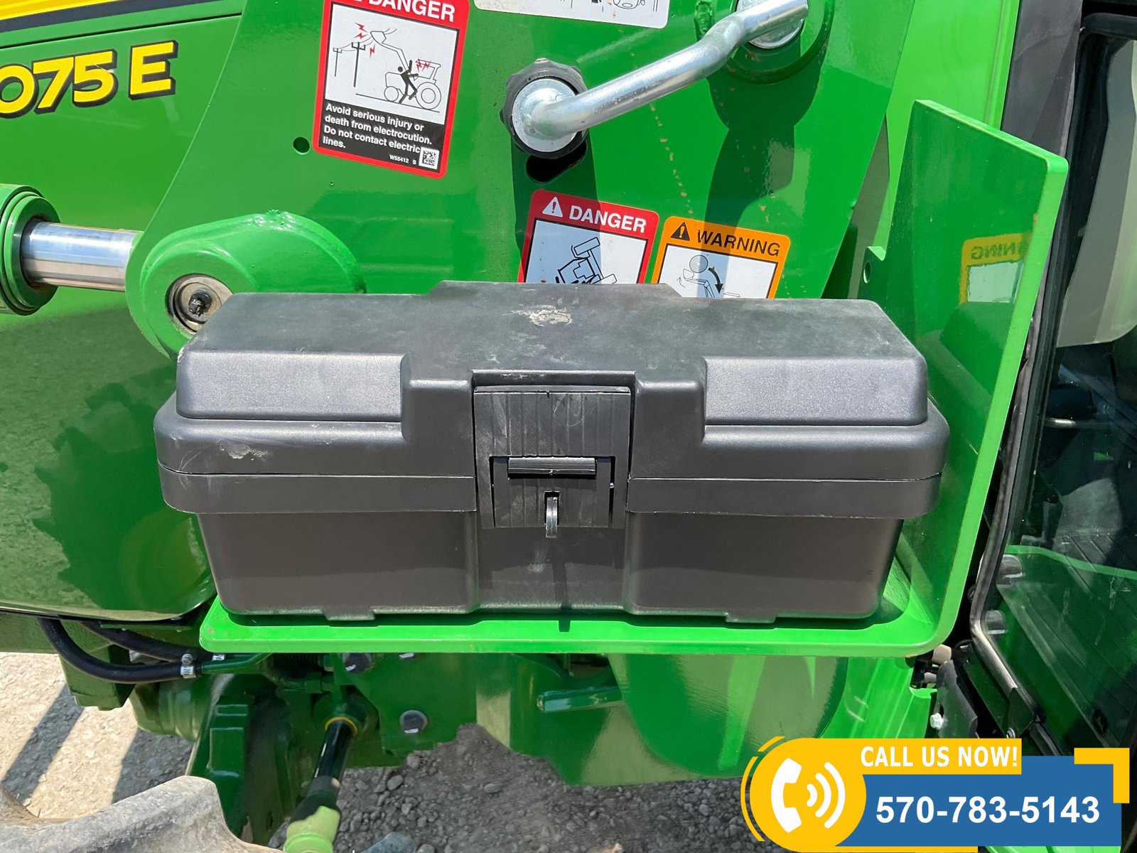 2018 John Deere 5075E MFWD Tractor w/ Loader – Only 52 hours showing, 64 PTO HP PowerTech 2.9L engine, 12F/12R transmission with LH reverser. Equipped with 540 PTO, rear PTO, 1 hydraulic outlet, and 3-point hitch. Rides on 9.5-24 front and 16.9-28 rear tires. Features John Deere 520M front loader with 72″ quick attach bucket, single-point hydraulic hook-up, and standard cloth seat.