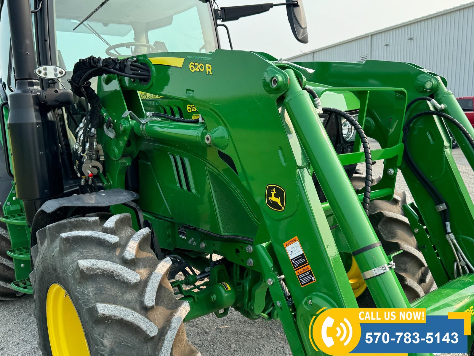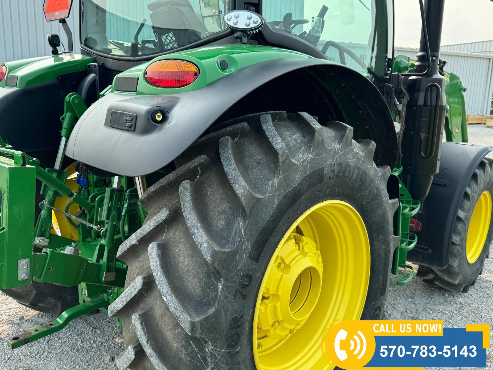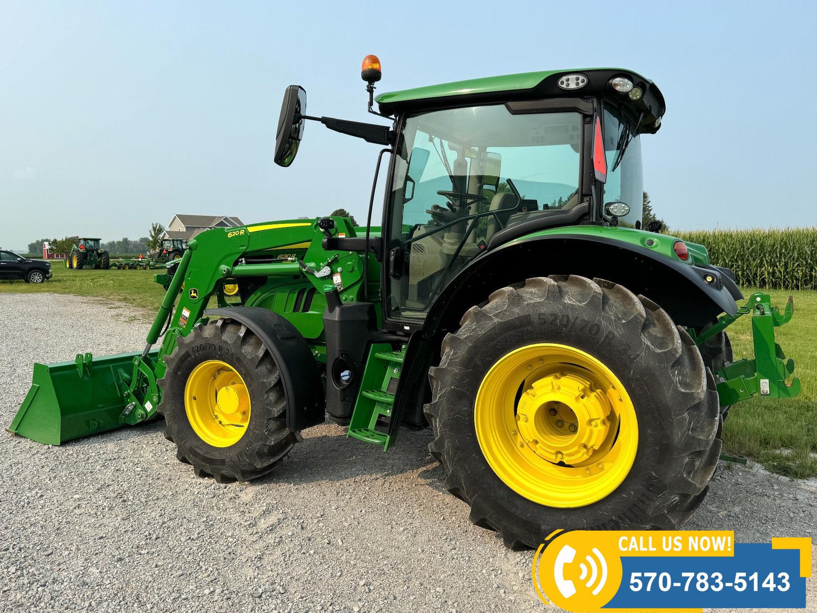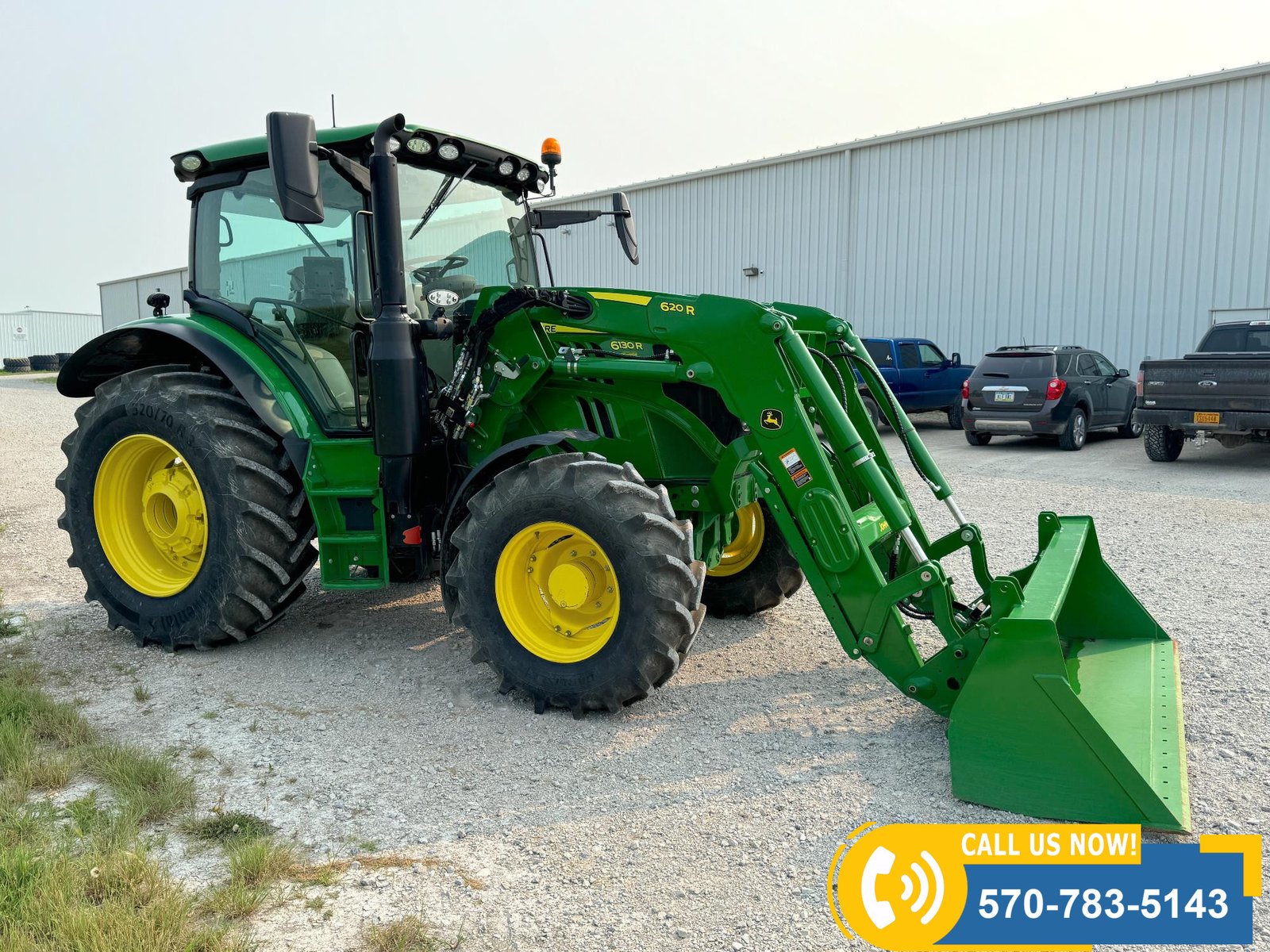 2022 John Deere 6130R MFWD Tractor w/ Loader – 407 hours showing, equipped with IVT transmission, TLS front suspension, and premium cab with leather ultimate seat. Features 3 hydraulic outlets, 540/1000 PTO, John Deere 620R loader with material bucket, global hookup, 3rd function hydraulics, and electronic joystick. Includes CommandCenter 4600 display, premium light package, front fenders, rear weights, and rides on 420/70R24 front and 520/70R34 rear tires.