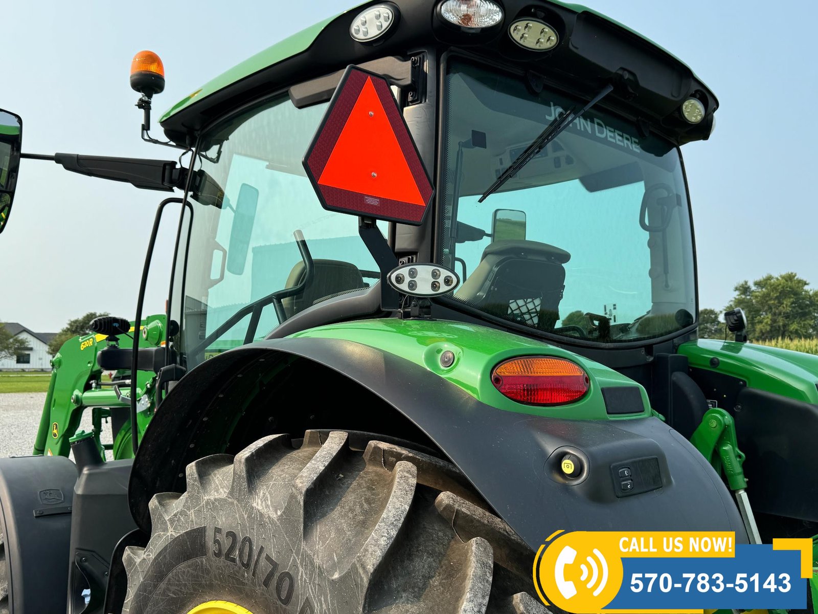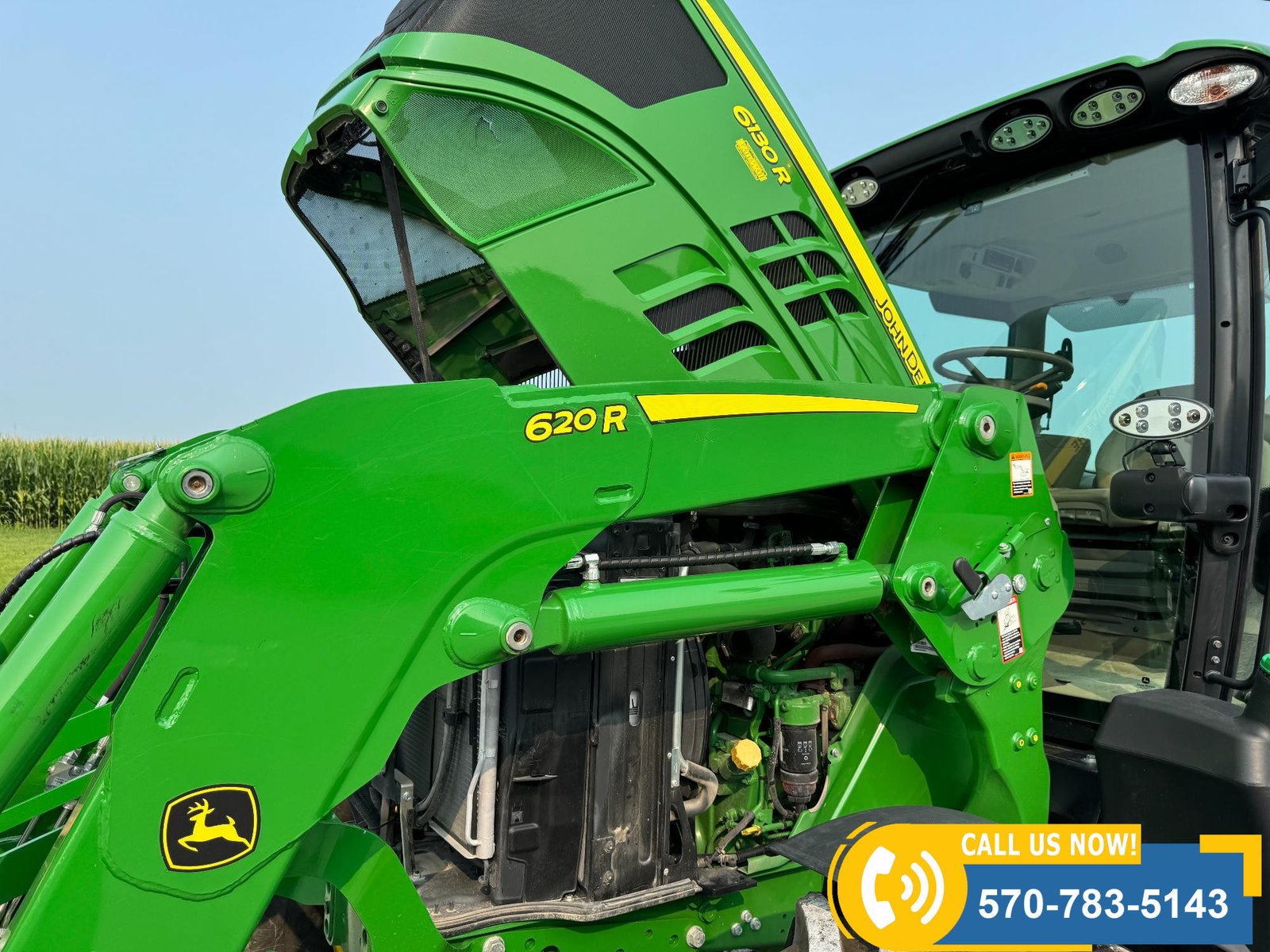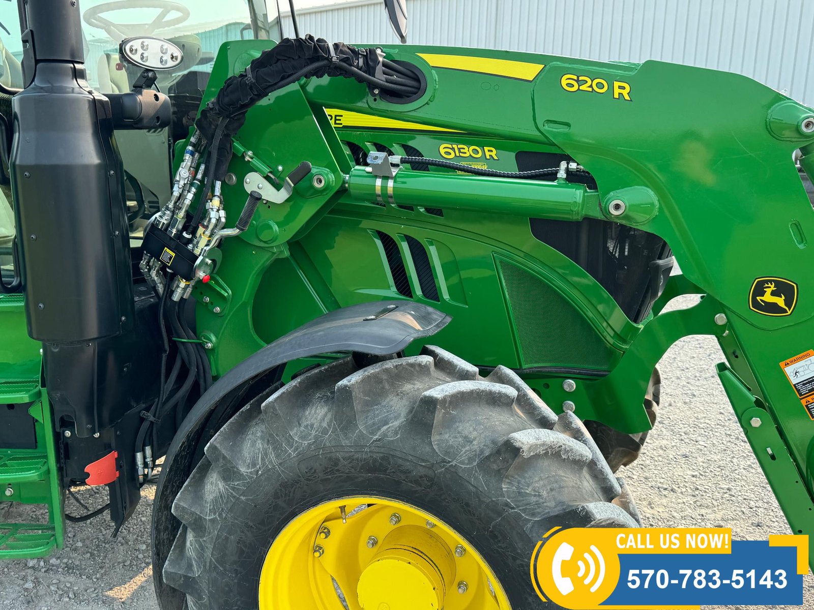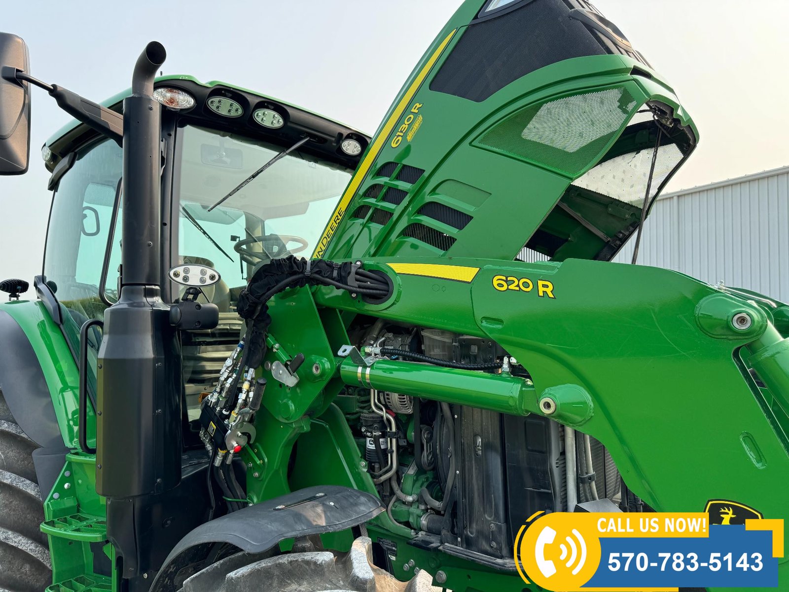 2022 John Deere 6130R MFWD Tractor w/ Loader – 407 hours showing, equipped with IVT transmission, TLS front suspension, and premium cab with leather ultimate seat. Features 3 hydraulic outlets, 540/1000 PTO, John Deere 620R loader with material bucket, global hookup, 3rd function hydraulics, and electronic joystick. Includes CommandCenter 4600 display, premium light package, front fenders, rear weights, and rides on 420/70R24 front and 520/70R34 rear tires.